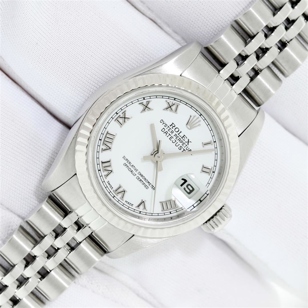 One Quickset Pre Owned Ladies Stainless Steel Rolex Datejust Polished Bright with Satin Finish, Serviced & Electronically Tested, Rolex Stainless Steel Case: 26mm, Rolex Stainless Steel Crown, Rolex Bezel: White Gold Fluted Bezel, Custom Crystal: New Sapphire with Date Window. Custom Hands: New Luminescent Hands. Rolex Movement: Automatic Winding Movement. Rolex Dial: White Roman, Date Window: 3 O'Clock Position Date Display, Model: Quickset 2230 Datejust. Condition: G-6 Extra Fine. Rolex Bracelet: Stainless Steel Jubilee Band. Bright Polish & Satin Finish. 6.0 Inch Length, Adjustable. Standard Clasp, with Rolex Logo. This Watch Has Been Serviced Time Tested And Is In Excellent Condition It Is Free Of All Scratches And Dents.