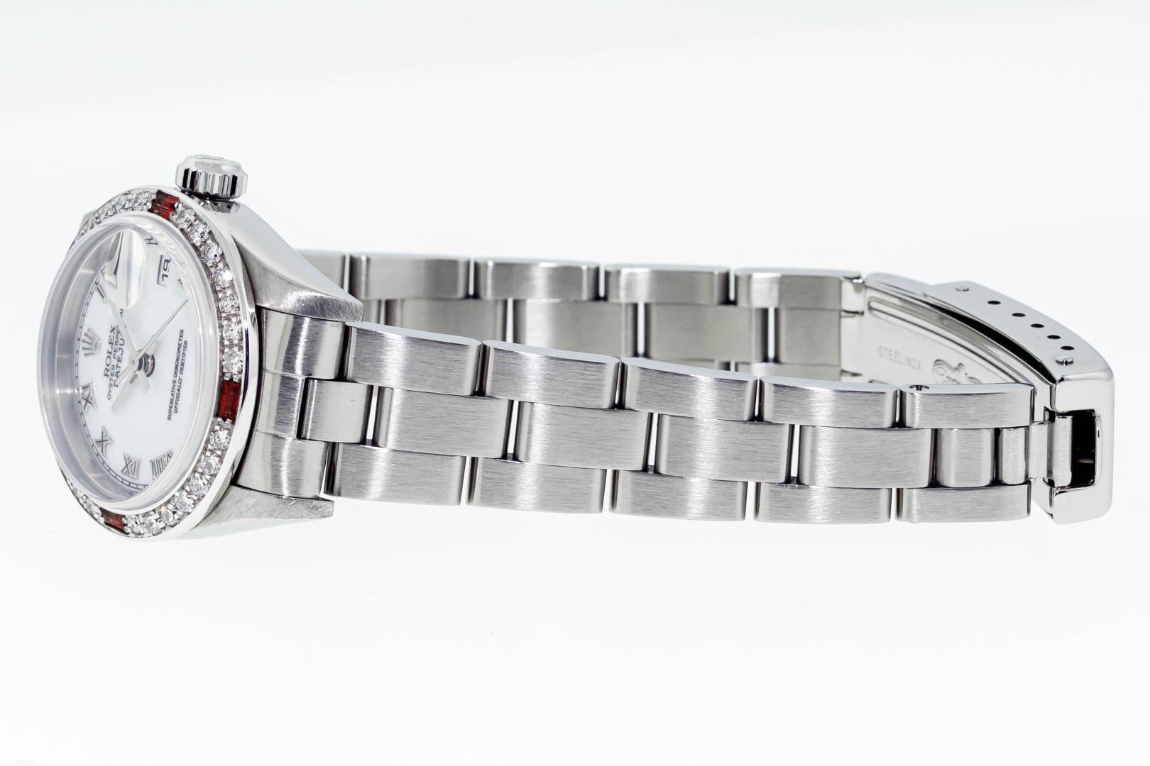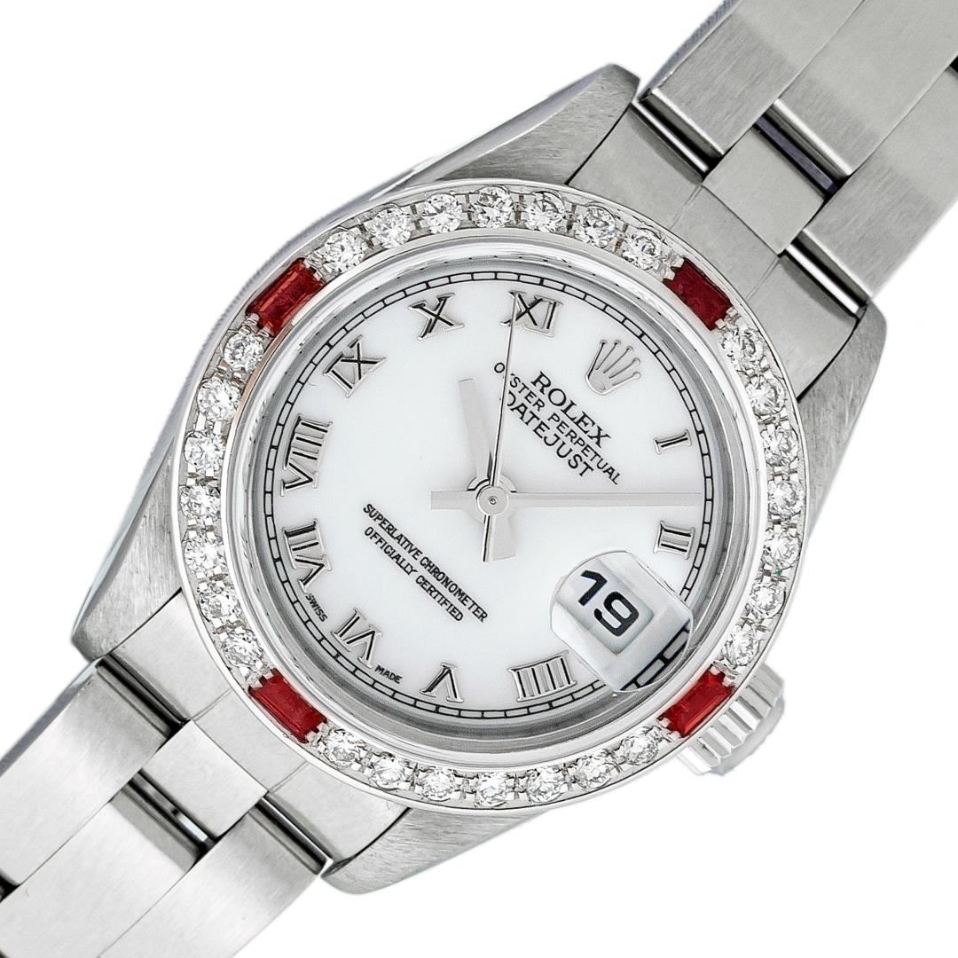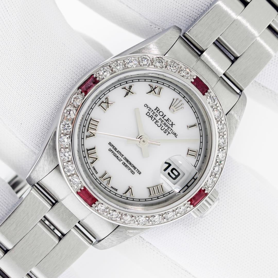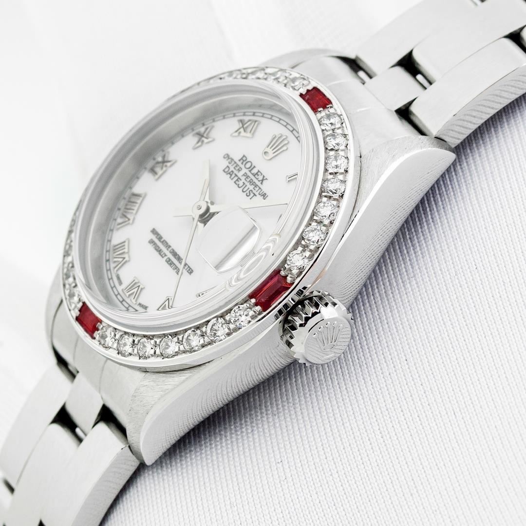 One Ladies Pre Owned Quickset Stainless Steel Rolex Datejust Polished Bright with Satin Finish, Serviced & Electronically Tested, Stainless Steel Case: 26mm, Rolex Stainless Steel Crown, Custom Bezel: New 18K White Gold Ruby Bead Set Diamond Bezel, Diamond + Gem Count: 28 Diamonds + 4 Rubies, Clarity: SI-VS, Color: G to H. Custom Crystal: New Sapphire With Magnified Date Window. Custom Hands: New Hands. Rolex Movement: Automatic Winding Movement 2235. Rolex Dial: White With Roman Hour Markers & Square Track. Date Window: 3 O'Clock Position Date Display, Model: Quickset Datejust. Condition: G-6 Extra Fine. Rolex Bracelet: Stainless Steel Oyster Band. Bright Polish & Satin Finish. 6.0 Inch Length, Adjustable. Standard Clasp, With Rolex Logo. This Watch Has Been Serviced Time Tested And Is In Excellent Condition It Is Free Of All Scratches And Dents.
