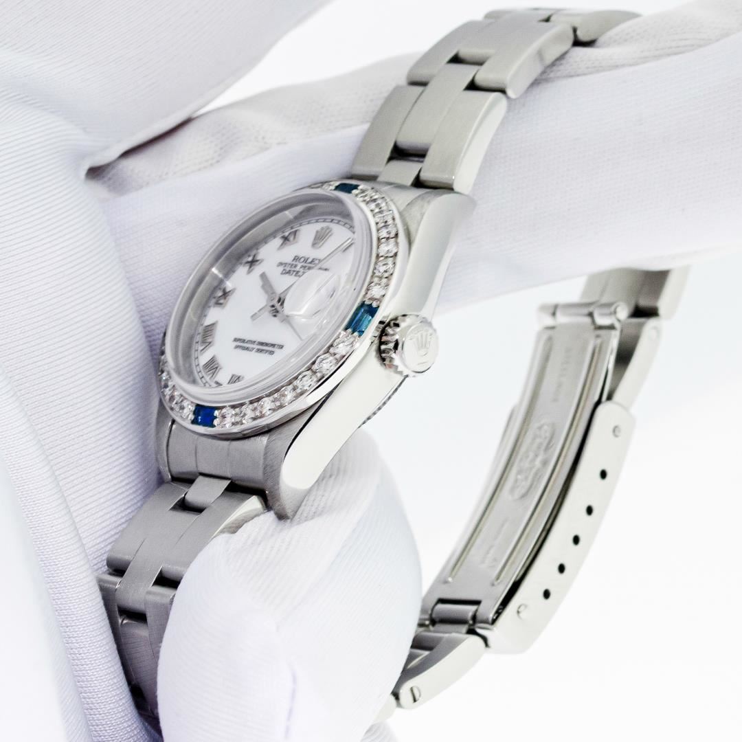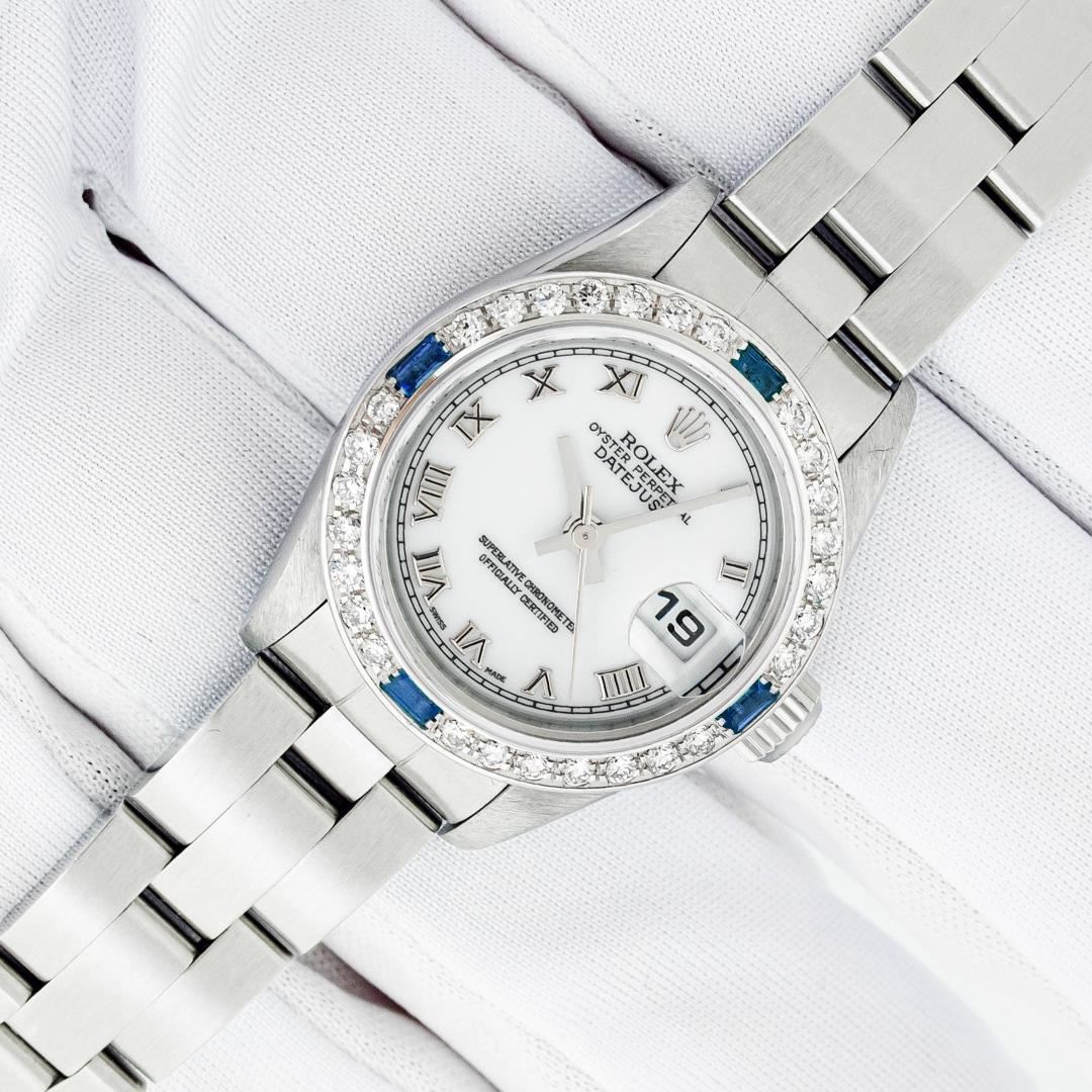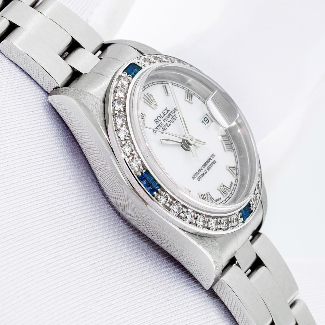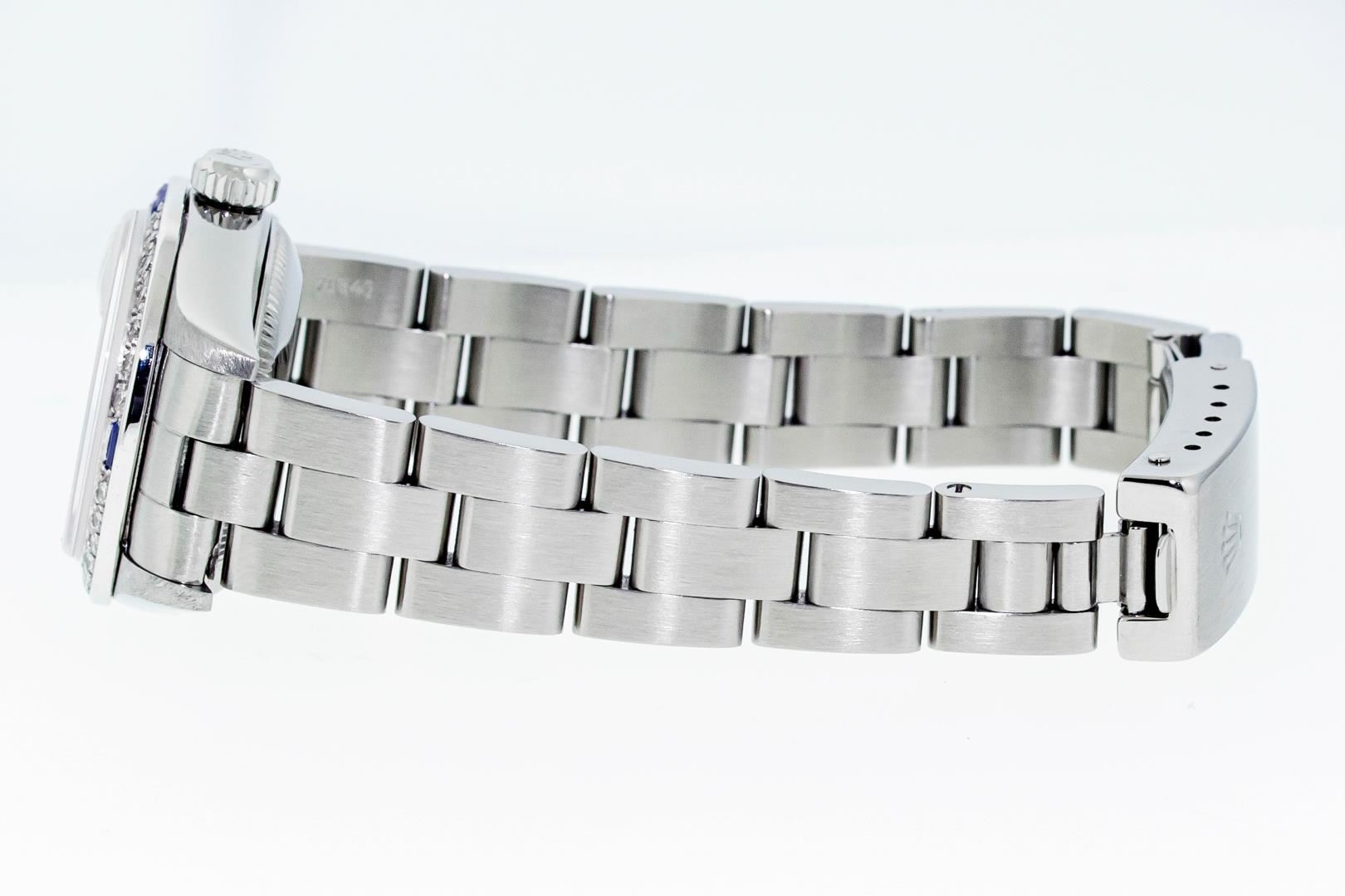 One Ladies Pre Owned Quickset Stainless Steel Rolex Datejust Polished Bright with Satin Finish, Serviced & Electronically Tested, Stainless Steel Case: 26mm, Rolex Stainless Steel Crown, Custom Bezel: New 18K White Gold Sapphire Bead Set Diamond Bezel, Diamond + Gem Count: 28 Diamonds + 4 Sapphires, Clarity: SI-VS, Color: G to H. Custom Crystal: New Sapphire With Magnified Date Window. Custom Hands: New Hands. Rolex Movement: Automatic Winding Movement 2235. Rolex Dial: White With Roman Hour Markers & Square Track. Date Window: 3 O'Clock Position Date Display, Model: Quickset Datejust. Condition: G-6 Extra Fine. Rolex Bracelet: Stainless Steel Oyster Band. Bright Polish & Satin Finish. 6.0 Inch Length, Adjustable. Standard Clasp, With Rolex Logo. This Watch Has Been Serviced Time Tested And Is In Excellent Condition It Is Free Of All Scratches And Dents.