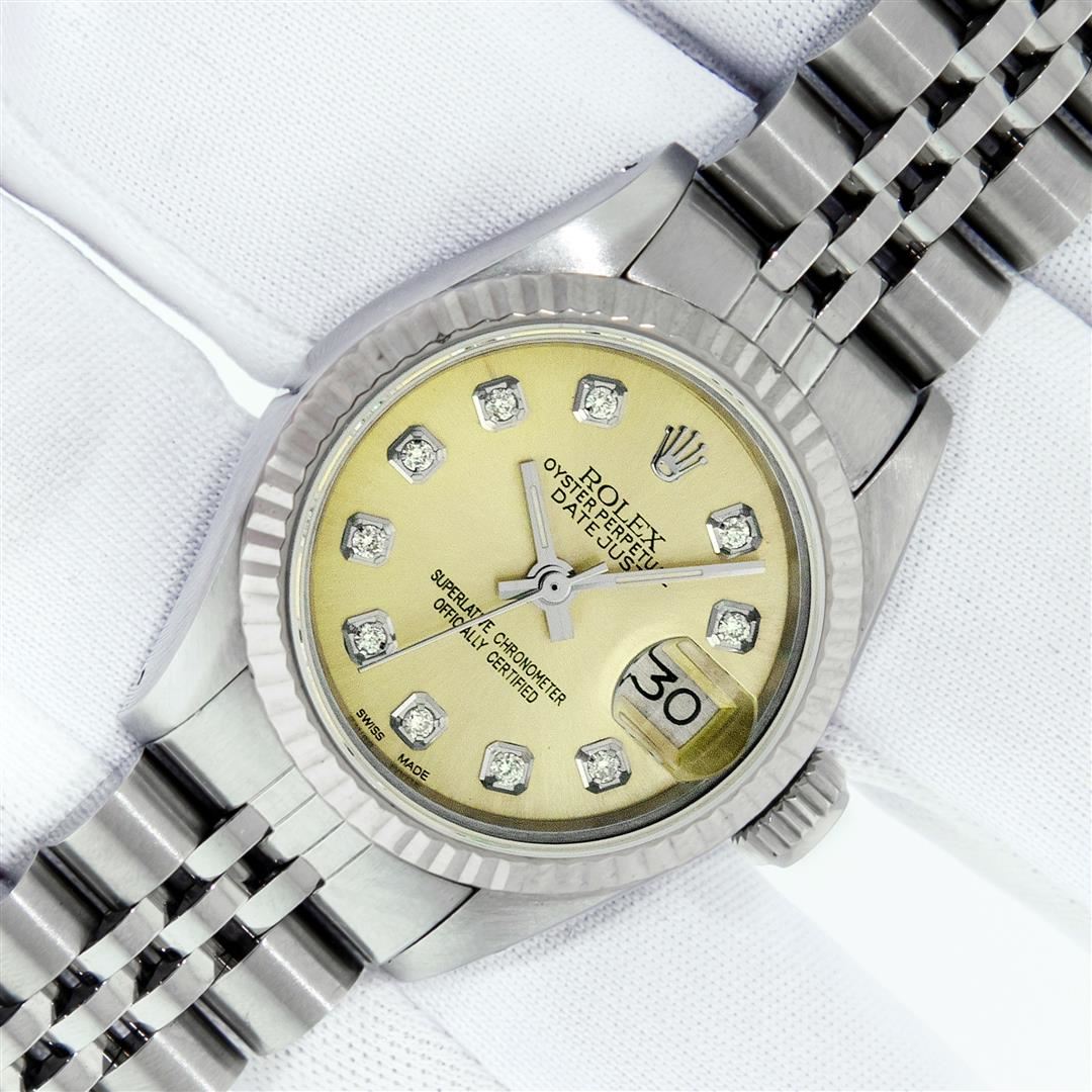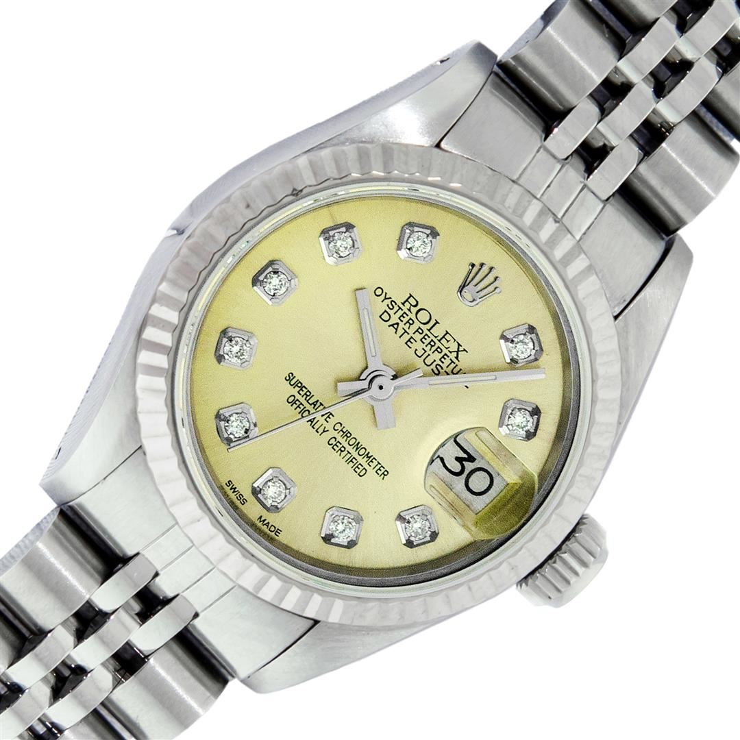 One Ladies Pre Owned Stainless Steel Rolex Datejust Polished Bright with Satin Finish, Serviced & Electronically Tested, Rolex Stainless Steel Case: 26mm, Rolex Stainless Steel Crown, Rolex Bezel: 14K White Gold Bezel. Custom Crystal: New Plastic With Date Window. Custom Hands: New Luminescent Hands. Rolex Movement: Automatic Winding Movement. Custom Dial: Refinished To Yellow With Custom Added Diamonds, Diamond Count: 10 Diamonds In Dial, Color: G to H, Clarity: SI-VS. Date Window: 3 O'Clock Position Date Display, Model: Datejust. Condition: G-6 Extra Fine. Rolex Bracelet: Stainless Steel Jubilee Band. Bright Polish & Satin Finish. 6.0 Inch Length, Adjustable. Standard Clasp, With Rolex Logo. This Watch Has Been Serviced Time Tested And Is In Excellent Condition It Is Free Of All Scratches And Dents.