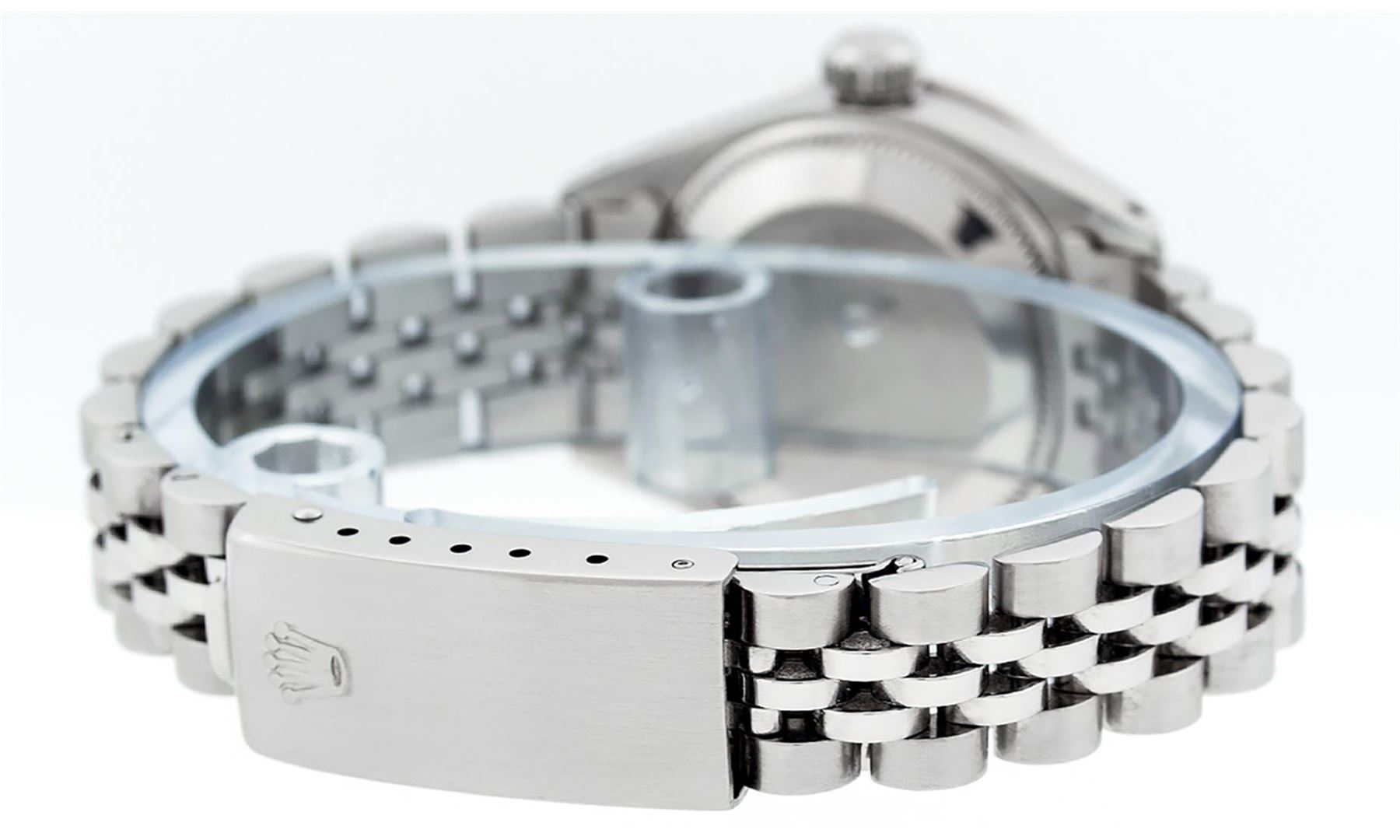One Ladies Stainless Steel Rolex Datejust Polished Bright with Satin Finish, Serviced & Electronically Tested, Stainless Steel Case: 26mm, Stainless Steel Crown, Custom Bezel: New 18K White Gold Emerald Beadset Diamond Bezel, Diamond + Gem Count: 28 Diamonds + 4 Emeralds. Total Weight .70 Carat, Clarity: SI-VS, Color: G to H. Custom Crystal: New Scratch Resistant Synthetic Sapphire Cyclops Lens. Custom Hands: New Luminescent Hands. Movement: Automatic Winding Movement Caliber 2030. Custom Dial: Refinished Yellow With Diamond Hour Markers & Dash Tracks, 10 Diamonds in Dial, G To H In Color, Clarity: SI-VS. Date Window: 3 O'Clock Position Date Display, Model: Datejust. Condition: G-6 Extra Fine. Bracelet: Stainless Steel Jubilee Band. Bright Polish & Satin Finish. 6.0 Inch Length, Adjustable. Standard Clasp, With Rolex Logo. This Watch Has Been Serviced Time Tested And Is In Excellent Condition It Is Free Of All Scratches And Dents.