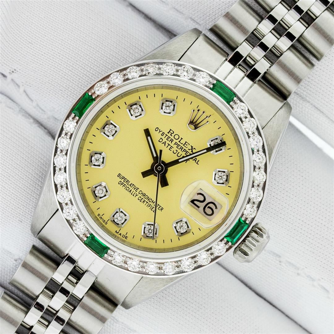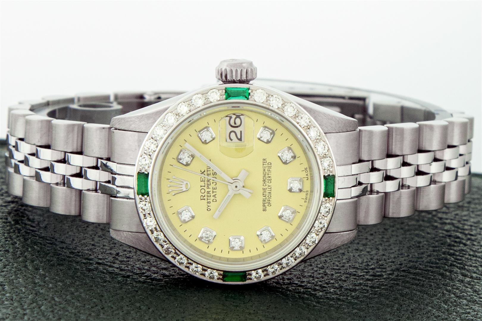 One Ladies Stainless Steel Rolex Datejust Polished Bright with Satin Finish, Serviced & Electronically Tested, Rolex Stainless Steel Case: 26mm, Rolex Stainless Steel Crown, Custom Bezel: New 18K White Gold Emerald Beadset Diamond Bezel, Diamond + Gem Count: 28 Diamonds + 4 Emeralds. Total Weight .70 Carat, Clarity: SI-VS, Color: G to H. Custom Crystal: New Sapphire With Magnified Date Window. Custom Hands: New Luminescent Hands. Rolex Movement: Automatic Winding Movement. Custom Dial: Refinished To Yellow With Custom Added Diamonds, 10 Diamonds in Dial, G To H In Color, Clarity: SI-VS. Date Window: 3 O'clock Position Date Display, Model: Datejust. Condition: G-6 Extra Fine. Rolex Bracelet: Stainless Steel Jubilee Band. Bright Polish & Satin Finish. 6.0 Inch Length, Adjustable. Standard Clasp, With Rolex Logo. This Pre Owned Watch Has Been Serviced Time Tested And Is In Excellent Condition It Is Free Of All Scratches And Dents. This Watch Comes With A Rolex Box.