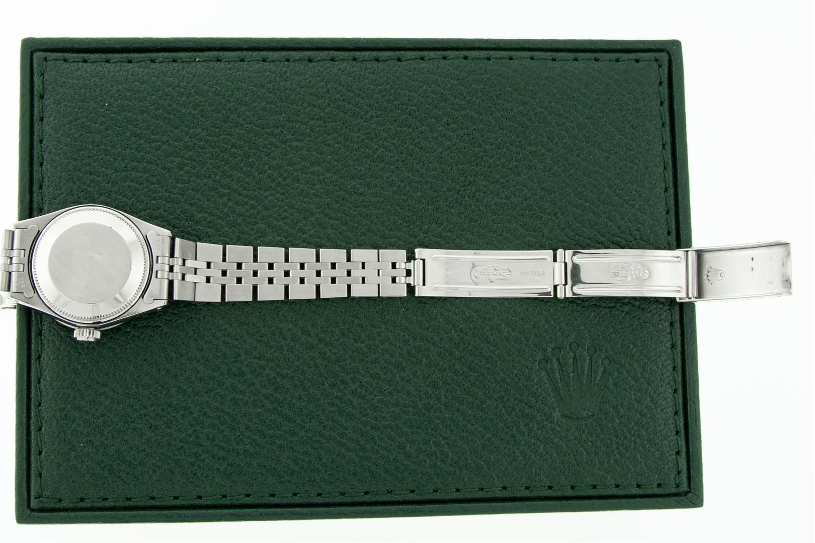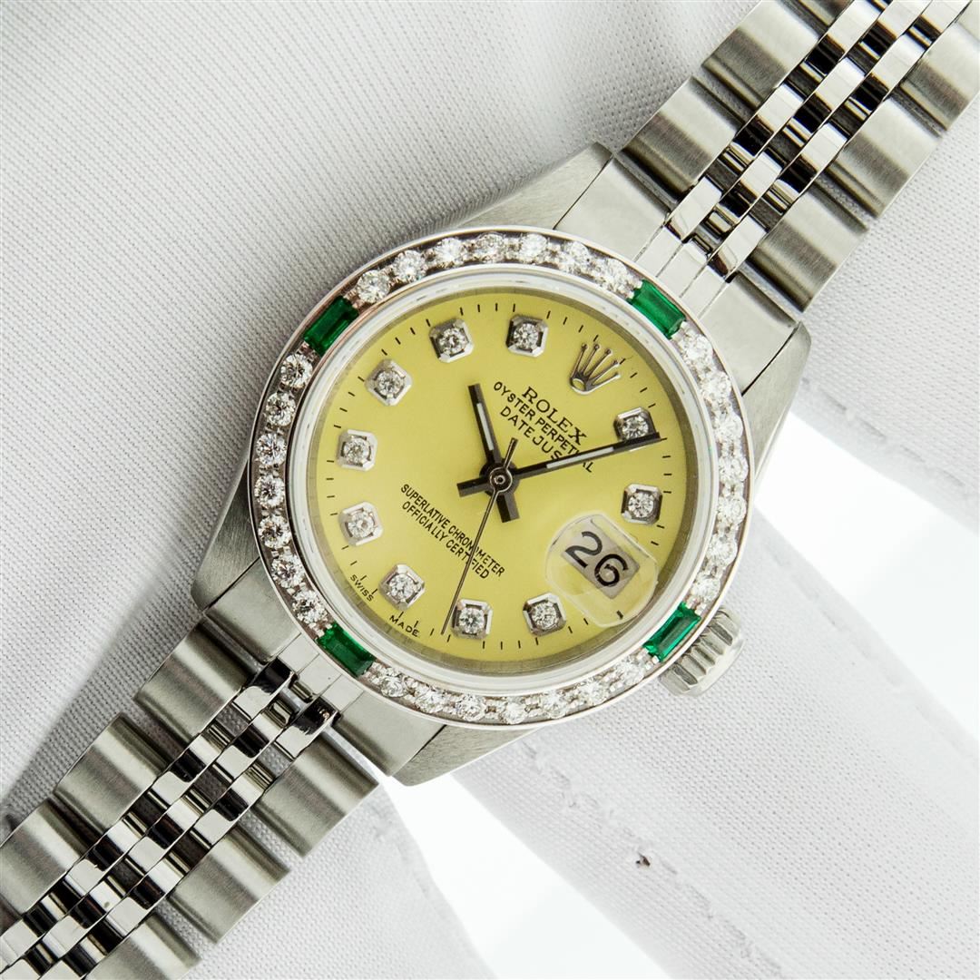 One Ladies Stainless Steel Rolex Datejust Polished Bright with Satin Finish, Serviced & Electronically Tested, Rolex Stainless Steel Case: 26mm, Rolex Stainless Steel Crown, Custom Bezel: New 18K White Gold Emerald Beadset Diamond Bezel, Diamond + Gem Count: 28 Diamonds + 4 Emeralds. Total Weight .70 Carat, Clarity: SI-VS, Color: G to H. Custom Crystal: New Sapphire With Magnified Date Window. Custom Hands: New Luminescent Hands. Rolex Movement: Automatic Winding Movement. Custom Dial: Refinished To Yellow With Custom Added Diamonds, 10 Diamonds in Dial, G To H In Color, Clarity: SI-VS. Date Window: 3 O'clock Position Date Display, Model: Datejust. Condition: G-6 Extra Fine. Rolex Bracelet: Stainless Steel Jubilee Band. Bright Polish & Satin Finish. 6.0 Inch Length, Adjustable. Standard Clasp, With Rolex Logo. This Pre Owned Watch Has Been Serviced Time Tested And Is In Excellent Condition It Is Free Of All Scratches And Dents. This Watch Comes With A Rolex Box.