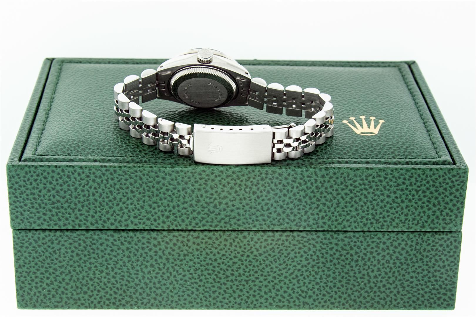 One Ladies Stainless Steel Rolex Datejust Polished Bright with Satin Finish, Serviced & Electronically Tested, Rolex Stainless Steel Case: 26mm, Rolex Stainless Steel Crown, Custom Bezel: New 18K White Gold Ruby Beadset Diamond Bezel, Diamond + Gem Count: 28 Diamonds + 4 Rubies. Total Weight .70 Carat, Clarity: SI-VS, Color: G to H. Custom Crystal: New Sapphire With Magnified Date Window. Custom Hands: New Luminescent Hands. Rolex Movement: Automatic Winding Movement. Custom Dial: Refinished To Yellow With Custom Added Diamonds, 10 Diamonds in Dial, G To H In Color, Clarity: SI-VS. Date Window: 3 O'clock Position Date Display, Model: Datejust. Condition: G-6 Extra Fine. Rolex Bracelet: Stainless Steel Jubilee Band. Bright Polish & Satin Finish. 6.0 Inch Length, Adjustable. Standard Clasp, With Rolex Logo. This Pre Owned Watch Has Been Serviced Time Tested And Is In Excellent Condition It Is Free Of All Scratches And Dents. This Watch Comes With A Rolex Box.