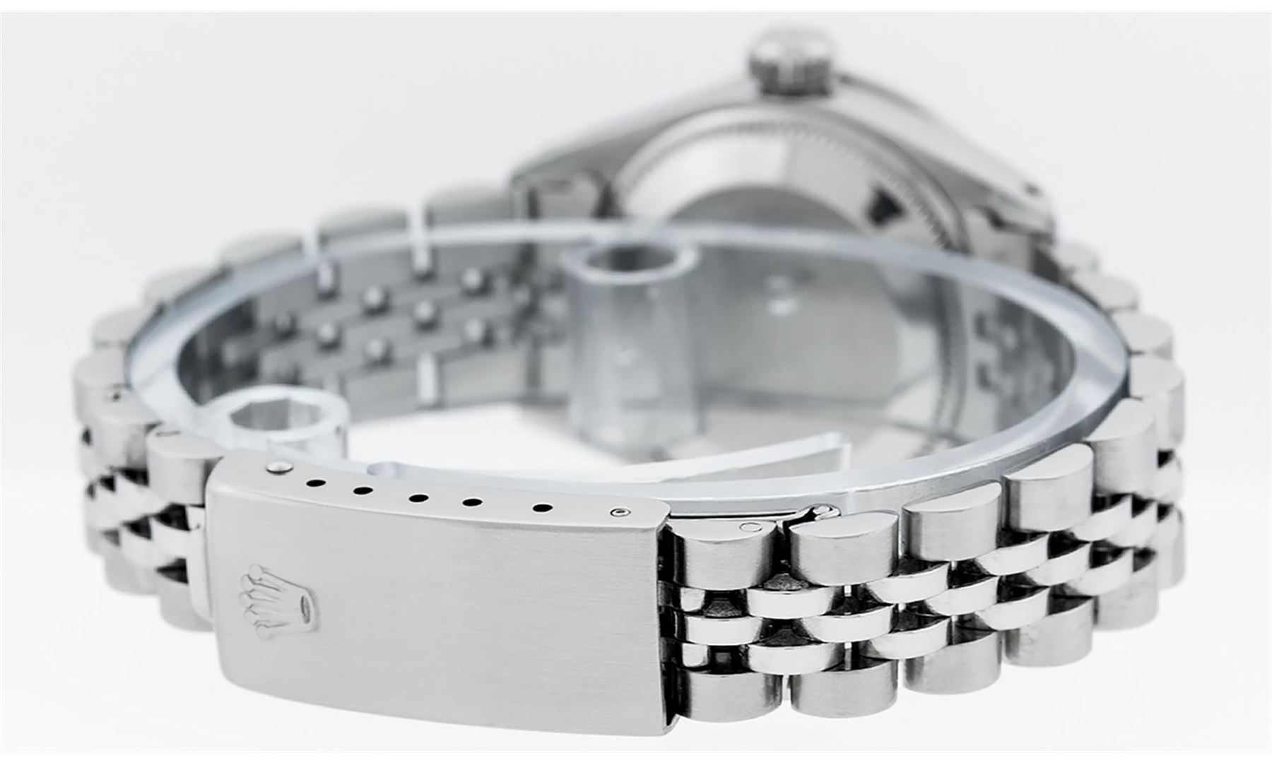 One Ladies Stainless Steel Rolex Datejust Polished Bright with Satin Finish, Serviced & Electronically Tested, Stainless Steel Case: 26mm, Stainless Steel Crown, Custom Bezel: New 18K White Gold Sapphire Beadset Diamond Bezel, Diamond + Gem Count: 28 Diamonds + 4 Sapphires. Total Weight .70 Carat, Clarity: SI-VS, Color: G to H. Custom Crystal: New Scratch Resistant Synthetic Sapphire Cyclops Lens. Custom Hands: New Luminescent Hands. Movement: Automatic Winding Movement Caliber 2030. Custom Dial: Refinished Yellow With Diamond Hour Markers & Dash Tracks, 10 Diamonds in Dial, G To H In Color, Clarity: SI-VS. Date Window: 3 O'Clock Position Date Display, Model: Datejust. Condition: G-6 Extra Fine. Bracelet: Stainless Steel Jubilee Band. Bright Polish & Satin Finish. 6.0 Inch Length, Adjustable. Standard Clasp, With Rolex Logo. This Watch Has Been Serviced Time Tested And Is In Excellent Condition It Is Free Of All Scratches And Dents.