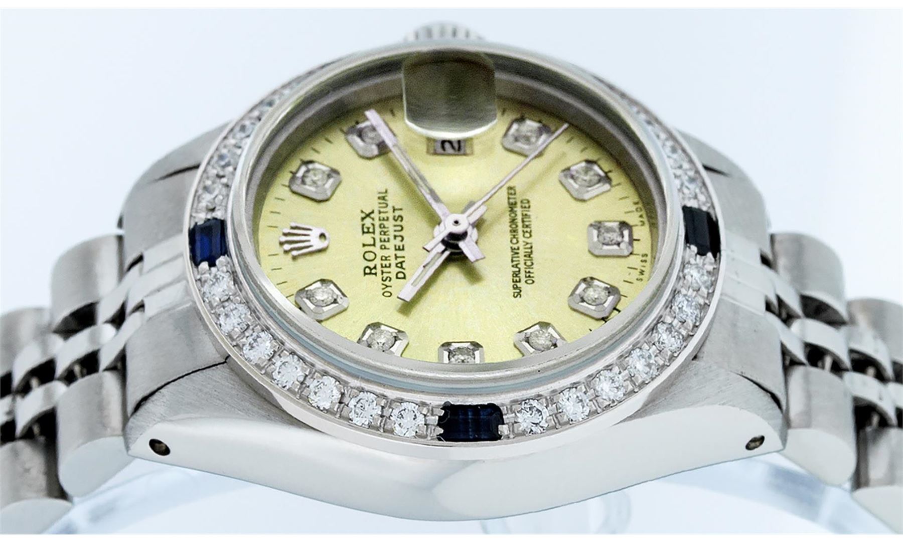 One Ladies Stainless Steel Rolex Datejust Polished Bright with Satin Finish, Serviced & Electronically Tested, Stainless Steel Case: 26mm, Stainless Steel Crown, Custom Bezel: New 18K White Gold Sapphire Beadset Diamond Bezel, Diamond + Gem Count: 28 Diamonds + 4 Sapphires. Total Weight .70 Carat, Clarity: SI-VS, Color: G to H. Custom Crystal: New Scratch Resistant Synthetic Sapphire Cyclops Lens. Custom Hands: New Luminescent Hands. Movement: Automatic Winding Movement Caliber 2030. Custom Dial: Refinished Yellow With Diamond Hour Markers & Dash Tracks, 10 Diamonds in Dial, G To H In Color, Clarity: SI-VS. Date Window: 3 O'Clock Position Date Display, Model: Datejust. Condition: G-6 Extra Fine. Bracelet: Stainless Steel Jubilee Band. Bright Polish & Satin Finish. 6.0 Inch Length, Adjustable. Standard Clasp, With Rolex Logo. This Watch Has Been Serviced Time Tested And Is In Excellent Condition It Is Free Of All Scratches And Dents.
