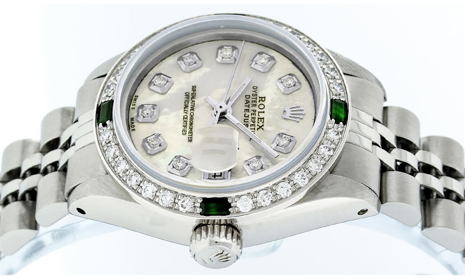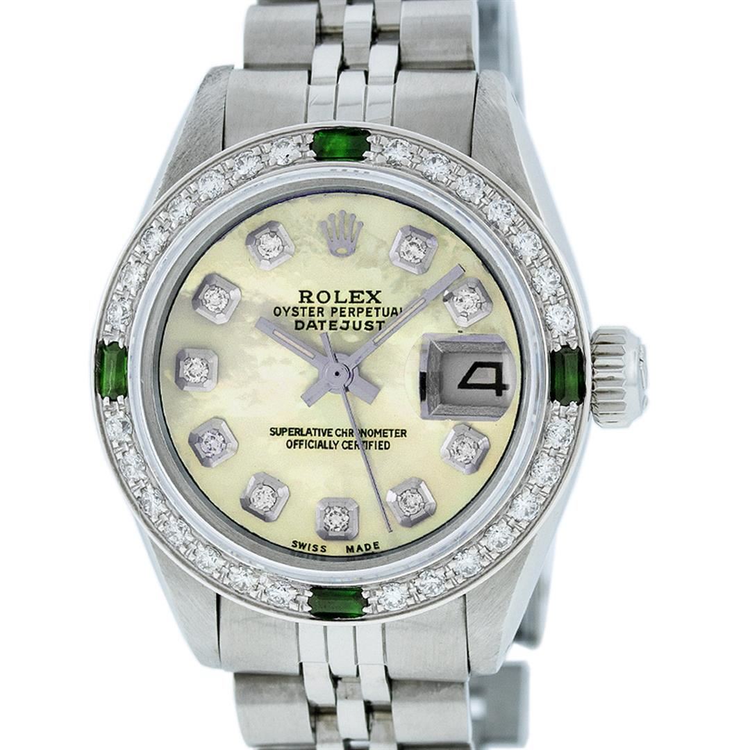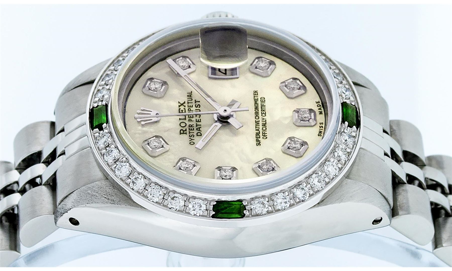 One Ladies Stainless Steel Rolex Datejust Polished Bright with Satin Finish, Serviced & Electronically Tested, Stainless Steel Case: 26mm, Stainless Steel Crown, Custom Bezel: New 18K White Gold Emerald Beadset Diamond Bezel, Diamond + Gem Count: 28 Diamonds + 4 Emeralds. Total Weight .70 Carat, Clarity: SI-VS, Color: G to H. Custom Crystal: New Scratch Resistant Synthetic Sapphire Cyclops Lens. Custom Hands: New Luminescent Hands. Movement: Automatic Winding Movement Caliber 2030. Custom Dial: Refinished Yellow Mother Of Pearl With Diamond Hour Markers, 10 Diamonds in Dial, G To H In Color, Clarity: SI-VS. Date Window: 3 O'Clock Position Date Display, Model: Datejust. Condition: G-6 Extra Fine. Bracelet: Stainless Steel Jubilee Band. Bright Polish & Satin Finish. 6.0 Inch Length, Adjustable. Standard Clasp, With Rolex Logo. This Watch Has Been Serviced Time Tested And Is In Excellent Condition It Is Free Of All Scratches And Dents.