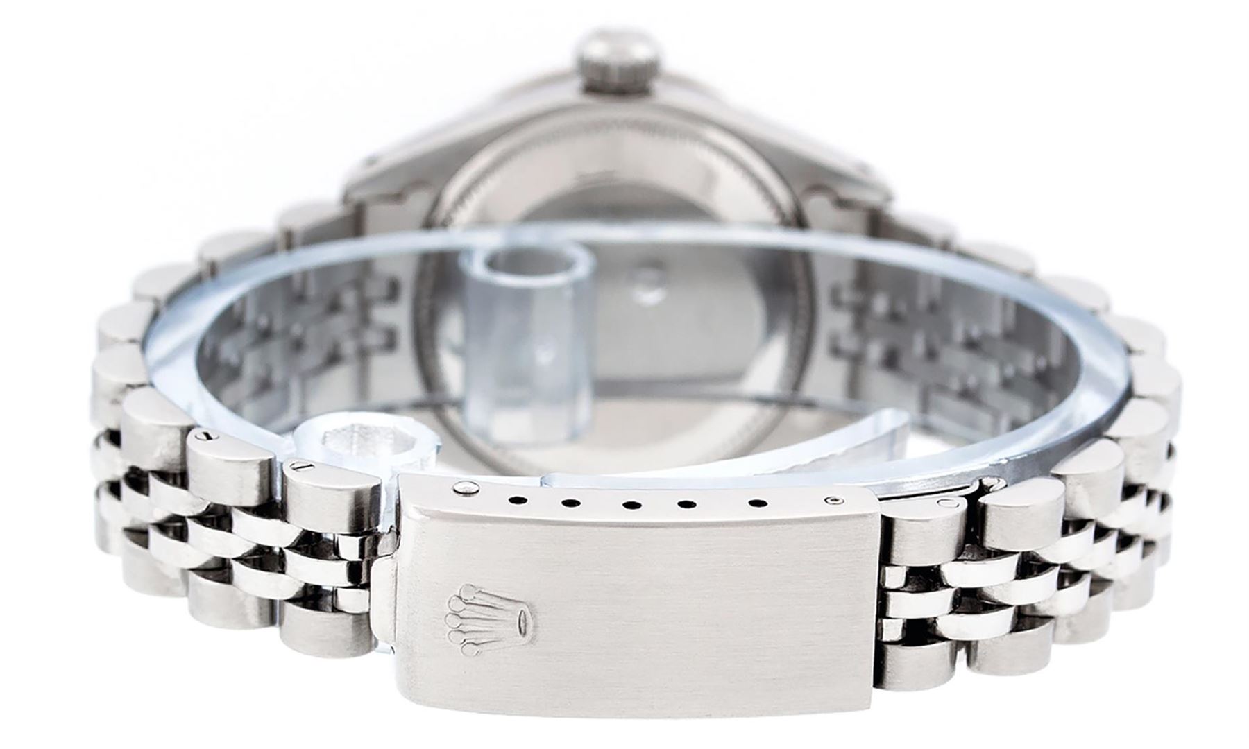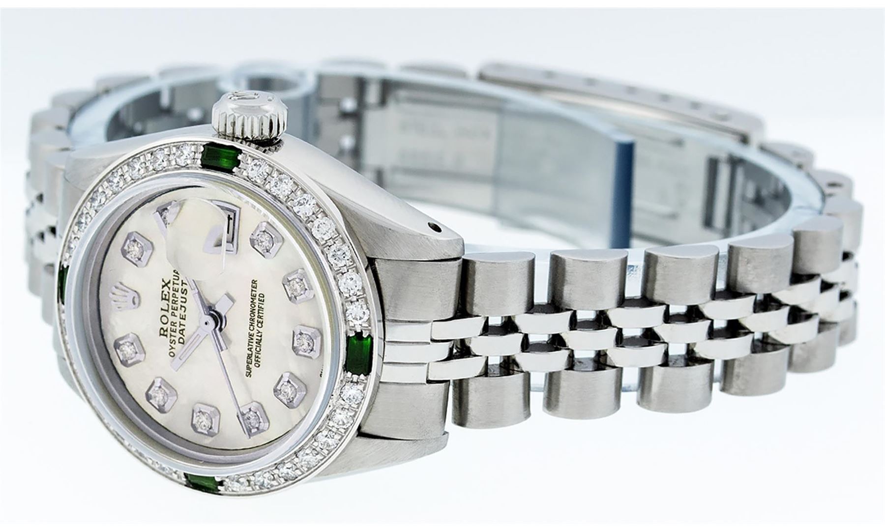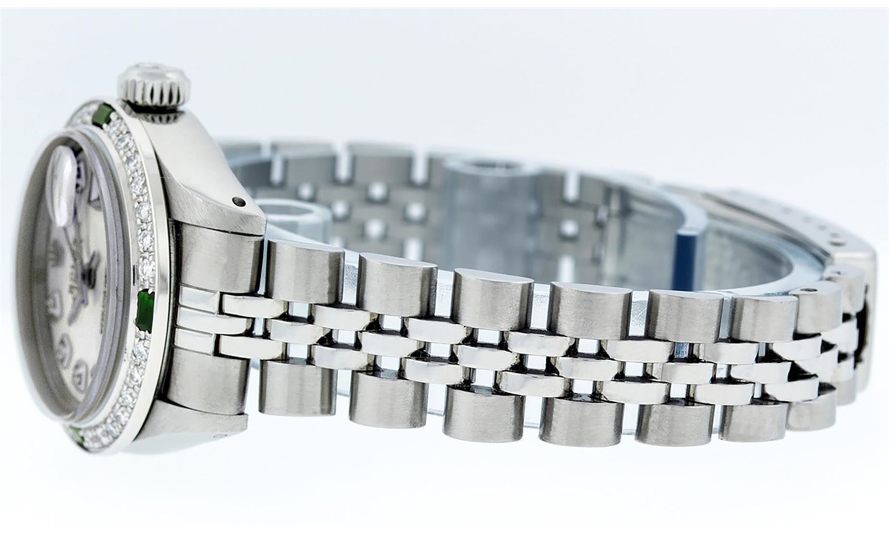One Ladies Stainless Steel Rolex Datejust Polished Bright with Satin Finish, Serviced & Electronically Tested, Stainless Steel Case: 26mm, Stainless Steel Crown, Custom Bezel: New 18K White Gold Emerald Beadset Diamond Bezel, Diamond + Gem Count: 28 Diamonds + 4 Emeralds. Total Weight .70 Carat, Clarity: SI-VS, Color: G to H. Custom Crystal: New Scratch Resistant Synthetic Sapphire Cyclops Lens. Custom Hands: New Luminescent Hands. Movement: Automatic Winding Movement Caliber 2030. Custom Dial: Refinished Yellow Mother Of Pearl With Diamond Hour Markers, 10 Diamonds in Dial, G To H In Color, Clarity: SI-VS. Date Window: 3 O'Clock Position Date Display, Model: Datejust. Condition: G-6 Extra Fine. Bracelet: Stainless Steel Jubilee Band. Bright Polish & Satin Finish. 6.0 Inch Length, Adjustable. Standard Clasp, With Rolex Logo. This Watch Has Been Serviced Time Tested And Is In Excellent Condition It Is Free Of All Scratches And Dents.