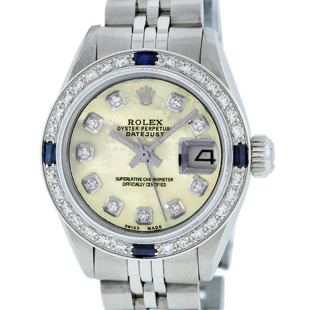 One Ladies Stainless Steel Rolex Datejust Polished Bright with Satin Finish, Serviced & Electronically Tested, Stainless Steel Case: 26mm, Stainless Steel Crown, Custom Bezel: New 18K White Gold Sapphire Beadset Diamond Bezel, Diamond + Gem Count:� 28 Diamonds + 4 Sapphires. Total Weight .70 Carat, Clarity: SI-VS, Color: G to H. Custom Crystal: New Scratch Resistant Synthetic Sapphire Cyclops Lens. Custom Hands: New Luminescent Hands. Movement: Automatic Winding Movement Caliber 2030. Custom Dial: Refinished Yellow Mother Of Pearl With Diamond Hour Markers, 10 Diamonds in Dial, G To H In Color, Clarity: SI-VS. Date Window: 3 O'Clock Position Date Display, Model: Datejust. Condition: G-6 Extra Fine. Bracelet: Stainless Steel Jubilee Band. Bright Polish & Satin Finish. 6.0 Inch Length, Adjustable. Standard Clasp, With Rolex Logo. This Watch Has Been Serviced Time Tested And Is In Excellent Condition It Is Free Of All Scratches And Dents.
