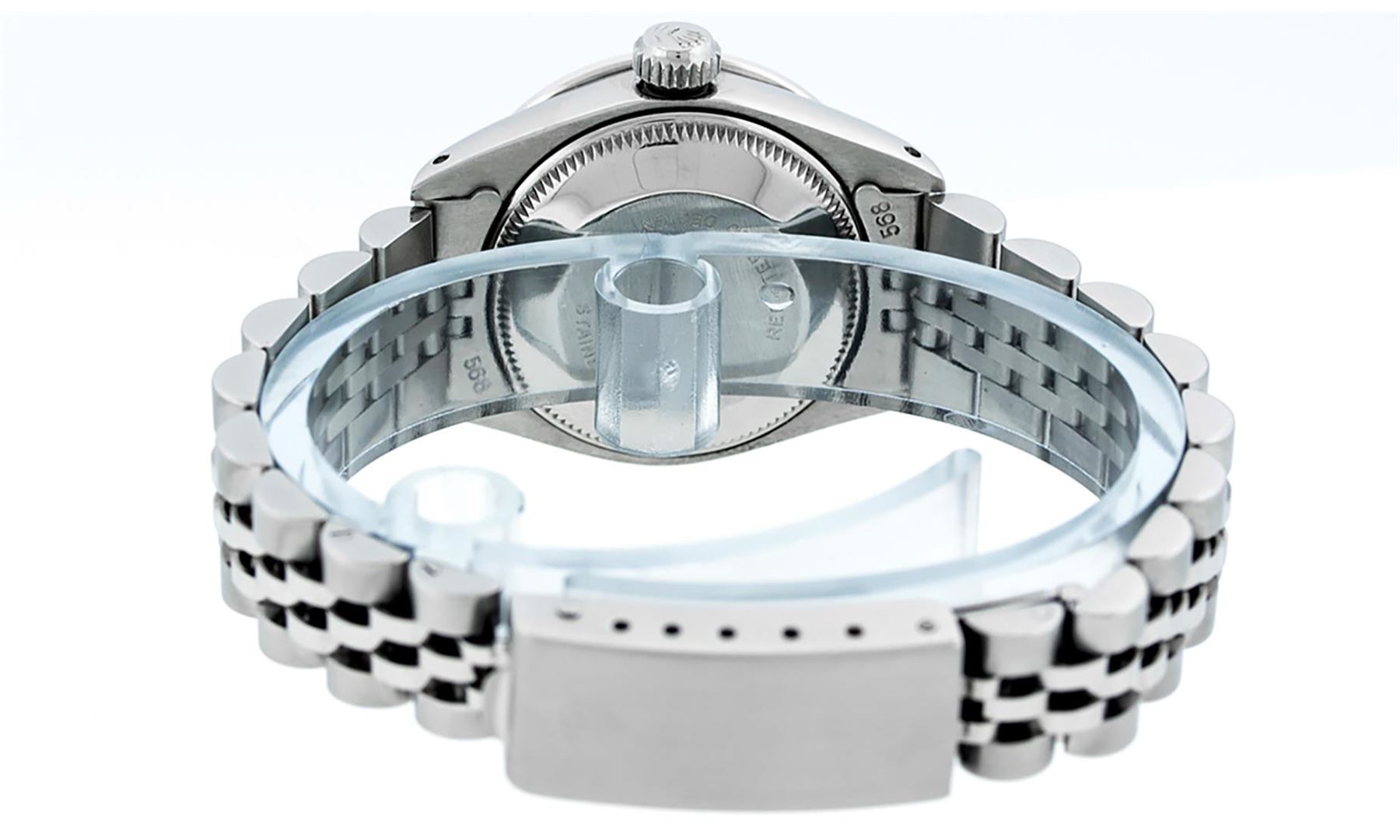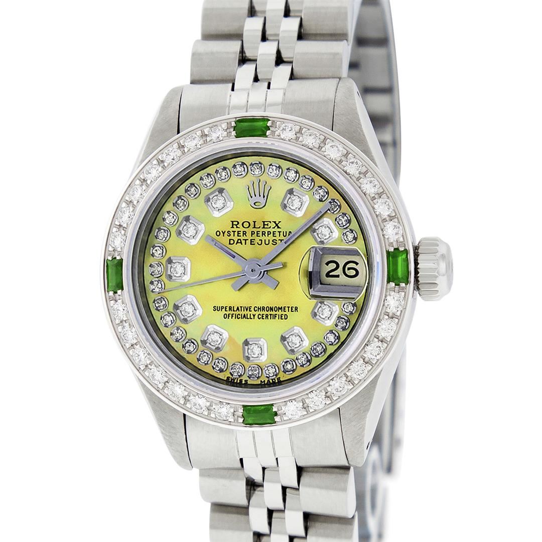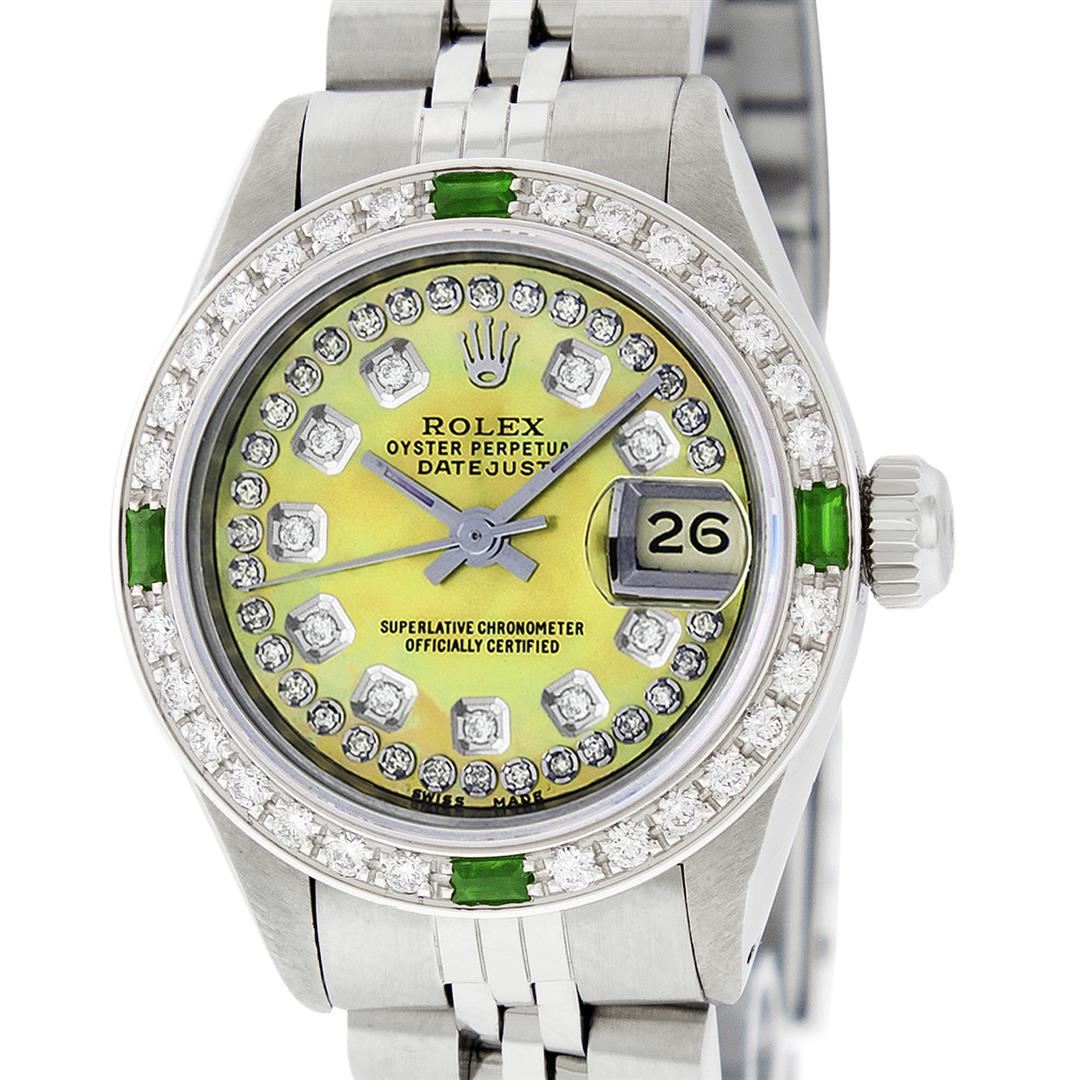 One Ladies Stainless Steel Rolex Datejust Polished Bright with Satin Finish, Serviced & Electronically Tested, Stainless Steel Case: 26mm, Stainless Steel Crown. Custom Bezel: New 18K White Gold Beadset & Emerald Diamond Bezel, Diamond Count: 28 Diamonds + 4 Emeralds. Total Weight .70 Carat, Clarity: SI-VS, Color: G to H. Custom Crystal: New Scratch Resistant Synthetic Sapphire Cyclops Lens. Custom Hands: New Luminescent Hands. Movement: Automatic Winding Movement Caliber 2030. Custom Dial: Refinished Yellow Mother Of Pearl String Diamond Dial, Stone Count: 43 Diamonds On Dial, G To H In Color, Clarity: SI-VS. Date Window: 3 O'Clock Position Date Display, Model: Datejust. Condition: G-6 Extra Fine. Bracelet: Stainless Steel Jubilee Band. Bright Polish & Satin Finish. 6.0 Inch Length, Adjustable. Standard Clasp, With Rolex Logo. This Watch Has Been Serviced Time Tested And Is In Excellent Condition It Is Free Of All Scratches And Dents.