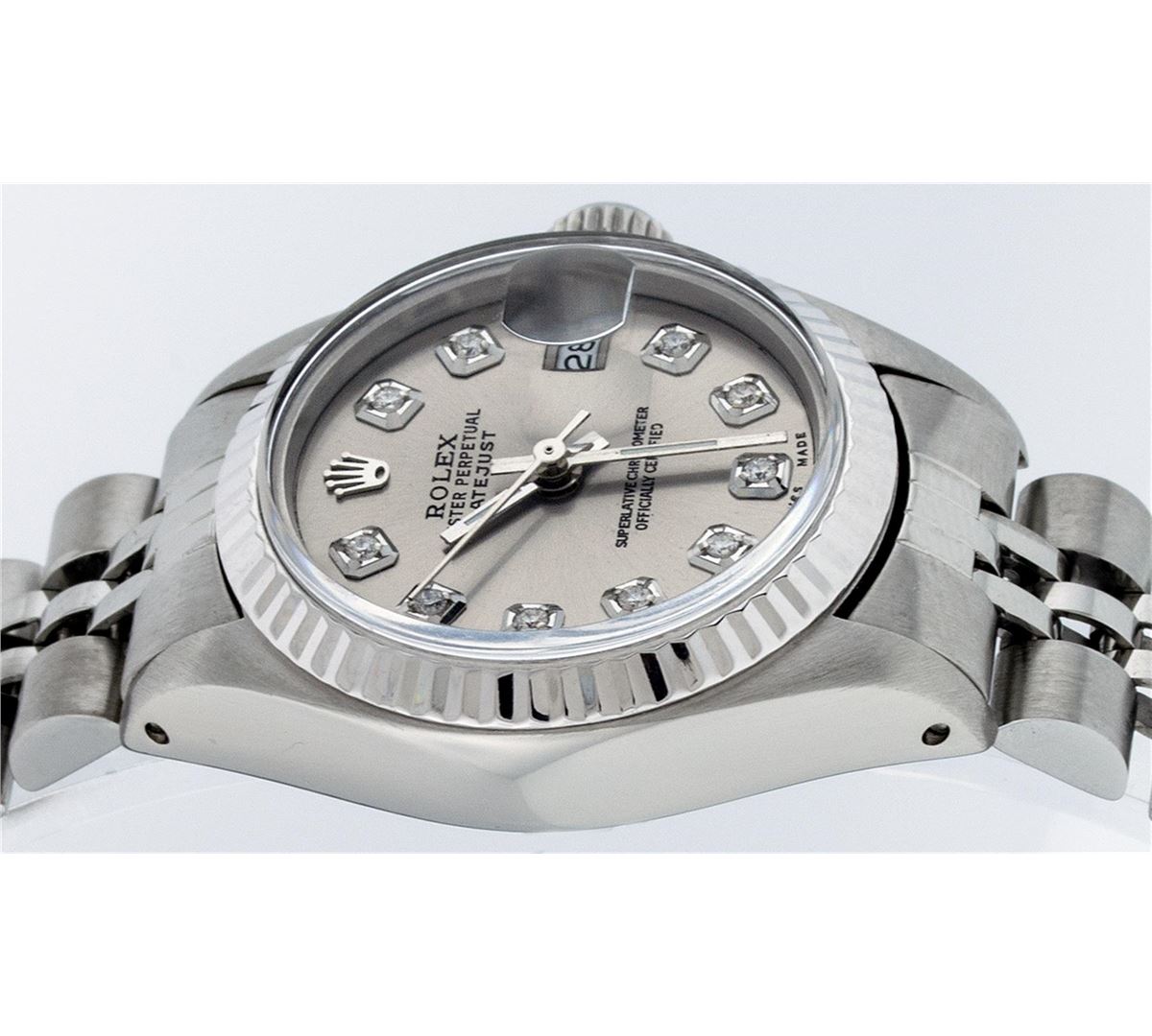 One Ladies Rolex Datejust Polished Bright with Satin Finish, Serviced & Electronically Tested, Stainless Steel Case:26mm, Stainless Steel Crown, Bezel: 14K White Gold Fluted. Custom Crystal: Acrylic Cyclops Lens. Movement: Automatic Winding Movement Caliber 2030. Custom Dial: Slate Grey With Diamond Hour Markers, Diamond Count: 10 Diamonds, Clarity: SI-VS, Color: G to H. Date Window: 3 O'Clock Position Date Display, Model: Datejust. Condition: G-6 Extra Fine. Bracelet: Stainless Steel Jubilee Band. Bright Polish & Satin Finish. 6.0 Inch Length, Adjustable. Standard Clasp, With Rolex Logo.