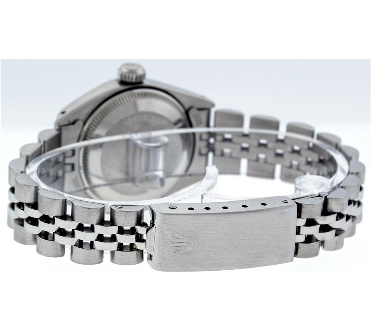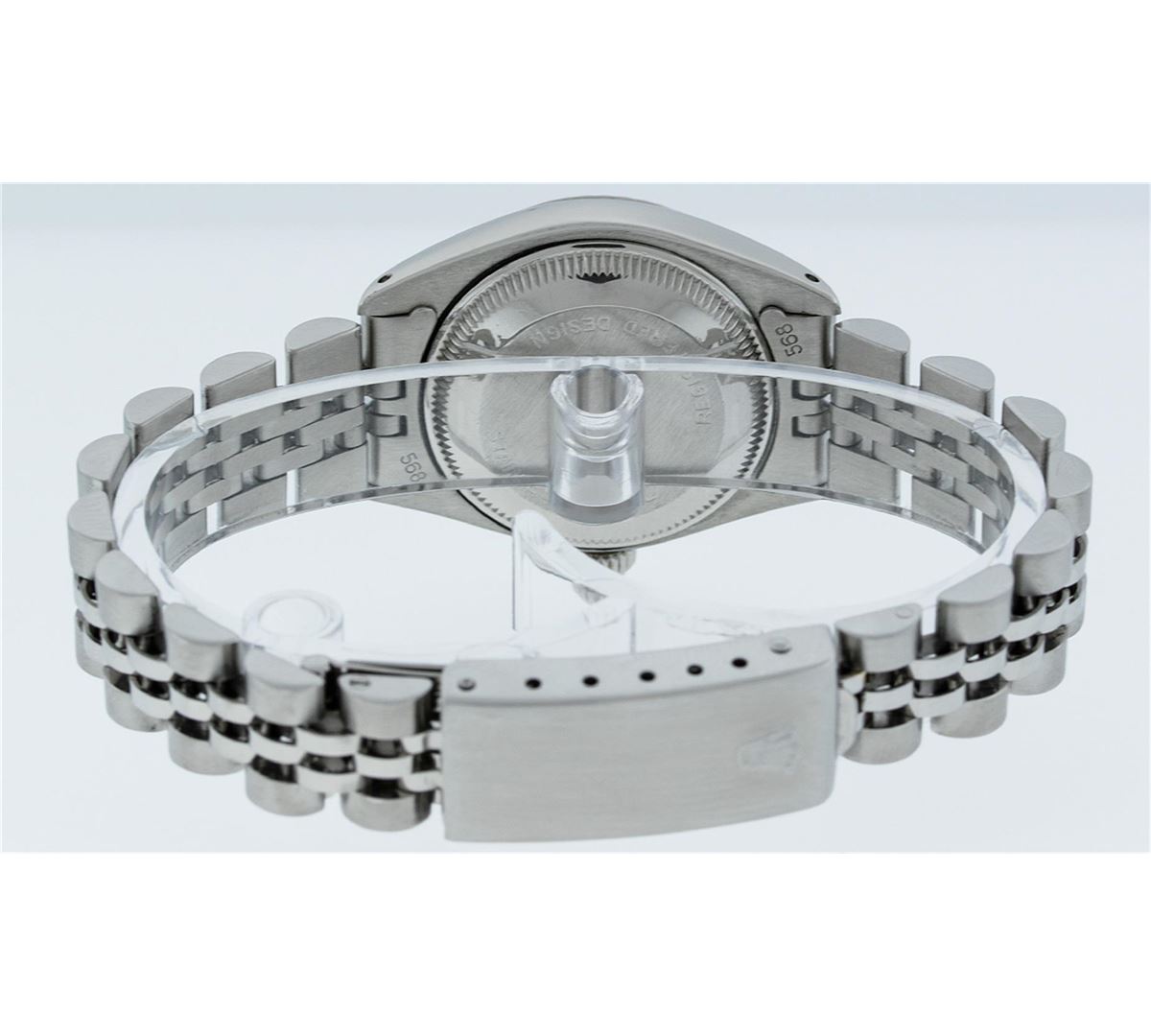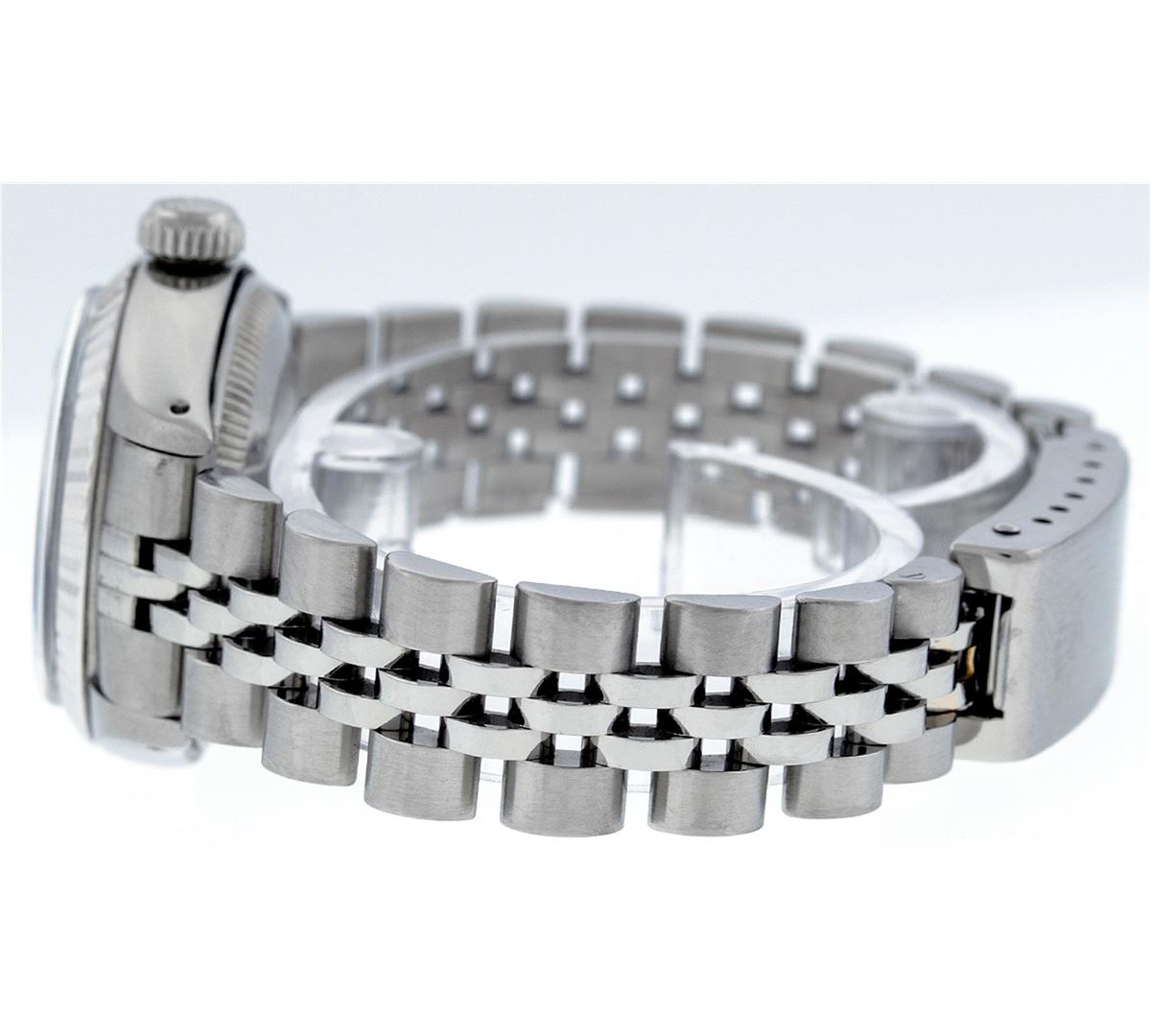 One Ladies Rolex Datejust Polished Bright with Satin Finish, Serviced & Electronically Tested, Stainless Steel Case:26mm, Stainless Steel Crown, Bezel: 14K White Gold Fluted. Custom Crystal: Acrylic Cyclops Lens. Movement: Automatic Winding Movement Caliber 2030. Custom Dial: Slate Grey With Diamond Hour Markers, Diamond Count: 10 Diamonds, Clarity: SI-VS, Color: G to H. Date Window: 3 O'Clock Position Date Display, Model: Datejust. Condition: G-6 Extra Fine. Bracelet: Stainless Steel Jubilee Band. Bright Polish & Satin Finish. 6.0 Inch Length, Adjustable. Standard Clasp, With Rolex Logo.