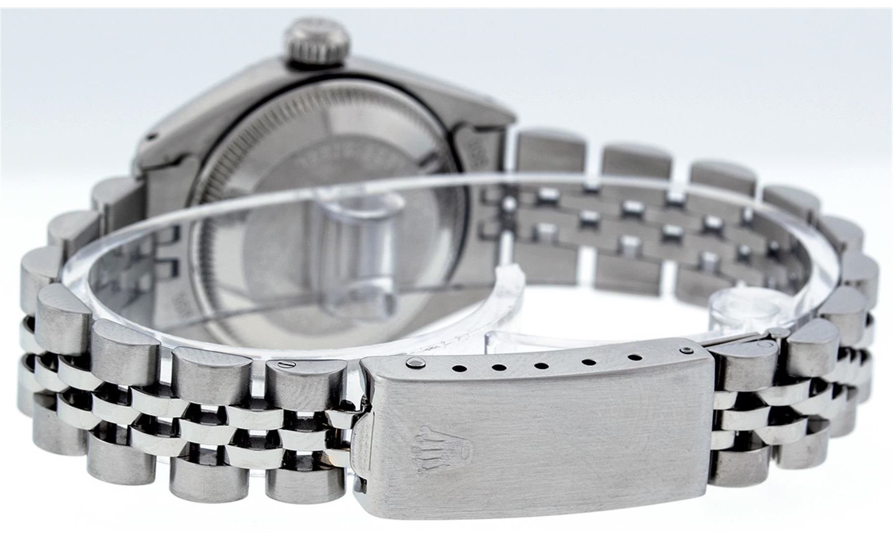 One Ladies Rolex Datejust Polished Bright with Satin Finish, Serviced & Electronically Tested, Stainless Steel Case:26mm, Stainless Steel Crown, Bezel: 14K White Gold Fluted. Custom Crystal: Acrylic Cyclops Lens. Movement: Automatic Winding Movement Caliber 2030. Custom Dial: Slate Grey With Diamond Hour Markers, Diamond Count: 10 Diamonds, Clarity: SI-VS, Color: G to H. Date Window: 3 O'Clock Position Date Display, Model: Datejust. Condition: G-6 Extra Fine. Bracelet: Stainless Steel Jubilee Band. Bright Polish & Satin Finish. 6.0 Inch Length, Adjustable. Standard Clasp, With Rolex Logo.