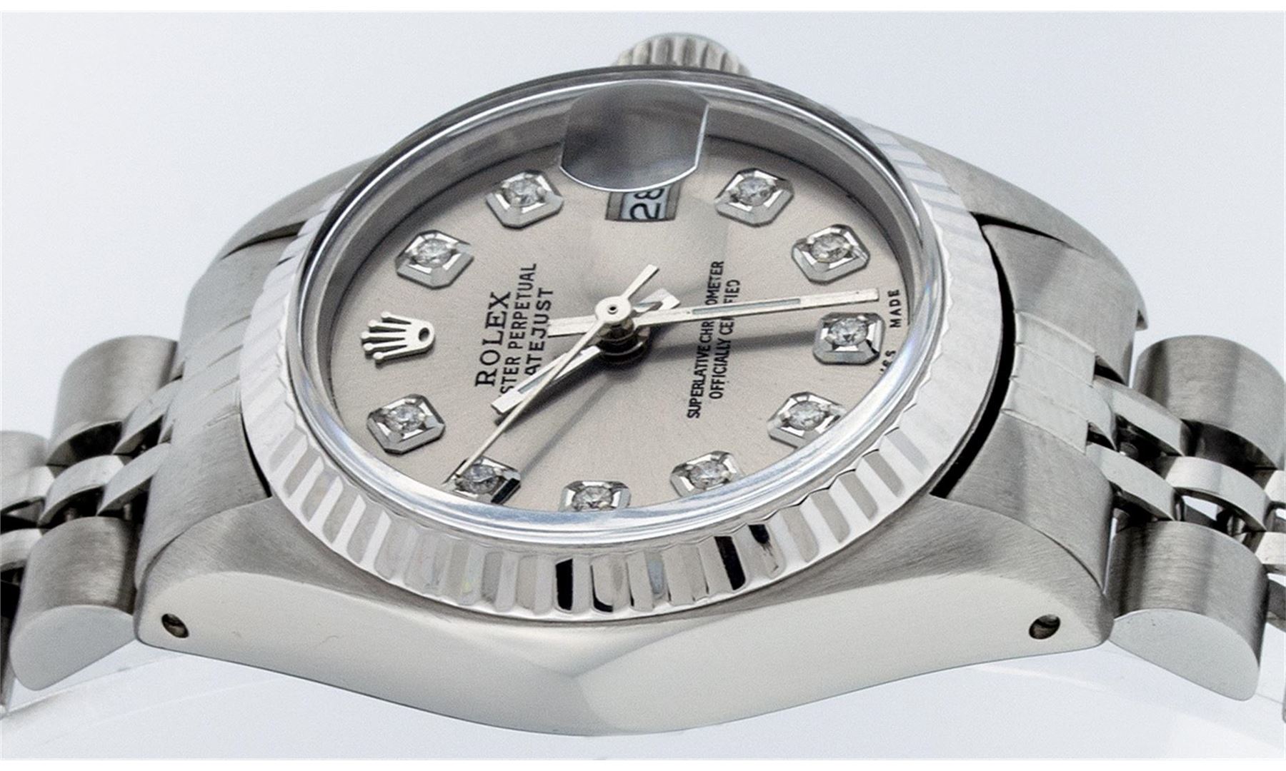 One Ladies Rolex Datejust Polished Bright with Satin Finish, Serviced & Electronically Tested, Stainless Steel Case:26mm, Stainless Steel Crown, Bezel: 14K White Gold Fluted. Custom Crystal: Acrylic Cyclops Lens. Movement: Automatic Winding Movement Caliber 2030. Custom Dial: Slate Grey With Diamond Hour Markers, Diamond Count: 10 Diamonds, Clarity: SI-VS, Color: G to H. Date Window: 3 O'Clock Position Date Display, Model: Datejust. Condition: G-6 Extra Fine. Bracelet: Stainless Steel Jubilee Band. Bright Polish & Satin Finish. 6.0 Inch Length, Adjustable. Standard Clasp, With Rolex Logo.