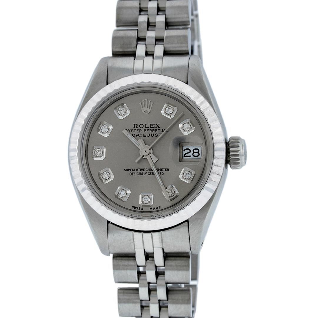 One Ladies Rolex Datejust Polished Bright with Satin Finish, Serviced & Electronically Tested, Stainless Steel Case:26mm, Stainless Steel Crown, Bezel: 14K White Gold Fluted. Custom Crystal: Acrylic Cyclops Lens. Movement: Automatic Winding Movement Caliber 2030. Custom Dial: Slate Grey With Diamond Hour Markers, Diamond Count: 10 Diamonds, Clarity: SI-VS, Color: G to H. Date Window: 3 O'Clock Position Date Display, Model: Datejust. Condition: G-6 Extra Fine. Bracelet: Stainless Steel Jubilee Band. Bright Polish & Satin Finish. 6.0 Inch Length, Adjustable. Standard Clasp, With Rolex Logo.
