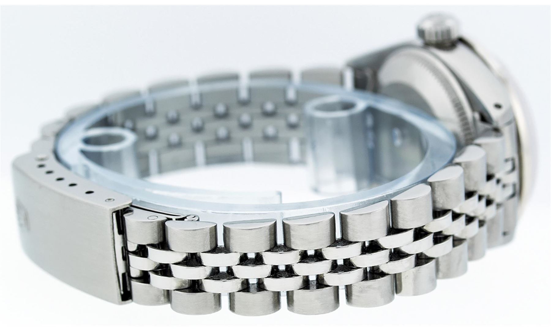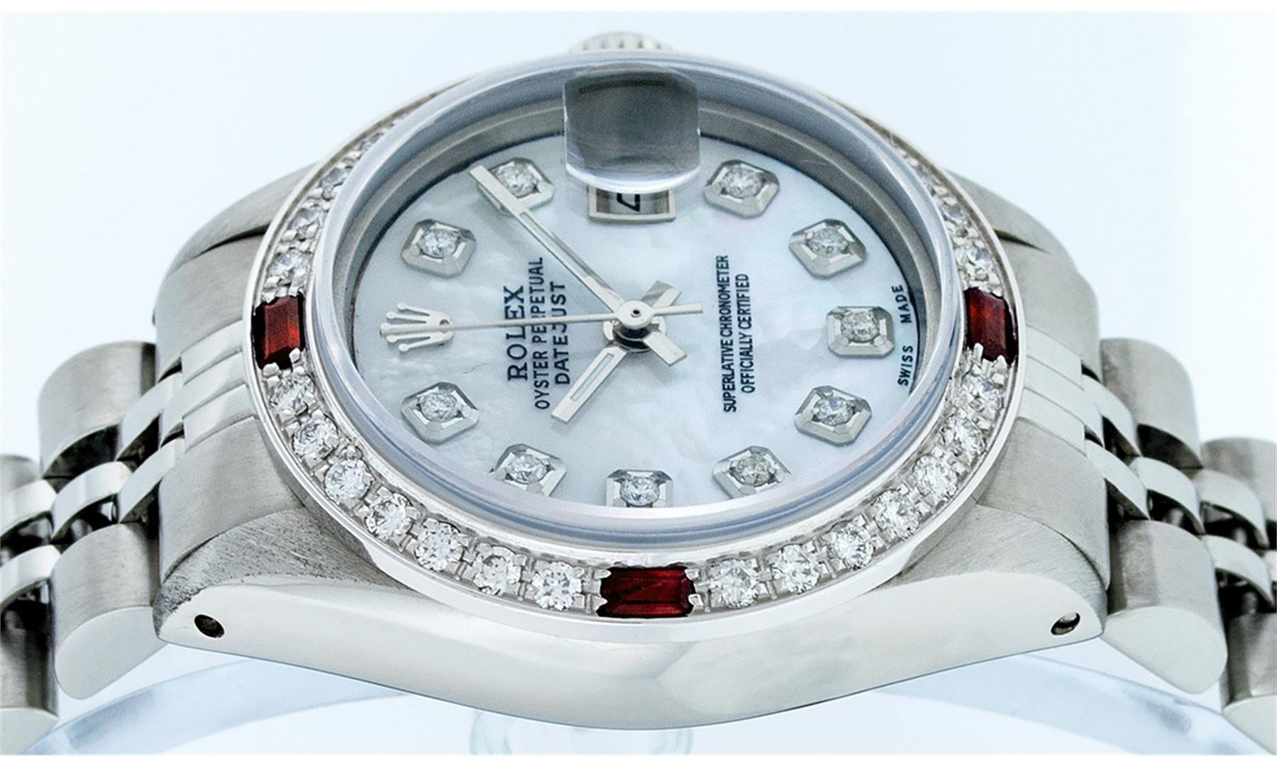 One Ladies Stainless Steel Rolex Datejust Polished Bright with Satin Finish, Serviced & Electronically Tested, Stainless Steel Case:26mm, Stainless Steel Crown, Custom Bezel: 18K White Gold Ruby Beadset Diamond Bezel, Diamond Count: 28 Diamonds + 4 Rubies Total Weight .70 Carat, Clarity: SI-VS, Color: G to H. Custom Crystal: Synthetic Sapphire Cyclops Lens. Movement: Automatic Winding Movement Caliber 2030. Custom Dial: Mother Of Pearl Dial with Diamond Hour Markers. Diamond Count: 10 Diamonds In Dial, Clarity: SI-VS, Color: G to H. Date Window: 3 O'Clock Position Date Display, Model: Ladies Datejust, Condition: G-6 Extra Fine. Bracelet: Stainless Steel Jubilee Band. Bright Polish & Satin Finish. 5.5 Inch Length, Adjustable. Standard Clasp, With Rolex Logo. Watch Has Been Serviced And Polished It Is Free Of All Scratches And Dents.
