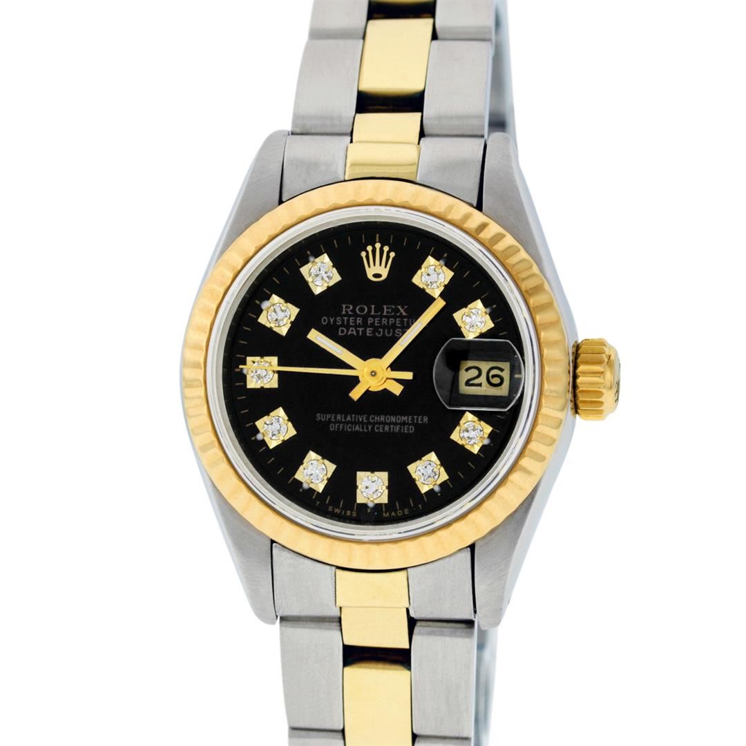 One Ladies 14K Two Tone Rolex Datejust Polished, Serviced & Electronically Tested, 14K Yellow Gold & Stainless Steel Case: 26mm, 14K Yellow Gold Crown, Bezel: 14K Yellow Gold Fluted Bezel. Custom Crystal: New Acrylic Cyclops Lens. Custom Hands: New Luminescent Hands. Movement: Automatic Winding Movement Caliber 2030. Custom Dial: Black With Diamond Hour Markers, Diamond Count: 10 Single Cut Diamonds, Color: G to H, Clarity: VS. Date Window: 3 O'clock Position Date Display, Model: Datejust. Condition: G-6 Extra Fine. Bracelet: Two Tone 14K Yellow Gold & Stainless Steel Oyster Band. Bright Polish. 6.0 Inch Length, Adjustable. Standard Clasp, With Rolex Logo. This Watch Has Been Serviced Time Tested And Is In Excellent Condition It Is Free Of All Scratches And Dents.