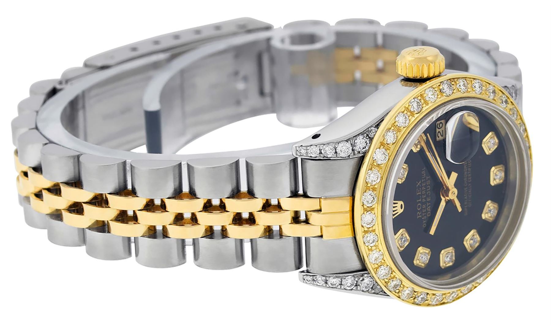 One Ladies 14K Two Tone Rolex Datejust Polished, Serviced & Electronically Tested, 14K Yellow Gold & Stainless Steel Case: 26mm, 14K Yellow Gold Crown, Diamond Lugs: 24 Diamonds On Lugs, Clarity: SI-VS, Color: G to H, Clarity SI-VS. Custom Bezel: New 18K Yellow Gold Beadset Diamond Bezel, Diamond Count: 32 Diamonds, Total Weight .70 Carat, Clarity: SI-VS, Color: G to H. Custom Crystal: New Synthetic Sapphire Cyclops Lens. Custom Hands: New Luminescent Hands. Movement: Automatic Winding Movement Caliber 2030. Custom Dial: Black With Diamond Hour Markers, Diamond Count: 10 Diamonds, Clarity: SI-VS, Color: G to H. Date Window: 3 O'clock Position Date Display, Model: Datejust. Condition: G-6 Extra Fine. Bracelet: Two Tone 14K Yellow Gold & Stainless Steel Jubilee. Bright Polish. 6.0 Inch Length, Adjustable. Standard Clasp, With Rolex Logo. This Watch Has Been Serviced Time Tested And Is In Excellent Condition It Is Free Of All Scratches And Dents.