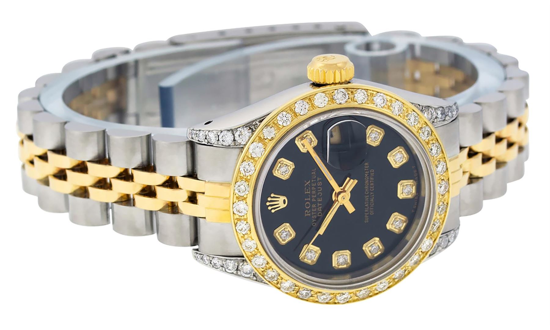 One Ladies 14K Two Tone Rolex Datejust Polished, Serviced & Electronically Tested, 14K Yellow Gold & Stainless Steel Case: 26mm, 14K Yellow Gold Crown, Diamond Lugs: 24 Diamonds On Lugs, Clarity: SI-VS, Color: G to H, Clarity SI-VS. Custom Bezel: New 18K Yellow Gold Beadset Diamond Bezel, Diamond Count: 32 Diamonds, Total Weight .70 Carat, Clarity: SI-VS, Color: G to H. Custom Crystal: New Synthetic Sapphire Cyclops Lens. Custom Hands: New Luminescent Hands. Movement: Automatic Winding Movement Caliber 2030. Custom Dial: Black With Diamond Hour Markers, Diamond Count: 10 Diamonds, Clarity: SI-VS, Color: G to H. Date Window: 3 O'clock Position Date Display, Model: Datejust. Condition: G-6 Extra Fine. Bracelet: Two Tone 14K Yellow Gold & Stainless Steel Jubilee. Bright Polish. 6.0 Inch Length, Adjustable. Standard Clasp, With Rolex Logo. This Watch Has Been Serviced Time Tested And Is In Excellent Condition It Is Free Of All Scratches And Dents.