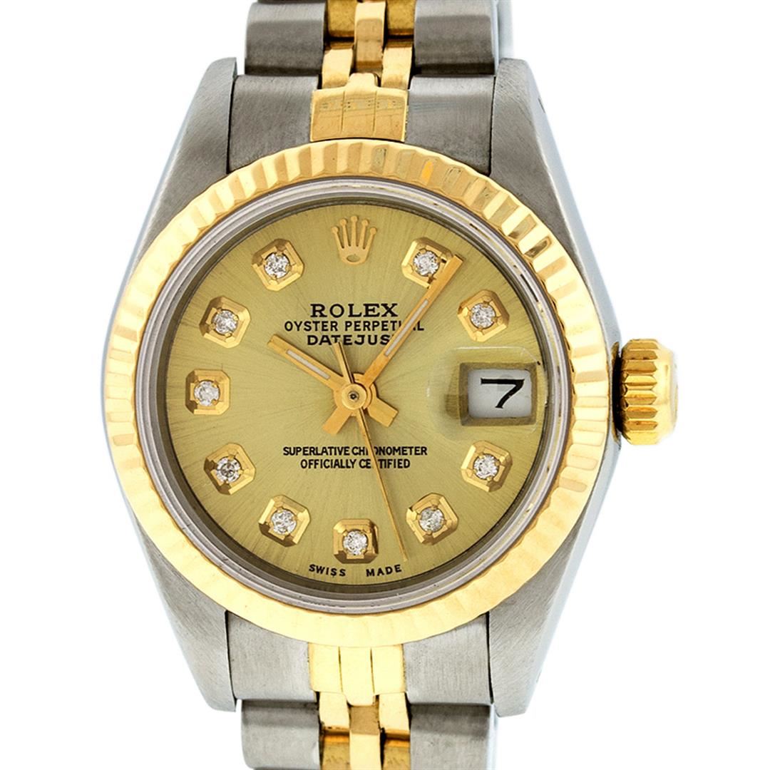 One Ladies 14K Two Tone Rolex Datejust Polished, Serviced & Electronically Tested, 14K Yellow Gold & Stainless Steel Case: 26mm, 14K Yellow Gold Crown, Bezel: 14K Yellow Gold Fluted Bezel. Custom Crystal: New Acrylic Cyclops Lens. Custom Hands: New Luminescent Hands. Movement: Automatic Winding Movement Caliber 2030. Custom Dial: Champagne With Diamond Hour Markers, Diamond Count: 10 Diamonds In Dial, Color: G to H, Clarity: VS2-SI1. Date Window: 3 O'clock Position Date Display, Model: Datejust. Condition: G-6 Extra Fine. Bracelet: Two Tone 14K Yellow Gold & Stainless Steel Jubilee. Bright Polish. 6.0 Inch Length, Adjustable. Standard Clasp, With Rolex Logo. This Watch Has Been Serviced Time Tested And Is In Excellent Condition It Is Free Of All Scratches And Dents.