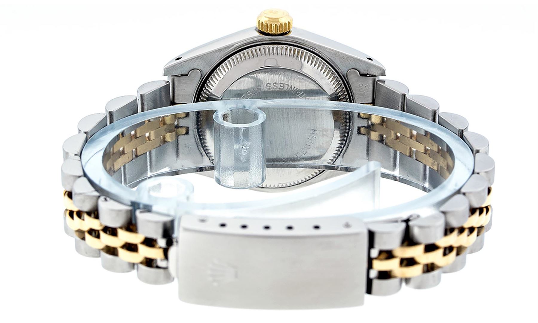 One Ladies 14K Two Tone Rolex Datejust Polished, Serviced & Electronically Tested, 14K Yellow Gold & Stainless Steel Case: 26mm, 14K Yellow Gold Crown, Bezel: 14K Yellow Gold Fluted Bezel. Custom Crystal: New Acrylic Cyclops Lens. Custom Hands: New Luminescent Hands. Movement: Automatic Winding Movement Caliber 2030. Custom Dial: Champagne With Diamond Hour Markers, Diamond Count: 10 Diamonds In Dial, Color: G to H, Clarity: VS2-SI1. Date Window: 3 O'clock Position Date Display, Model: Datejust. Condition: G-6 Extra Fine. Bracelet: Two Tone 14K Yellow Gold & Stainless Steel Jubilee. Bright Polish. 6.0 Inch Length, Adjustable. Standard Clasp, With Rolex Logo. This Watch Has Been Serviced Time Tested And Is In Excellent Condition It Is Free Of All Scratches And Dents.