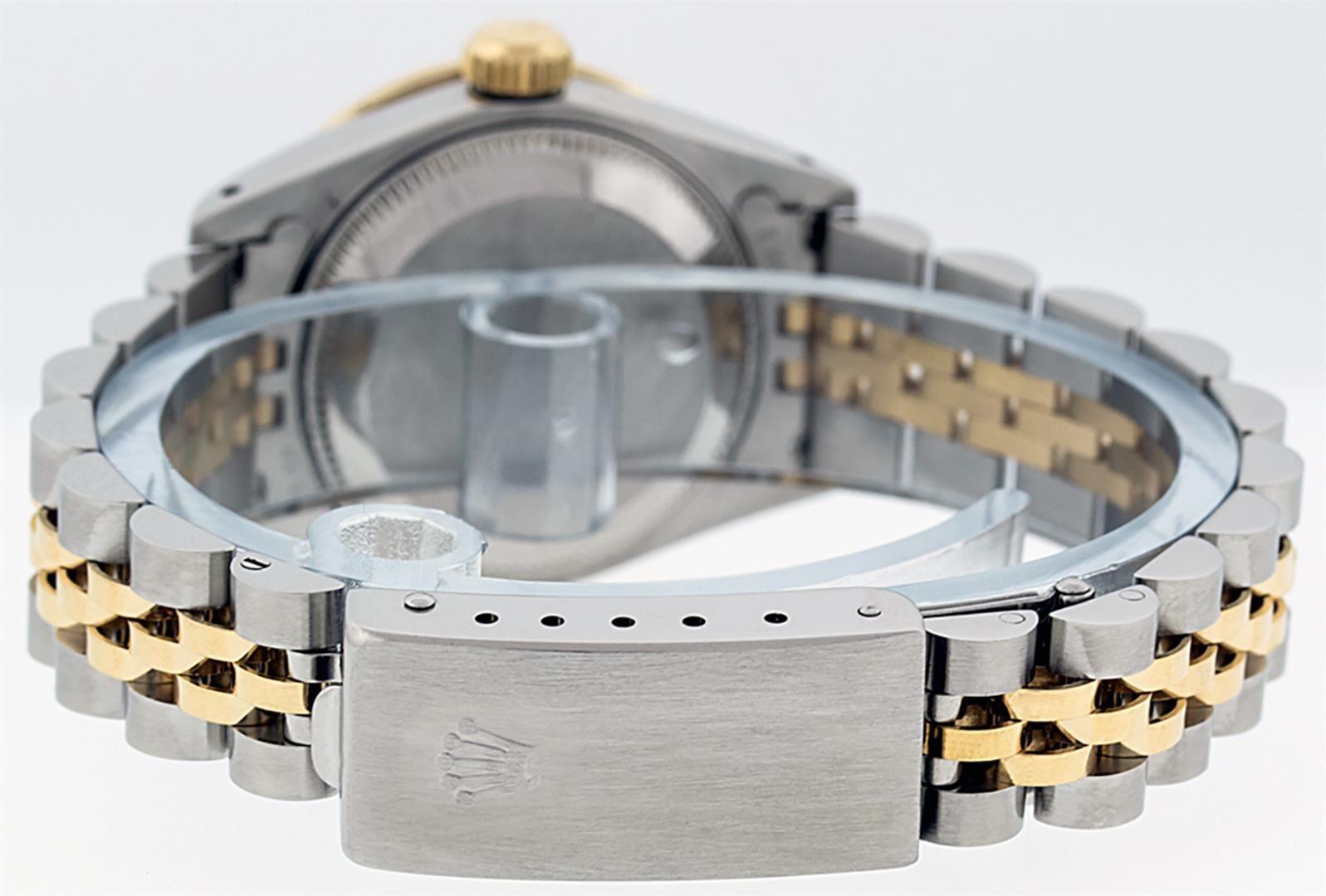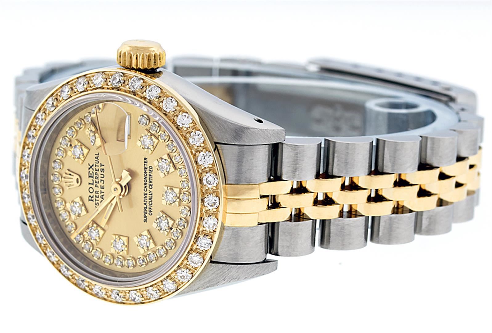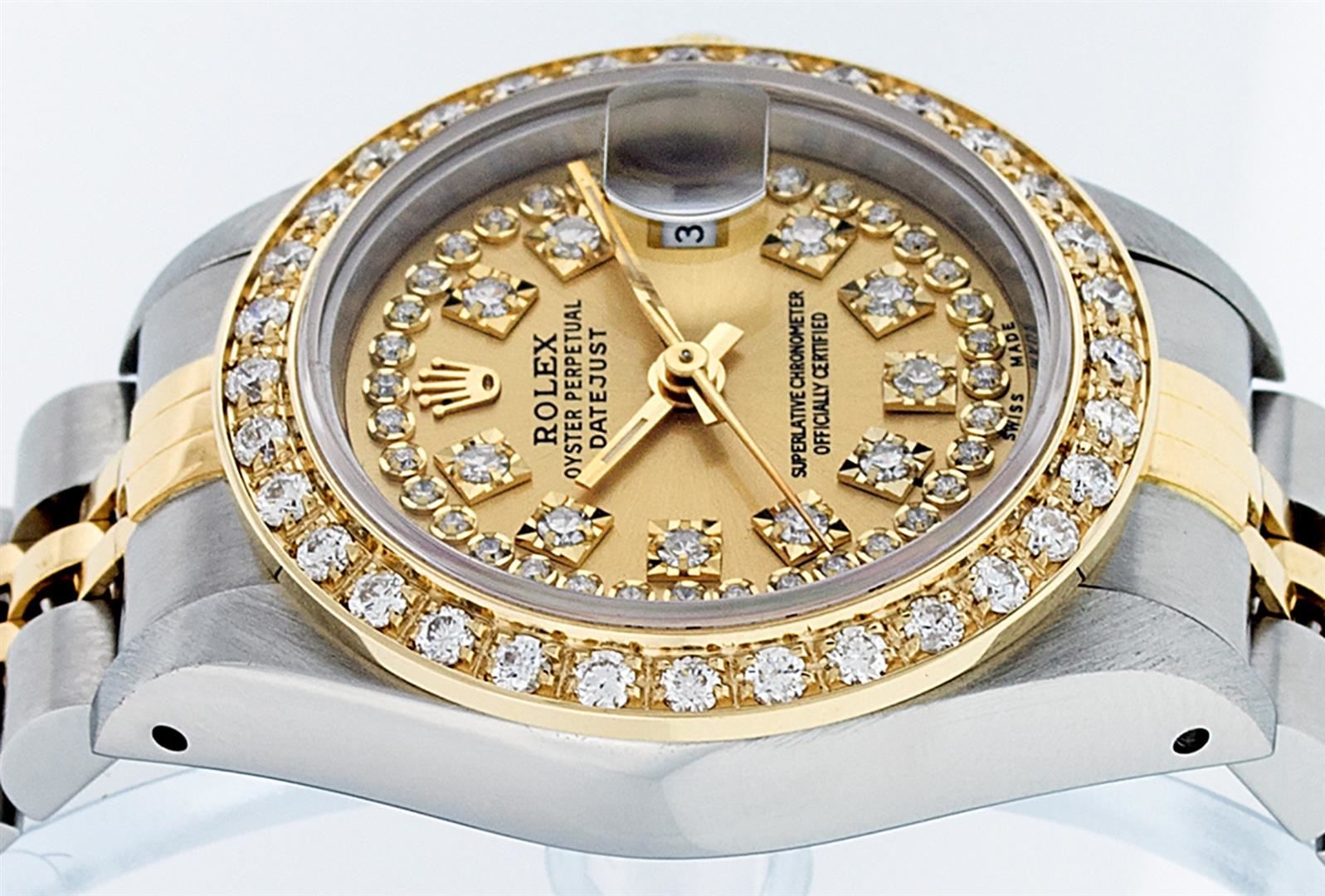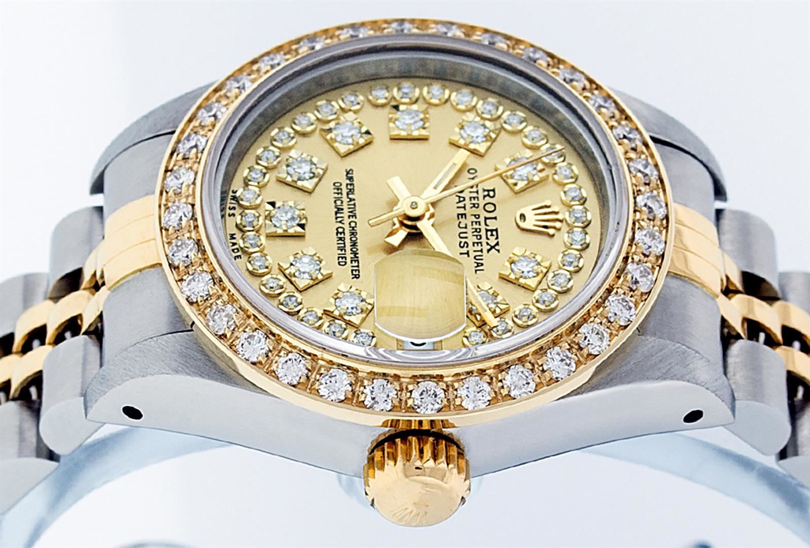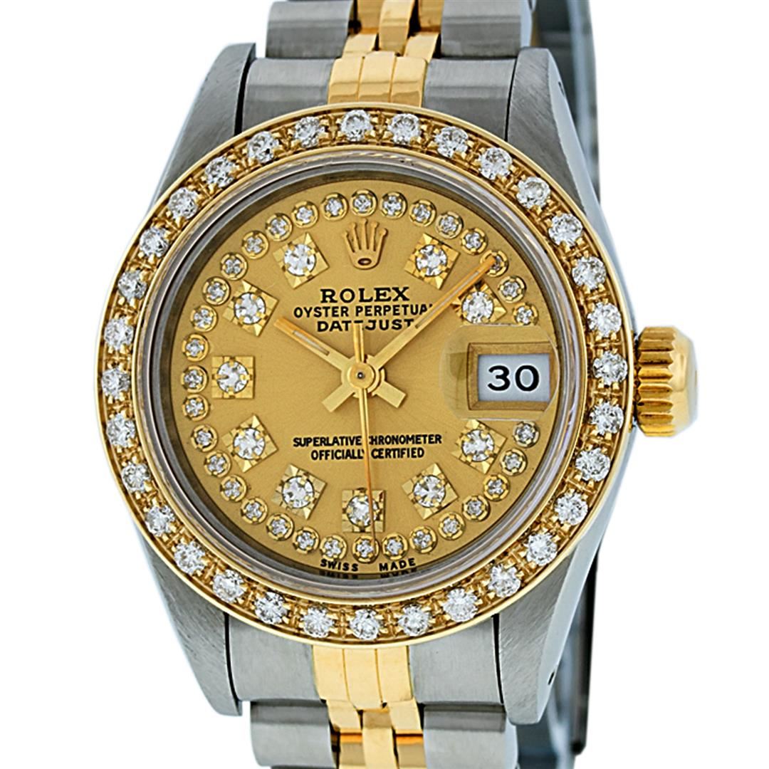 One Ladies 14K Two Tone Rolex Datejust Polished, Serviced & Electronically Tested, 14K Yellow Gold & Stainless Steel Case: 26mm, 14K Yellow Gold Crown, Custom Bezel: New 18K New Yellow Gold Beadset Diamond Bezel, Diamond Count: 32 Diamonds On Bezel, Total Bezel Weight .70 Carat, Clarity: SI-VS, Color: G to H. Custom Crystal: New Scratch Resistant Synthetic Sapphire Cyclops Lens. Custom Hands: New Luminescent Hands. Movement: Automatic Winding Movement Caliber 2030. Custom Dial: Champagne With String Single Cut Diamond Hour Markers, Diamond Count: 43 Diamonds In Dial, Clarity: SI-VS, Color: G to H. Date Window: 3 O'Clock Position Date Display, Model: Datejust. Condition: G-6 Extra Fine. Bracelet: Two Tone 14K Yellow Gold & Stainless Steel Jubilee Band. Bright Polish. 6.0 Inch Length, Adjustable. Standard Clasp, With Rolex Logo. This Watch Has Been Serviced Time Tested And Is In Excellent Condition It Is Free Of All Scratches And Dents.