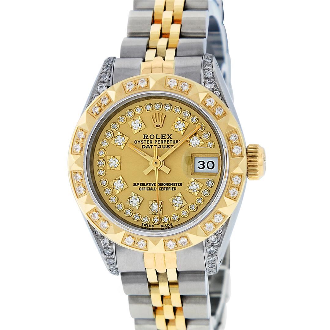 One Ladies 14K Two Tone Rolex Datejust Polished, Serviced & Electronically Tested, 14K Yellow Gold & Stainless Steel Case: 26mm, 14K Yellow Gold Crown, Diamond Lugs: 24 Diamonds On Lugs, Clarity: SI-VS, Color: G to H, Clarity SI-VS. Custom Bezel: New 18K Yellow Gold Pyramid Diamond Bezel, Diamond Count: 24 Diamonds, Total Weight For Bezel .50 Carat, Clarity: SI-VS, Color: G to H. Custom Crystal: New Scratch Resistant Synthetic Sapphire Cyclops Lens. Custom Hands: New Luminescent Hands. Movement: Automatic Winding Movement Caliber 2030. Custom Dial: Champagne With Single Cut Diamond Hour Markers, Diamond Count: 43 Diamonds In Dial, Clarity: SI-VS, Color: G to H. Date Window: 3 O'Clock Position Date Display, Model: Datejust. Condition: G-6 Extra Fine. Bracelet: Two Tone 14K Yellow Gold & Stainless Steel Jubilee. Bright Polish. 6.0 Inch Length, Adjustable. Standard Clasp, With Rolex Logo. This Watch Has Been Serviced Time Tested And Is In Excellent Condition It Is Free Of All Scratches And Dents.