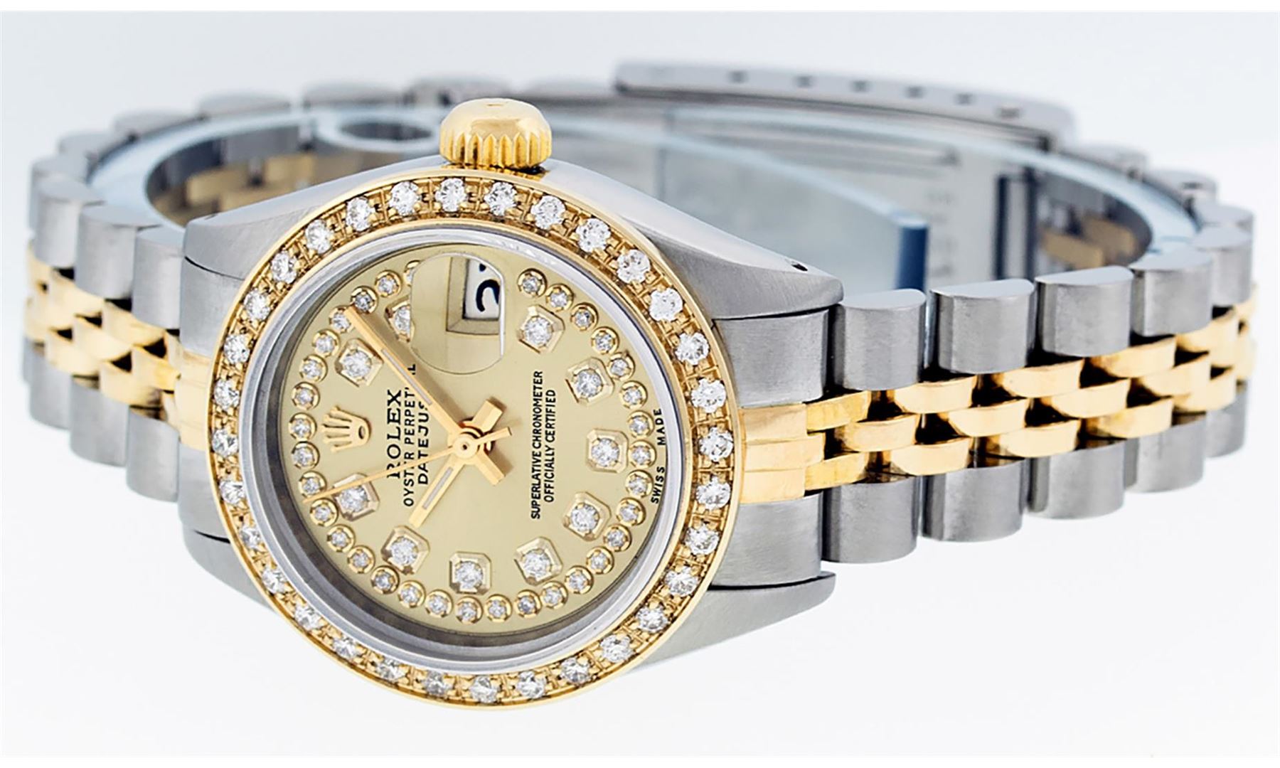 One Ladies 14K Two Tone Rolex Datejust Polished, Serviced & Electronically Tested, 14K Yellow Gold & Stainless Steel Case: 26mm, 14K Yellow Gold Crown, Custom Bezel: New 18K Yellow Gold Beadset Diamond Bezel, Diamond Count: 32 Diamonds Total Weight .70 Carat, Clarity: SI-VS, Color: G to H. Custom Crystal: New Synthetic Sapphire Cyclops Lens. Custom Hands: New Luminescent Hands. Movement: Automatic Winding Movement Caliber 2030. Custom Dial: Champagne String Diamond Dial, Diamond Count: 43 Diamonds, Clarity: SI-VS, Color: G to H. Date Window: 3 O'clock Position Date Display, Model: Datejust. Condition: G-6 Extra Fine. Bracelet: Two Tone 14K Yellow Gold & Stainless Steel Jubilee. Bright Polish. 6.0 Inch Length, Adjustable. Standard Clasp, With Rolex Logo. This Watch Has Been Serviced Time Tested And Is In Excellent Condition It Is Free Of All Scratches And Dents.