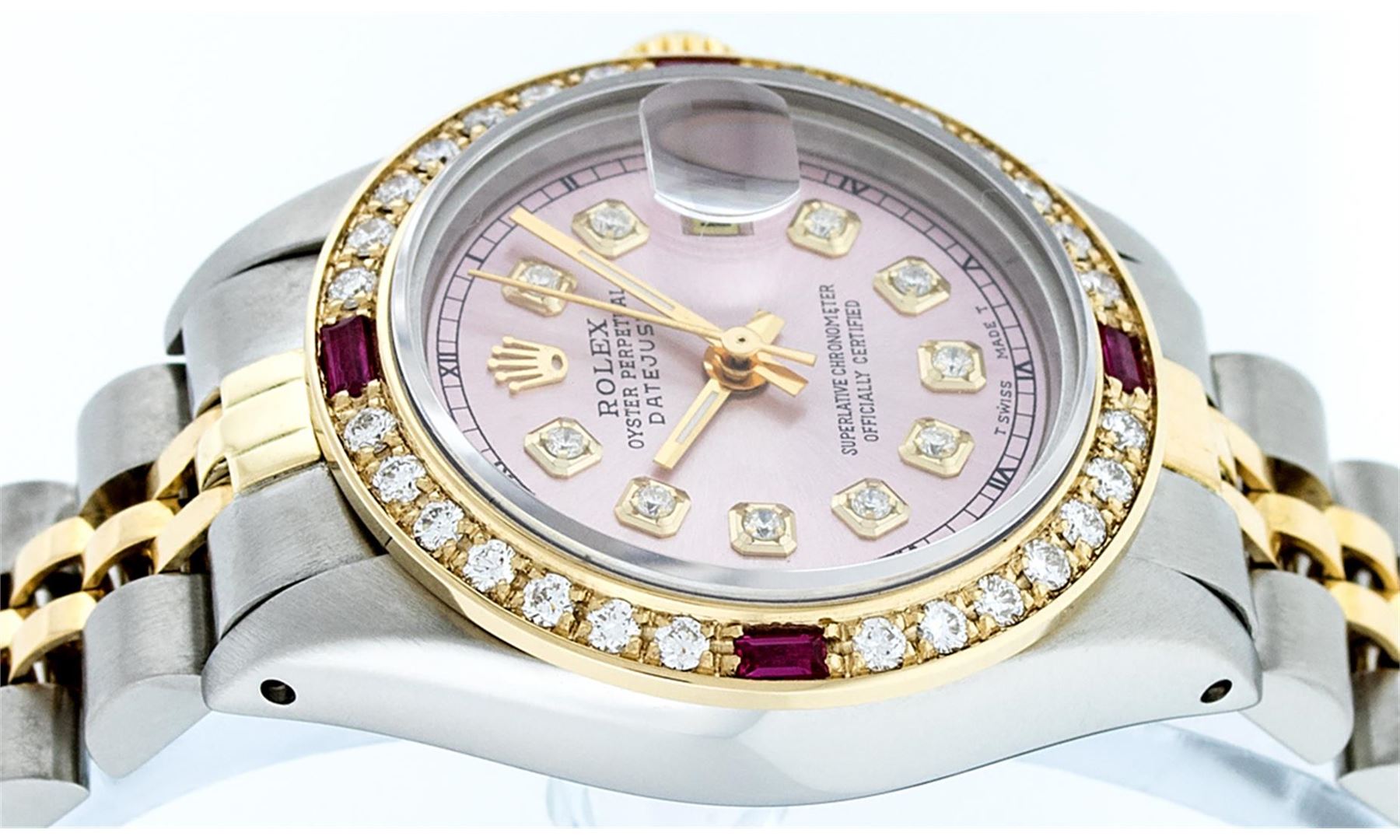 One Ladies 14K Two Tone Rolex Datejust Polished, Serviced & Electronically Tested, 14K Yellow Gold & Stainless Steel Case: 26mm, 14K Yellow Gold Crown, Custom Bezel: New 18K Yellow Gold Ruby Beadset Diamond Bezel, Diamond + Gem Count: 28 Diamonds + 4 Rubies Total Weight .70 Carat, Clarity: Si-VS, Color: G to H. Custom Crystal: New Synthetic Sapphire Cyclops Lens. Custom Hands: New Luminescent Hands. Movement: Automatic Winding Movement Caliber 2030. Custom Dial: Ice Pink Set With Diamond Hour Markers, Diamond Count: 10 Diamond in Dial, G To H In Color, Si-VS Clarity. Date Window: 3 O'Clock Position Date Display, Model: Datejust, Condition: G-6 Extra Fine. Bracelet: Two Tone 14K Yellow Gold & Stainless Steel Jubilee. Bright Polish. 6.0 Inch Length, Adjustable. Standard Clasp, With Rolex Logo. This Watch Has Been Serviced Time Tested And Is In Excellent Condition It Is Free Of All Scratches And Dents.