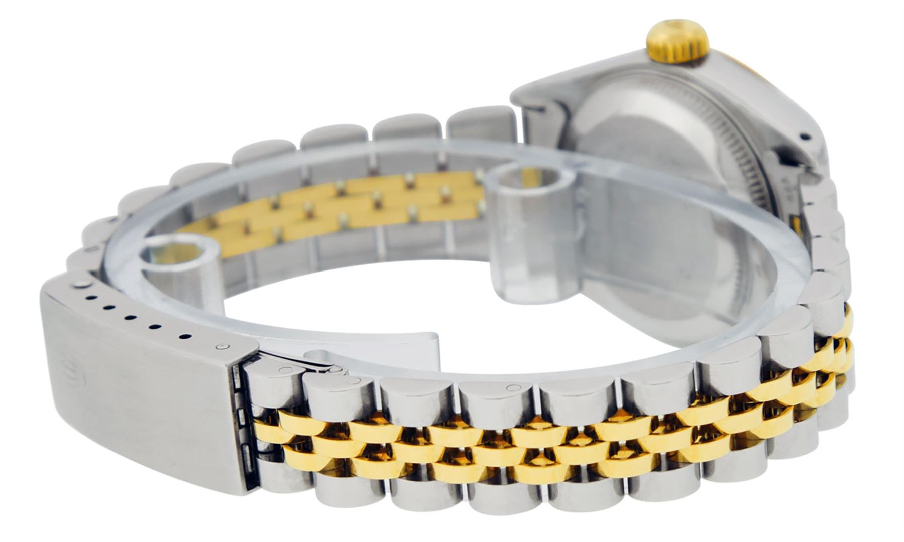 One Ladies 14K Two Tone Rolex Datejust Polished, Serviced & Electronically Tested, 14K Yellow Gold & Stainless Steel Case: 26mm, 14K Yellow Gold Crown, Bezel: 14K Yellow Gold Fluted Bezel. Custom Crystal: New Acrylic Cyclops Lens. Custom Hands: New Luminescent Hands. Movement: Automatic Winding Movement Caliber 2030. Custom Dial: Mother Of Pearl With Diamond Hour Markers, Diamond Count: 10 Diamonds In Dial, Color: G to H, Clarity: VS2-SI1. Date Window: 3 O'Clock Position Date Display, Model: Datejust. Condition: G-6 Extra Fine. Bracelet: Two Tone 14K Yellow Gold & Stainless Steel Jubilee Band. Bright Polish. 6.0 Inch Length, Adjustable. Standard Clasp, With Rolex Logo. This Watch Has Been Serviced Time Tested And Is In Excellent Condition It Is Free Of All Scratches And Dents.