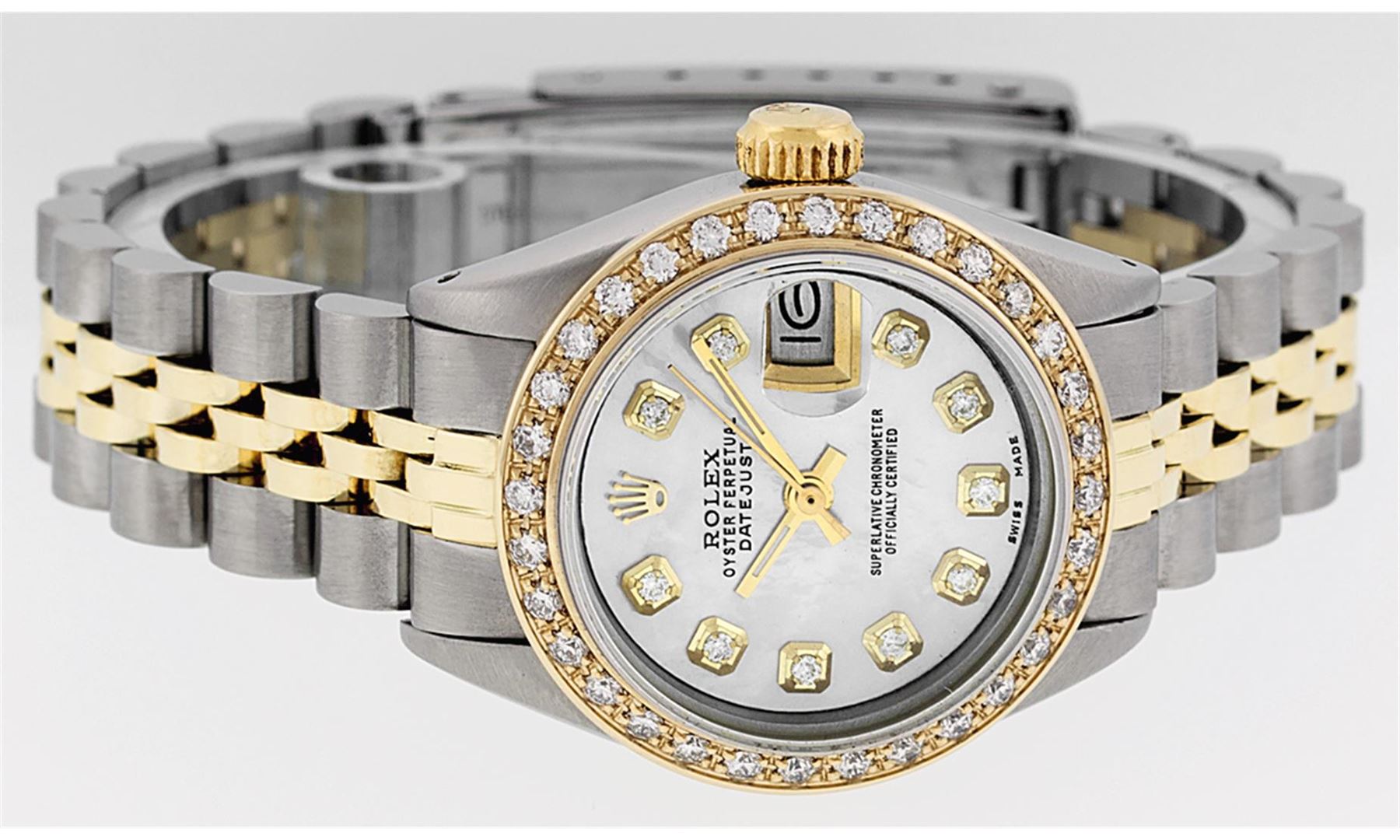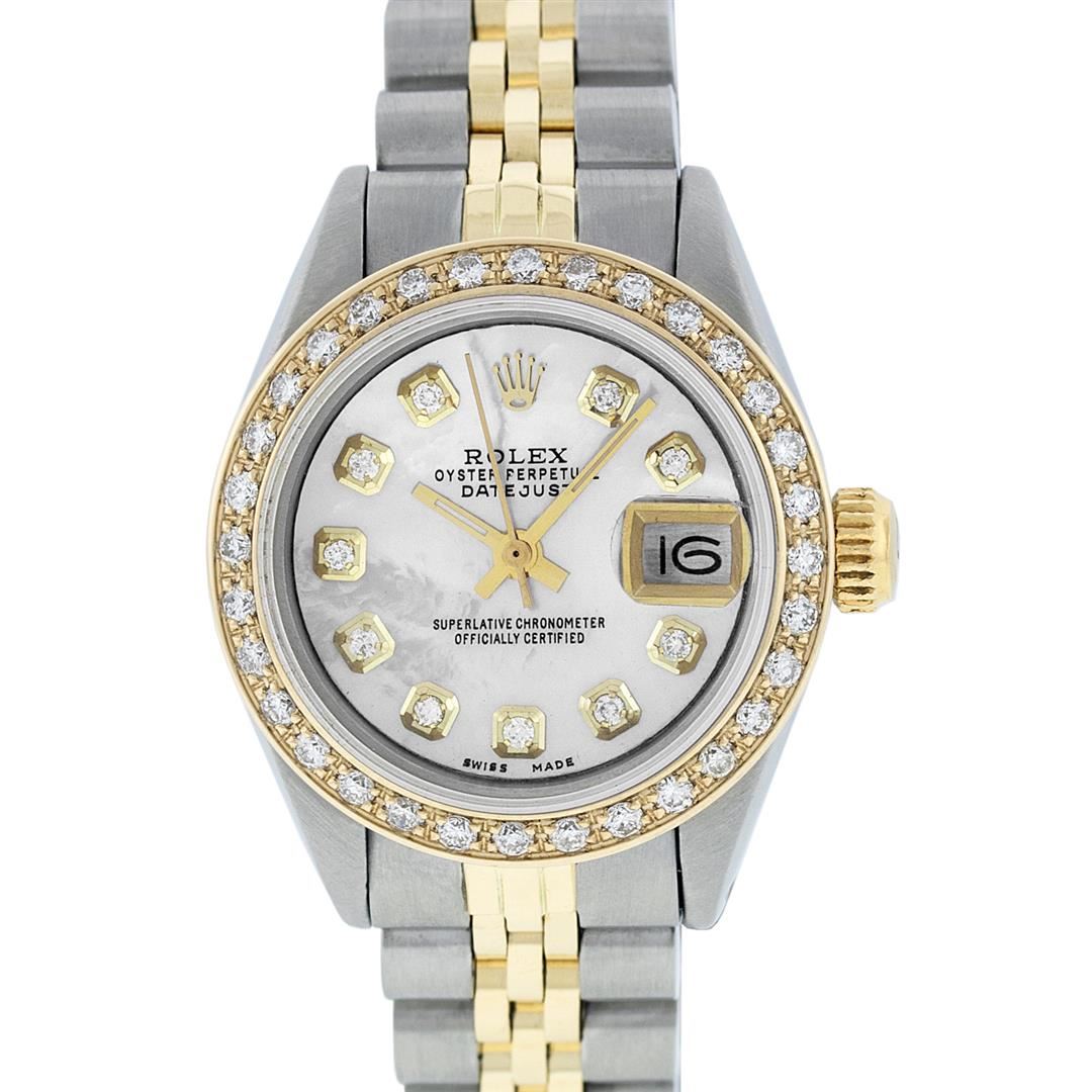 One Ladies 14K Two Tone Rolex Datejust Polished, Serviced & Electronically Tested, 14K Yellow Gold & Stainless Steel Case: 26mm, 14K Yellow Gold Crown, Custom Bezel: 18K Yellow Gold Beadset Diamond Bezel, Diamond Count: 32 Diamonds Total Weight .70 Carat, Clarity: Si-VS, Color: G to H. Custom Crystal: Synthetic Sapphire Cyclops Lens. Custom Hands: New Luminescent Hands. Movement: Automatic Winding Movement Caliber 2030. Custom Dial: Mother Of Pearl Dial Set With Diamond Hour Markers, 10 Diamond in Dial G To H In Color, SI-VS Clarity. Date Window: 3 O'Clock Position Date Display, Model: Datejust. Condition: G-6 Extra Fine. Bracelet: Two Tone 14K Yellow Gold & Stainless Steel Jubilee. Bright Polish. 6.0 Inch Length, Adjustable. Standard Clasp, With Rolex Logo. This Watch Has Been Serviced Time Tested And Is In Excellent Condition It Is Free Of All Scratches And Dents.