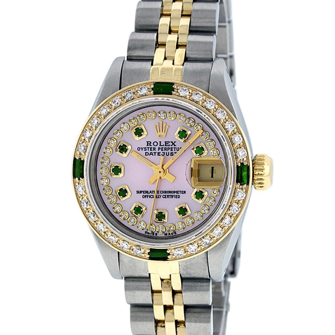 One Ladies 14K Two Tone Rolex Datejust Polished, Serviced & Electronically Tested, 14K Yellow Gold & Stainless Steel Case: 26mm, 14K Yellow Gold Crown, Custom Bezel: New 18K Yellow Gold Emerald Beadset Diamond Bezel, Diamond + Gem Count: 28 Diamonds + 4 Emeralds, Total Weight .70 Carat, Clarity: SI-VS, Color: G to H. Custom Crystal: New Synthetic Sapphire Cyclops Lens. Custom Hands: New Luminescent Hands. Movement: Automatic Winding Movement Caliber 2030. Custom Dial: Pink Mother Of Pearl Emerald String. Diamond + Stone Count: 10 Emeralds + 33 Diamonds, Color: G To H, Clarity: SI-VS. Date Window: 3 O'Clock Position Date Display, Model: Datejust, Condition: G-6 Extra Fine. Bracelet: Two Tone 14K Yellow Gold & Stainless Steel Jubilee. Bright Polish. 6.0 Inch Length, Adjustable. Standard Clasp, With Rolex Logo. This Watch Has Been Serviced Time Tested And Is In Excellent Condition It Is Free Of All Scratches And Dents.