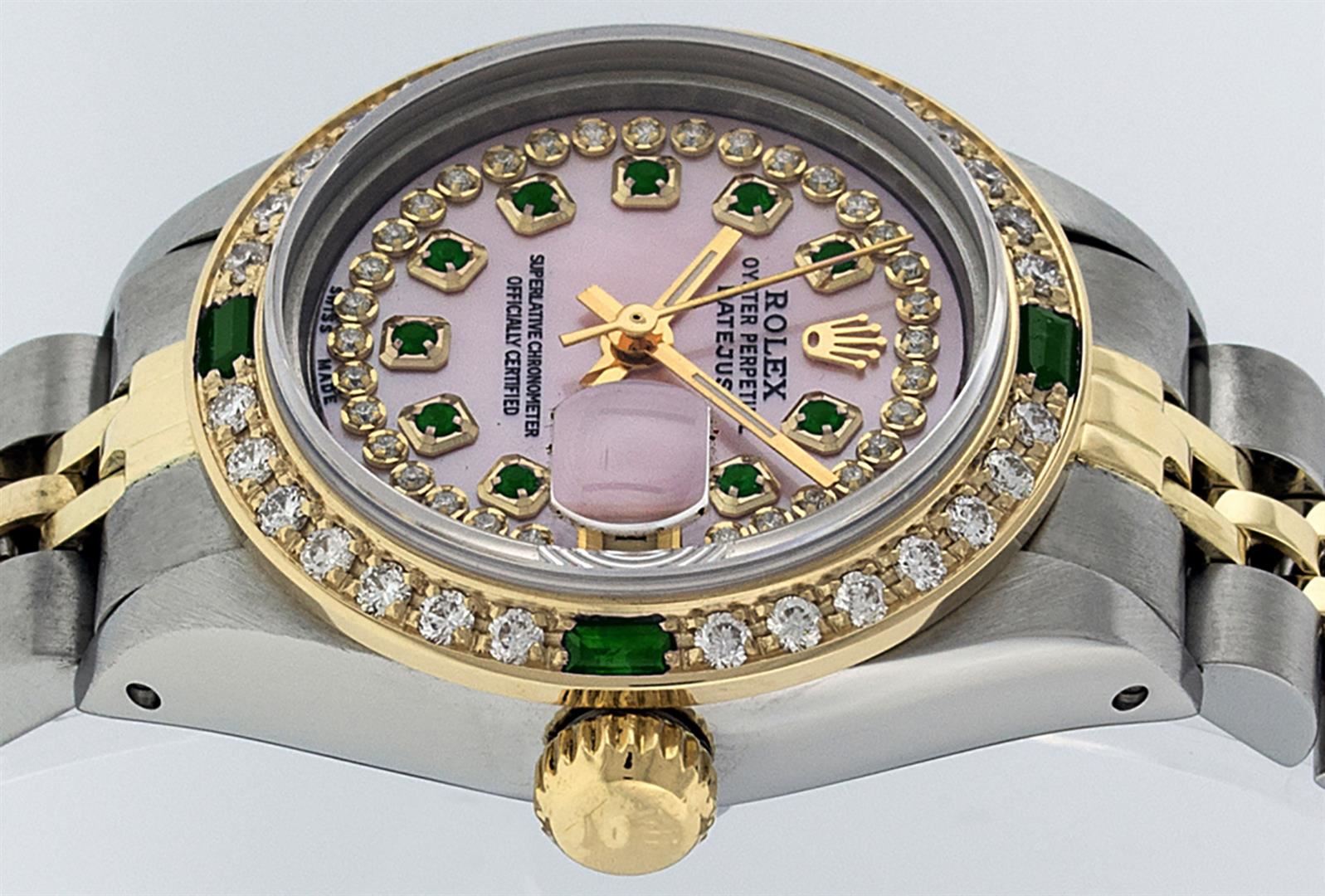 One Ladies 14K Two Tone Rolex Datejust Polished, Serviced & Electronically Tested, 14K Yellow Gold & Stainless Steel Case: 26mm, 14K Yellow Gold Crown, Custom Bezel: New 18K Yellow Gold Emerald Beadset Diamond Bezel, Diamond + Gem Count: 28 Diamonds + 4 Emeralds, Total Weight .70 Carat, Clarity: SI-VS, Color: G to H. Custom Crystal: New Synthetic Sapphire Cyclops Lens. Custom Hands: New Luminescent Hands. Movement: Automatic Winding Movement Caliber 2030. Custom Dial: Pink Mother Of Pearl Emerald String. Diamond + Stone Count: 10 Emeralds + 33 Diamonds, Color: G To H, Clarity: SI-VS. Date Window: 3 O'Clock Position Date Display, Model: Datejust, Condition: G-6 Extra Fine. Bracelet: Two Tone 14K Yellow Gold & Stainless Steel Jubilee. Bright Polish. 6.0 Inch Length, Adjustable. Standard Clasp, With Rolex Logo. This Watch Has Been Serviced Time Tested And Is In Excellent Condition It Is Free Of All Scratches And Dents.