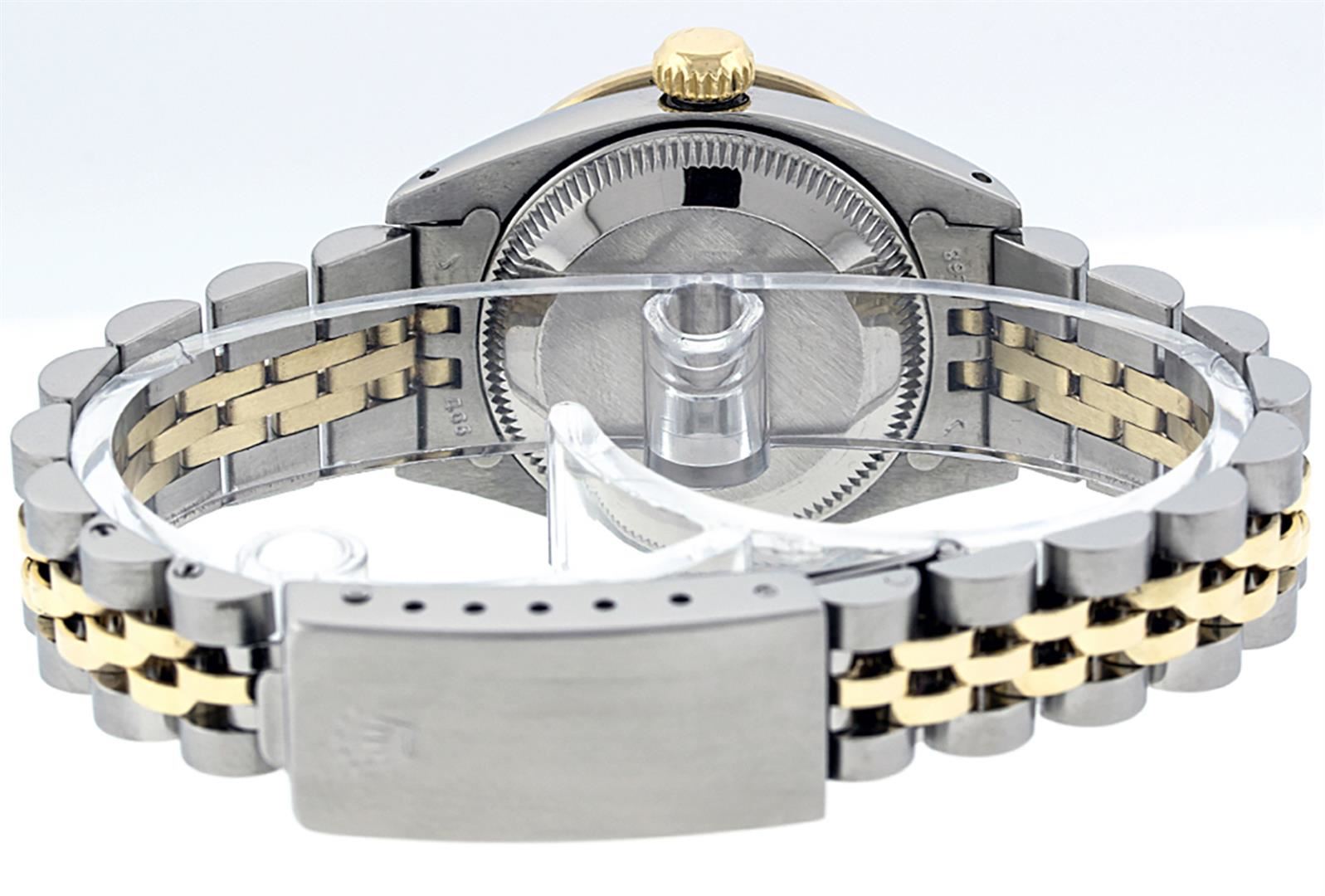 One Ladies 14K Two Tone Rolex Datejust Polished, Serviced & Electronically Tested, 14K Yellow Gold & Stainless Steel Case: 26mm, 14K Yellow Gold Crown, Custom Bezel: New 18K Yellow Gold Emerald Beadset Diamond Bezel, Diamond + Gem Count: 28 Diamonds + 4 Emeralds, Total Weight .70 Carat, Clarity: SI-VS, Color: G to H. Custom Crystal: New Synthetic Sapphire Cyclops Lens. Custom Hands: New Luminescent Hands. Movement: Automatic Winding Movement Caliber 2030. Custom Dial: Pink Mother Of Pearl Emerald String. Diamond + Stone Count: 10 Emeralds + 33 Diamonds, Color: G To H, Clarity: SI-VS. Date Window: 3 O'Clock Position Date Display, Model: Datejust, Condition: G-6 Extra Fine. Bracelet: Two Tone 14K Yellow Gold & Stainless Steel Jubilee. Bright Polish. 6.0 Inch Length, Adjustable. Standard Clasp, With Rolex Logo. This Watch Has Been Serviced Time Tested And Is In Excellent Condition It Is Free Of All Scratches And Dents.