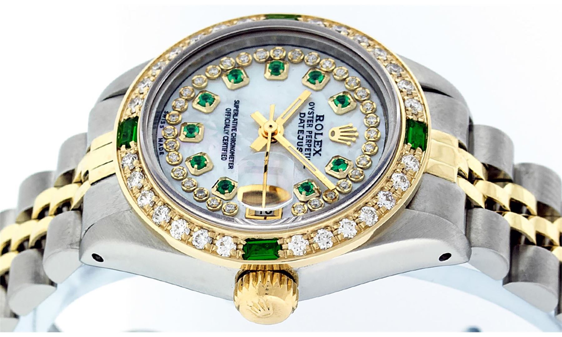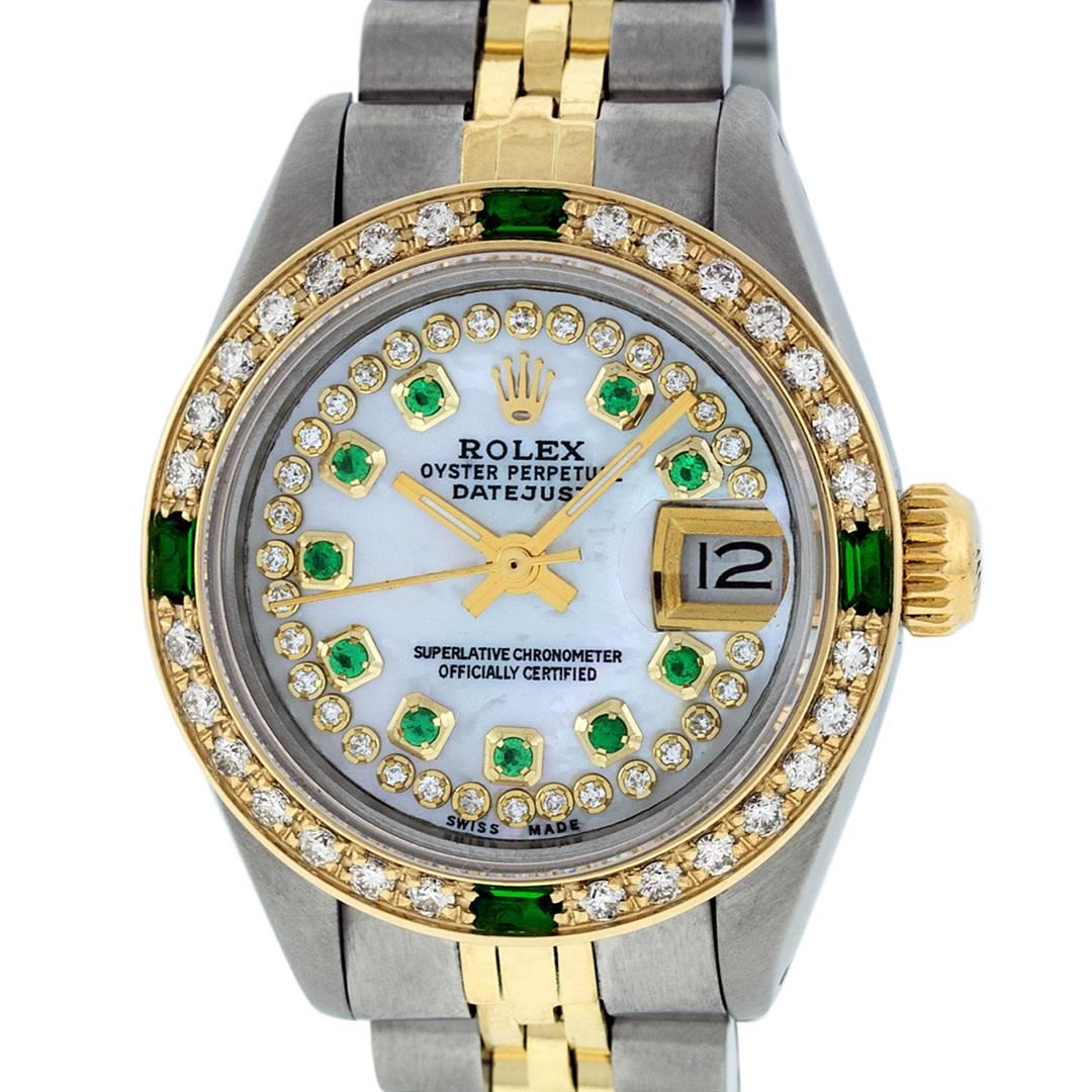 One Ladies 14K Two Tone Rolex Datejust Polished, Serviced & Electronically Tested, 14K Yellow Gold & Stainless Steel Case: 26mm, 14K Yellow Gold Crown, Custom Bezel: New 18K Yellow Gold Emerald Beadset Diamond Bezel, Diamond Count: 28 Diamonds + 4 Emeralds . Total Weight .70 Carat, Clarity: SI-VS, Color: G to H. Custom Crystal: New Synthetic Sapphire Cyclops Lens. Custom Hands: New Luminescent Hands. Movement: Automatic Winding Movement Caliber 2030. Custom Dial: Mother Of Pearl With Diamond String Emerald Hour Markers. 10 Emeralds + 33 Diamonds In Dial, Clarity: SI-VS, Color: G to H. Date Window: 3 O'clock Position Date Display, Model: Datejust. Condition: G-6 Extra Fine. Bracelet: Two Tone 14K Yellow Gold & Stainless Steel Jubilee. Bright Polish. 6.0 Inch Length, Adjustable. Standard Clasp, With Rolex Logo. This Watch Has Been Serviced Time Tested And Is In Excellent Condition It Is Free Of All Scratches And Dents.
