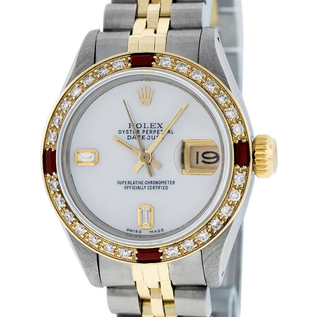 One Ladies 14K Two Tone Rolex Datejust Polished, Serviced & Electronically Tested, 14K Yellow Gold & Stainless Steel Case: 26mm, 14K Yellow Gold Crown, Custom Bezel: New 18K Yellow Gold Ruby Beadset Diamond Bezel, Diamond Count: 28 Diamonds + 4 Rubies In Bezel. Total Bezel Weight .70 Carat, Clarity: SI-VS, Color: G to H. Custom Crystal: New Scratch Resistant Synthetic Sapphire Cyclops Lens. Custom Hands: New Luminescent Hands. Movement: Automatic Winding Movement Caliber 2030. Custom Dial: Mother Of Pearl With Baguette Diamonds, Stone Count: 2 Baguettes. Date Window: 3 O'Clock Position Date Display, Model: Datejust. Condition: G-6 Extra Fine. Bracelet: Two Tone 14K Yellow Gold & Stainless Steel Jubilee Band. Bright Polish. 6.0 Inch Length, Adjustable. Standard Clasp, With Rolex Logo. This Watch Has Been Serviced Time Tested And Is In Excellent Condition It Is Free Of All Scratches And Dents.