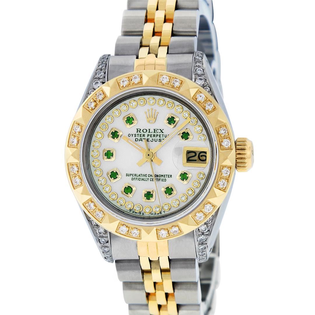 One Ladies 14K Two Tone Rolex Datejust Polished, Serviced & Electronically Tested, 14K Yellow Gold & Stainless Steel Case: 26mm, 14K Yellow Gold Crown, Diamond Lugs: 24 Diamonds On Lugs, Clarity: SI-VS, Color: G to H, Clarity SI-VS. Custom Bezel: New 18K Yellow Gold Pyramid Diamond Bezel, Diamond Count: 24 Diamonds On Bezel, Total Bezel Weight .50 Carat, Clarity: SI-VS, Color: G to H. Custom Crystal: New Scratch Resistant Sapphire Cyclops Lens. Custom Hands: New Luminescent Hands. Movement: Automatic Winding Movement Caliber 2030. Custom Dial: Mother Of Pearl With Emerald Hour Markers, Stone Count: 10 Emeralds + 33 Diamonds In Dial, Clarity: SI-VS, Color: G to H. Date Window: 3 O'Clock Position Date Display, Model: Datejust. Condition: G-6 Extra Fine. Bracelet: Two Tone 14K Yellow Gold & Stainless Steel Jubilee. Bright Polish. 6.0 Inch Length, Adjustable. Standard Clasp, With Rolex Logo. This Watch Has Been Serviced Time Tested And Is In Excellent Condition It Is Free Of All Scratches And Dents.