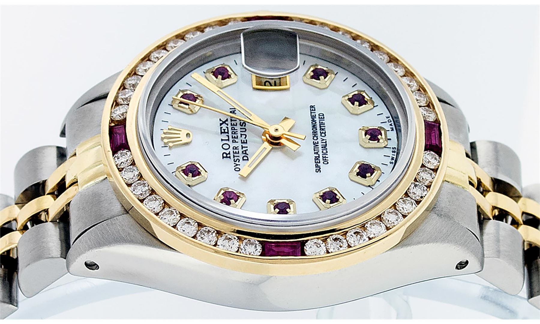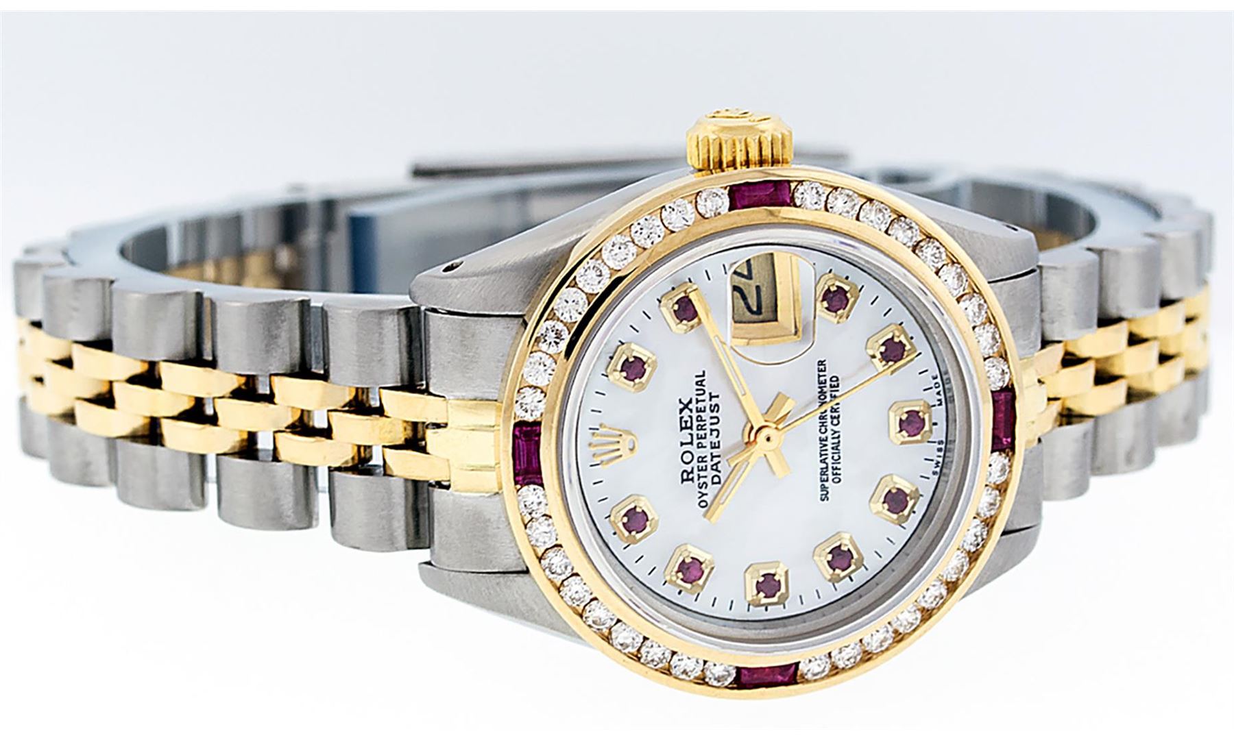 One Ladies 14K Two Tone Rolex Datejust Polished, Serviced & Electronically Tested, 14K Yellow Gold & Stainless Steel Case: 26mm, 14K Yellow Gold Crown, Custom Bezel: New 18K Yellow Gold Ruby Channel Set Diamond Bezel, Diamond + Gem Count: 36 Diamonds + 4 Rubies Total Weight 1.00 Carat, Clarity: SI-VS, Color: G to H. Custom Crystal: New Synthetic Sapphire Cyclops Lens. Custom Hands: New Luminescent Hands. Movement: Automatic Winding Movement Caliber 2030. Custom Dial: Mother Of Pearl with Ruby Hour Markers, Stone Count: 10 Rubies In Dial. Date Window: 3 O'clock Position Date Display, Model: Datejust, Condition: G-6 Extra Fine. Bracelet: Two Tone 14K Yellow Gold & Stainless Steel Jubilee. Bright Polish. 6.0 Inch Length, Adjustable. Standard Clasp, With Rolex Logo. This Watch Has Been Serviced Time Tested And Is In Excellent Condition It Is Free Of All Scratches And Dents.