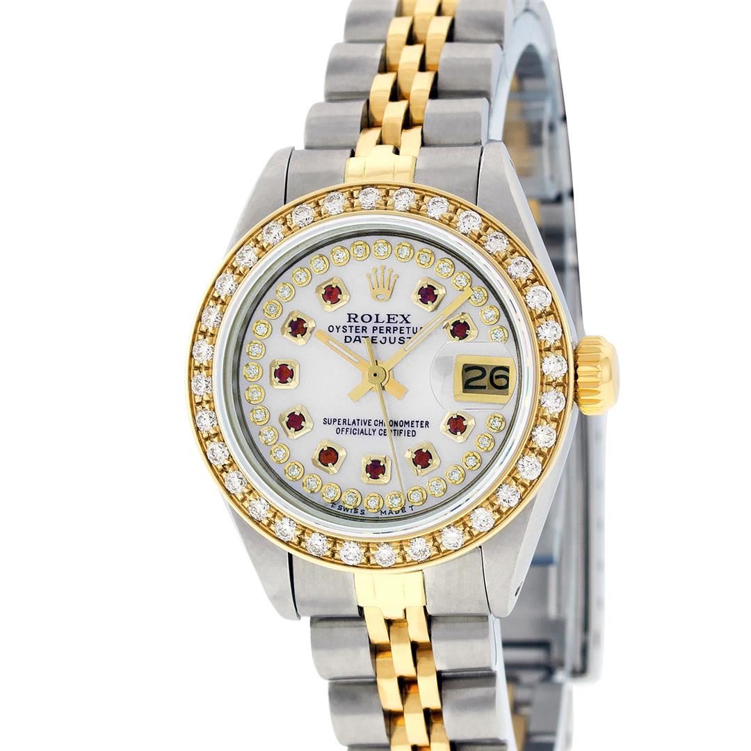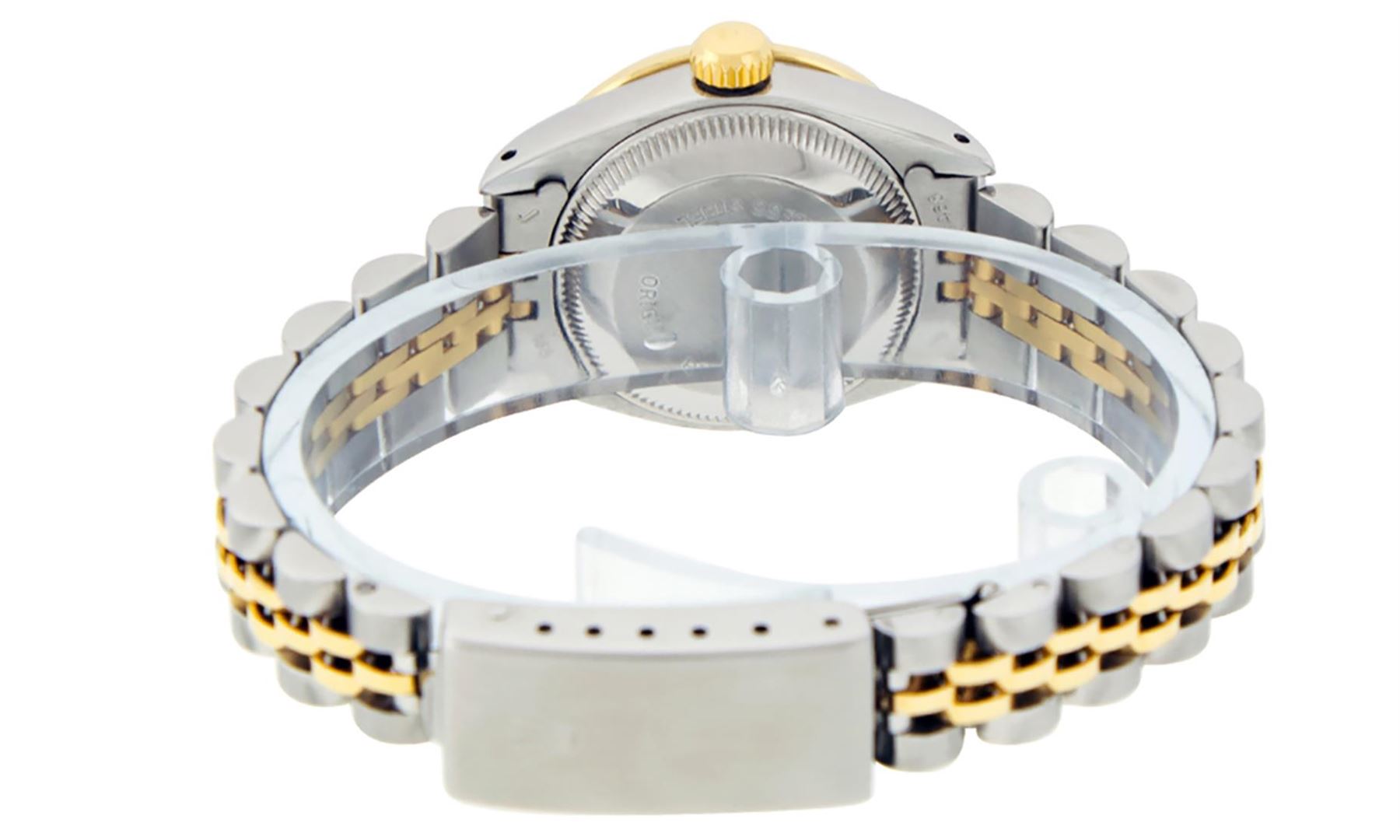 One Ladies 14K Two Tone Rolex Datejust Polished, Serviced & Electronically Tested, 14K Yellow Gold & Stainless Steel Case: 26mm, 14K Yellow Gold Crown, Custom Bezel: New 18K Yellow Gold Beadset Diamond Bezel, Diamond Count: 32 Diamonds In Bezel, Total Weight .70 Carat, Clarity: SI-VS, Color: G to H. Custom Crystal: New Synthetic Sapphire Cyclops Lens. Custom Hands: New Luminescent Hands. Movement: Automatic Winding Movement Caliber 2030. Custom Dial: Mother Of Pearl Ruby String Diamond Dial, Stone Count: 10 Rubies + 33 Diamonds In Dial. Clarity: SI-VS, Color: G to H. Date Window: 3 O'Clock Position Date Display, Model: Datejust. Condition: G-6 Extra Fine. Bracelet: Two Tone 14K Yellow Gold & Stainless Steel Jubilee. Bright Polish. 6.0 Inch Length, Adjustable. Standard Clasp, With Rolex Logo. This Watch Has Been Serviced Time Tested And Is In Excellent Condition It Is Free Of All Scratches And Dents.