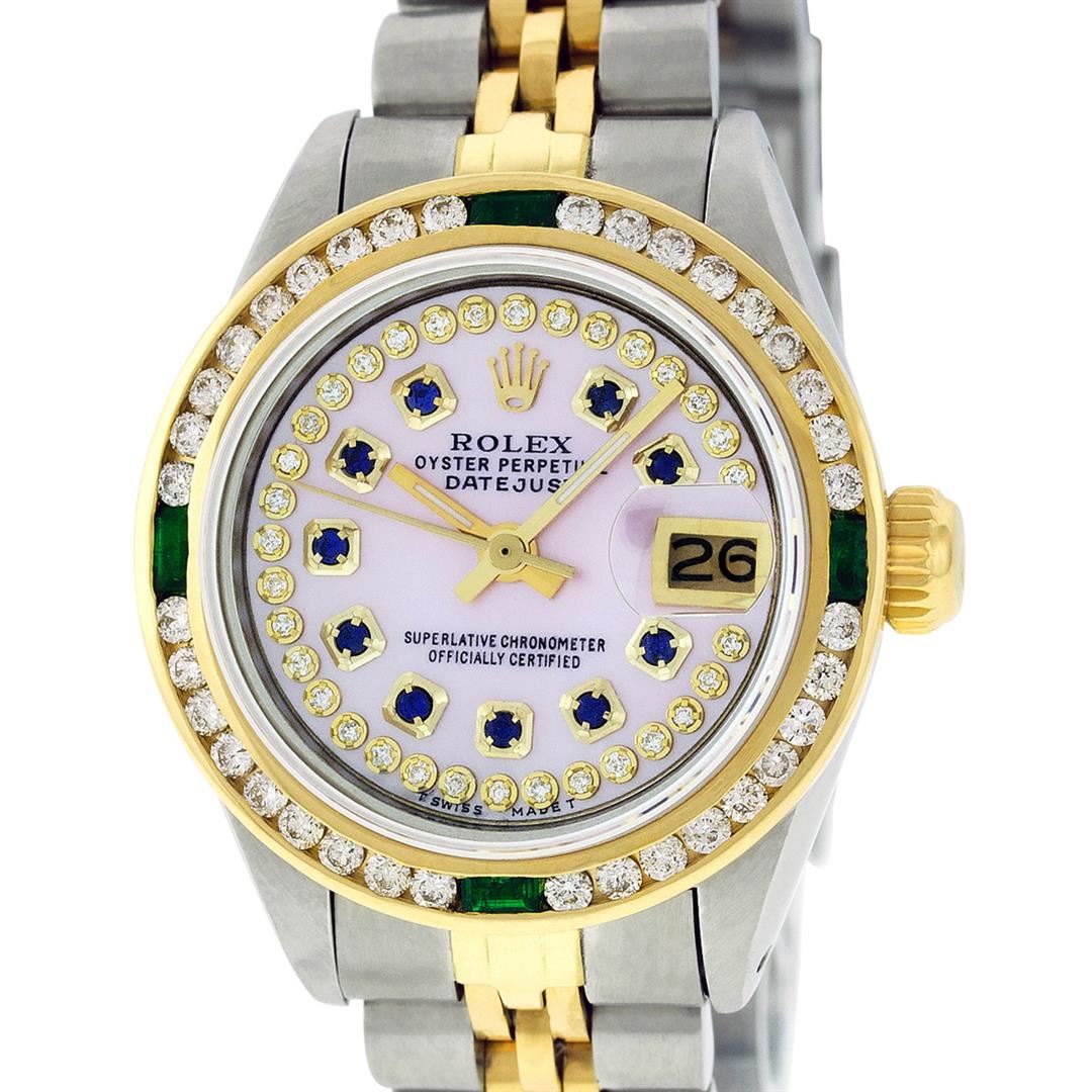 One Ladies 14K Two Tone Rolex Datejust Polished, Serviced & Electronically Tested, 14K Yellow Gold & Stainless Steel Case: 26mm, 14K Yellow Gold Crown, Custom Bezel: New 18K Yellow Gold Emerald Channel Set Diamond Bezel, Diamond + Gem Count: 36 Diamonds + 4 Emeralds, Total Weight 1.00 Carat, Clarity: SI-VS, Color: G to H. Custom Crystal: New Synthetic Sapphire Cyclops Lens. Custom Hands: New Luminescent Hands. Movement: Automatic Winding Movement Caliber 2030. Custom Dial: Pink Mother Of Pearl with Sapphire Diamond Hour Markers, Stone Count: 10 Sapphires + 33 Diamonds In Dial. Date Window: 3 O'clock Position Date Display, Model: Datejust, Condition: G-6 Extra Fine. Bracelet: Two Tone 14K Yellow Gold & Stainless Steel Jubilee. Bright Polish. 6.0 Inch Length, Adjustable. Standard Clasp, With Rolex Logo. This Watch Has Been Serviced Time Tested And Is In Excellent Condition It Is Free Of All Scratches And Dents.