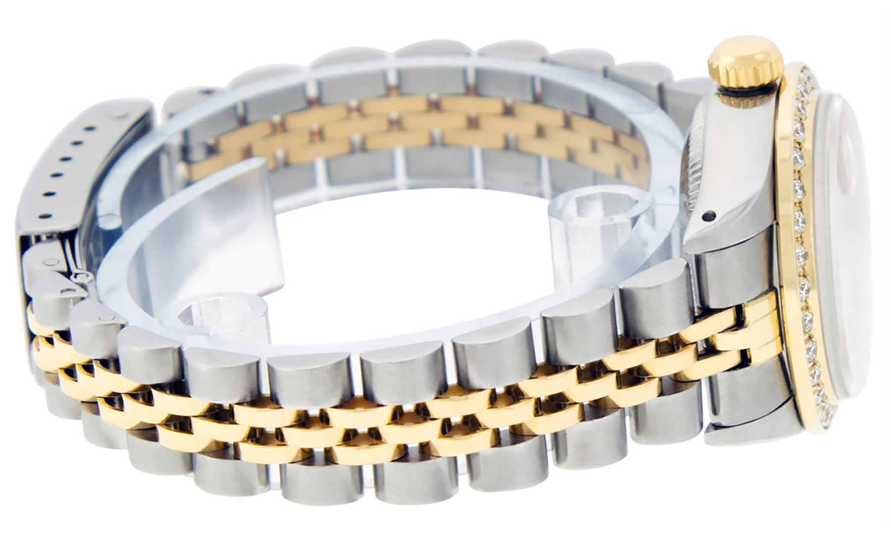One Ladies 14K Two Tone Rolex Datejust Polished, Serviced & Electronically Tested, 14K Yellow Gold & Stainless Steel Case: 26mm, 14K Yellow Gold Crown, Custom Bezel: New 18K Yellow Gold Beadset Diamond Bezel, Diamond Count: 32 Diamonds In Bezel, Total Weight .70 Carat, Clarity: SI-VS, Color: G to H. Custom Crystal: New Synthetic Sapphire Cyclops Lens. Custom Hands: New Luminescent Hands. Movement: Automatic Winding Movement Caliber 2030. Custom Dial: Mother Of Pearl Sapphire String Diamond Dial, Stone Count: 10 Sapphires + 33 Diamonds In Dial. Clarity: SI-VS, Color: G to H. Date Window: 3 O'Clock Position Date Display, Model: Datejust. Condition: G-6 Extra Fine. Bracelet: Two Tone 14K Yellow Gold & Stainless Steel Jubilee. Bright Polish. 6.0 Inch Length, Adjustable. Standard Clasp, With Rolex Logo. This Watch Has Been Serviced Time Tested And Is In Excellent Condition It Is Free Of All Scratches And Dents.