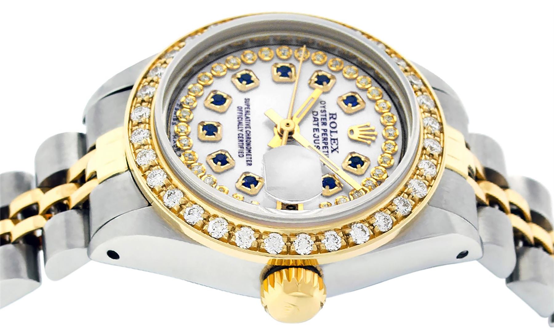 One Ladies 14K Two Tone Rolex Datejust Polished, Serviced & Electronically Tested, 14K Yellow Gold & Stainless Steel Case: 26mm, 14K Yellow Gold Crown, Custom Bezel: New 18K Yellow Gold Beadset Diamond Bezel, Diamond Count: 32 Diamonds In Bezel, Total Weight .70 Carat, Clarity: SI-VS, Color: G to H. Custom Crystal: New Synthetic Sapphire Cyclops Lens. Custom Hands: New Luminescent Hands. Movement: Automatic Winding Movement Caliber 2030. Custom Dial: Mother Of Pearl Sapphire String Diamond Dial, Stone Count: 10 Sapphires + 33 Diamonds In Dial. Clarity: SI-VS, Color: G to H. Date Window: 3 O'Clock Position Date Display, Model: Datejust. Condition: G-6 Extra Fine. Bracelet: Two Tone 14K Yellow Gold & Stainless Steel Jubilee. Bright Polish. 6.0 Inch Length, Adjustable. Standard Clasp, With Rolex Logo. This Watch Has Been Serviced Time Tested And Is In Excellent Condition It Is Free Of All Scratches And Dents.