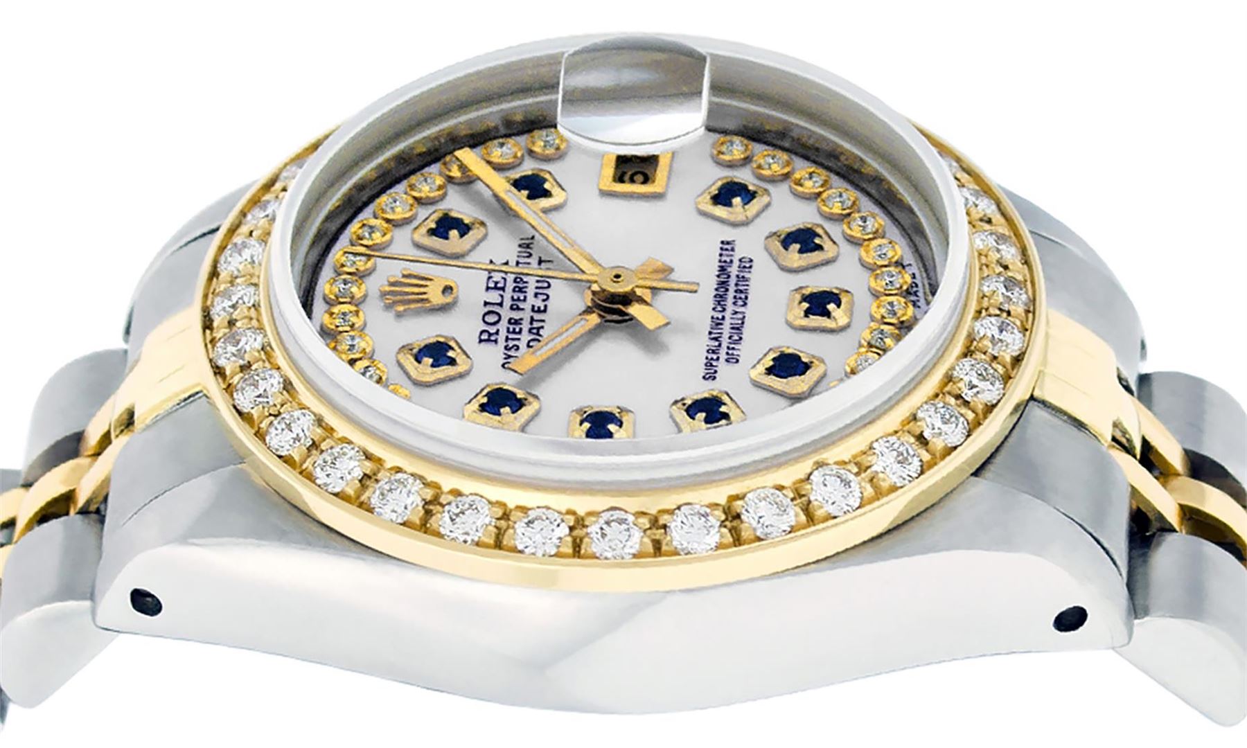 One Ladies 14K Two Tone Rolex Datejust Polished, Serviced & Electronically Tested, 14K Yellow Gold & Stainless Steel Case: 26mm, 14K Yellow Gold Crown, Custom Bezel: New 18K Yellow Gold Beadset Diamond Bezel, Diamond Count: 32 Diamonds In Bezel, Total Weight .70 Carat, Clarity: SI-VS, Color: G to H. Custom Crystal: New Synthetic Sapphire Cyclops Lens. Custom Hands: New Luminescent Hands. Movement: Automatic Winding Movement Caliber 2030. Custom Dial: Mother Of Pearl Sapphire String Diamond Dial, Stone Count: 10 Sapphires + 33 Diamonds In Dial. Clarity: SI-VS, Color: G to H. Date Window: 3 O'Clock Position Date Display, Model: Datejust. Condition: G-6 Extra Fine. Bracelet: Two Tone 14K Yellow Gold & Stainless Steel Jubilee. Bright Polish. 6.0 Inch Length, Adjustable. Standard Clasp, With Rolex Logo. This Watch Has Been Serviced Time Tested And Is In Excellent Condition It Is Free Of All Scratches And Dents.