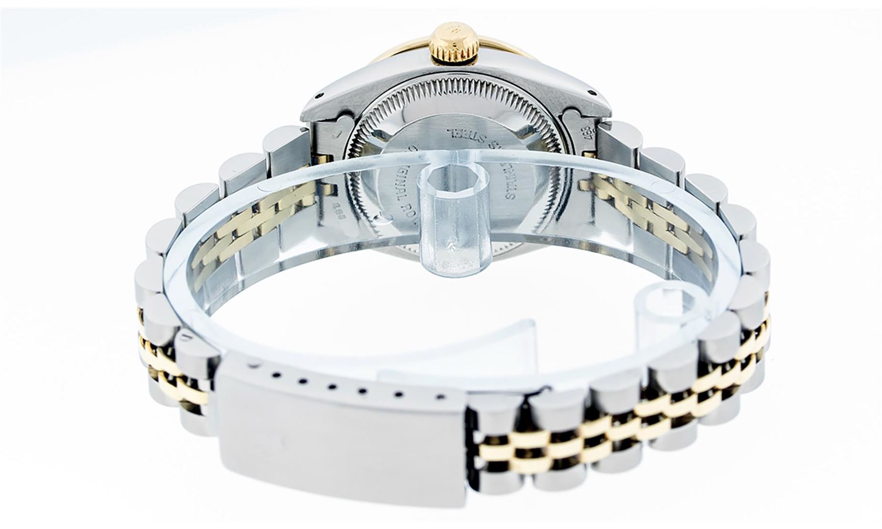 One Ladies 14K Two Tone Rolex Datejust Polished, Serviced & Electronically Tested, 14K Yellow Gold & Stainless Steel Case: 26mm, 14K Yellow Gold Crown, Custom Bezel: New 18K Yellow Gold Beadset Diamond Bezel, Diamond Count: 43 Diamonds in dial, Total Weight .70 Carat, Clarity: SI-VS, Color: G to H. Custom Crystal: New Synthetic Sapphire Cyclops Lens. Custom Hands: New Luminescent Hands. Movement: Automatic Winding Movement Caliber 2030. Custom Dial: Mother Of Pearl String Diamond Dial, Diamond Count: 43 Diamonds, Clarity: SI-VS, Color: G to H. Date Window: 3 O'clock Position Date Display, Model: Datejust. Condition: G-6 Extra Fine. Bracelet: Two Tone 14K Yellow Gold & Stainless Steel Jubilee Band. Bright Polish. 6.0 Inch Length, Adjustable. Standard Clasp, With Rolex Logo. This Watch Has Been Serviced Time Tested And Is In Excellent Condition It Is Free Of All Scratches And Dents.