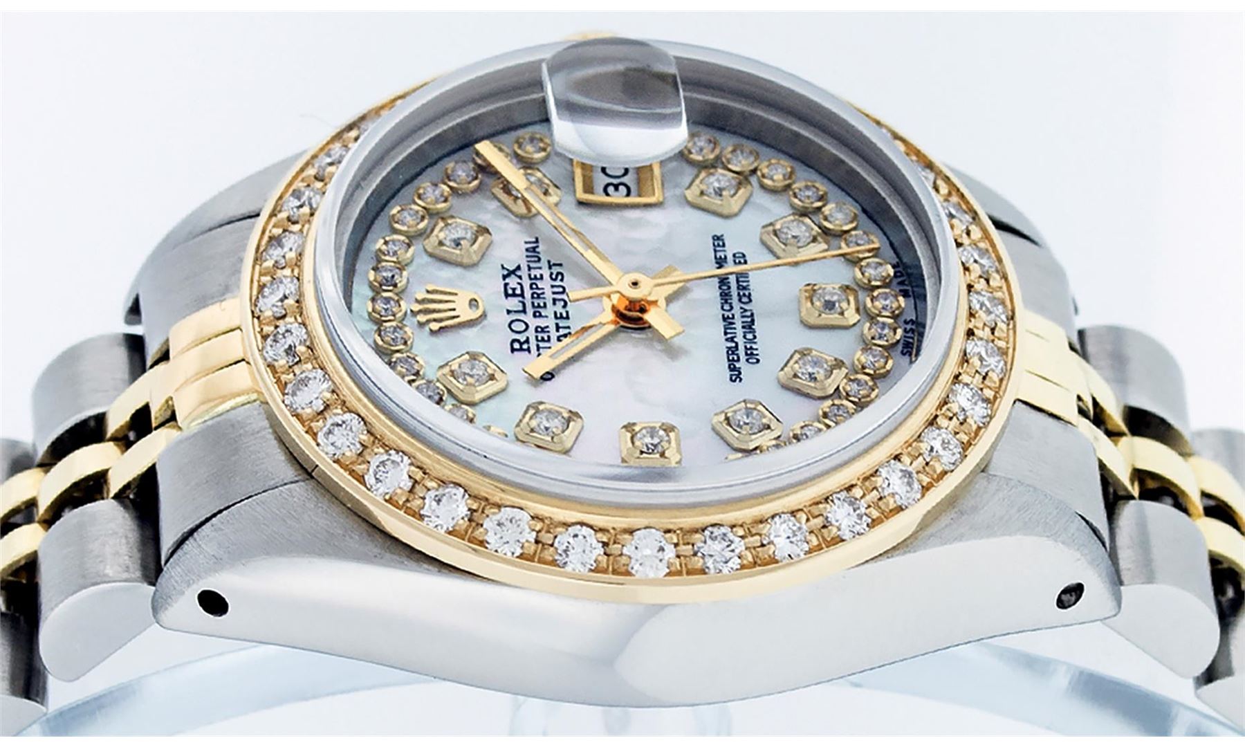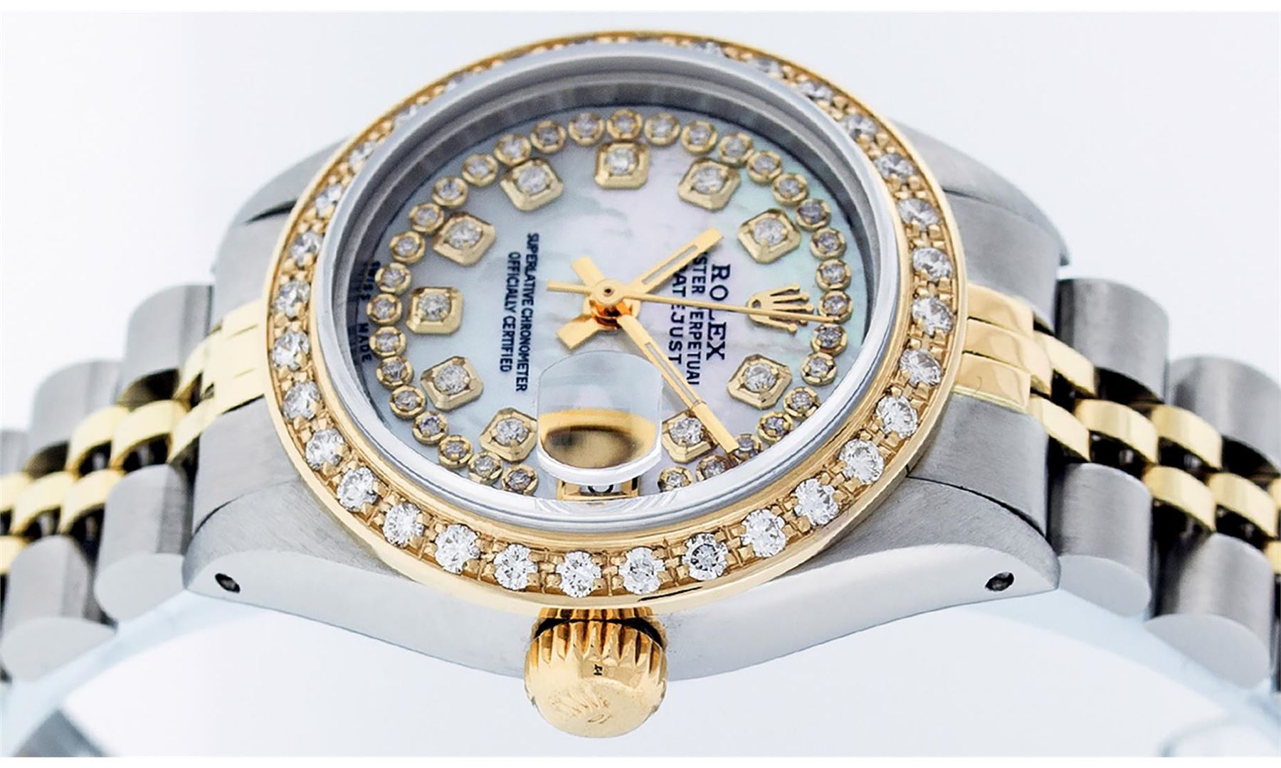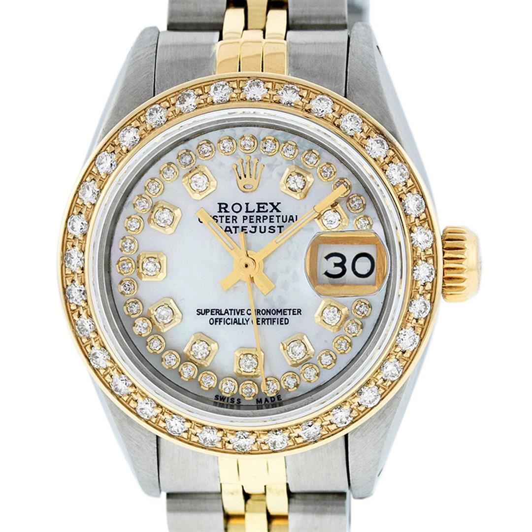 One Ladies 14K Two Tone Rolex Datejust Polished, Serviced & Electronically Tested, 14K Yellow Gold & Stainless Steel Case: 26mm, 14K Yellow Gold Crown, Custom Bezel: New 18K Yellow Gold Beadset Diamond Bezel, Diamond Count: 43 Diamonds in dial, Total Weight .70 Carat, Clarity: SI-VS, Color: G to H. Custom Crystal: New Synthetic Sapphire Cyclops Lens. Custom Hands: New Luminescent Hands. Movement: Automatic Winding Movement Caliber 2030. Custom Dial: Mother Of Pearl String Diamond Dial, Diamond Count: 43 Diamonds, Clarity: SI-VS, Color: G to H. Date Window: 3 O'clock Position Date Display, Model: Datejust. Condition: G-6 Extra Fine. Bracelet: Two Tone 14K Yellow Gold & Stainless Steel Jubilee Band. Bright Polish. 6.0 Inch Length, Adjustable. Standard Clasp, With Rolex Logo. This Watch Has Been Serviced Time Tested And Is In Excellent Condition It Is Free Of All Scratches And Dents.