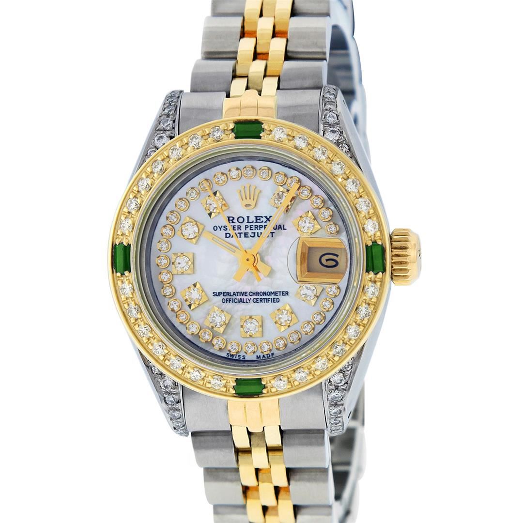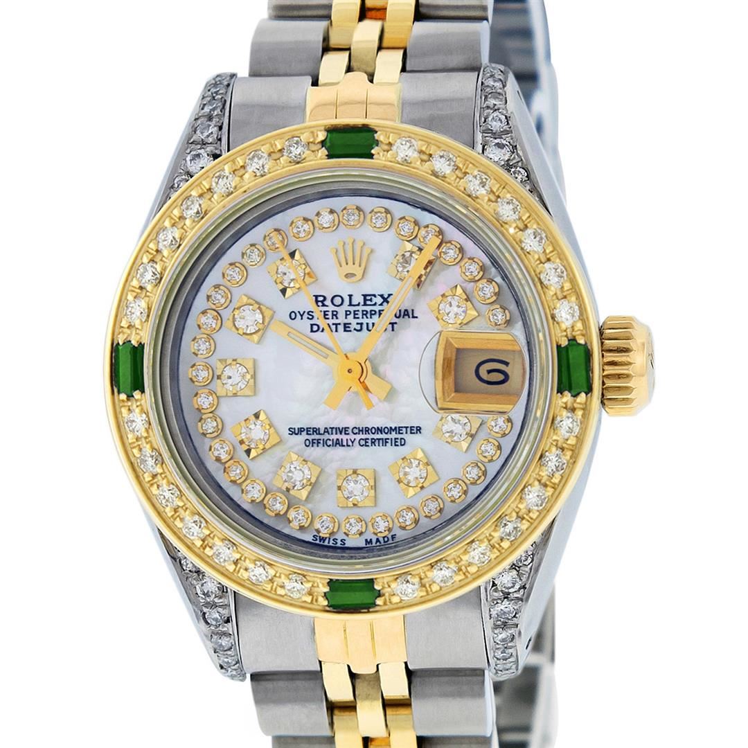 One Ladies 14K Two Tone Rolex Datejust Polished, Serviced & Electronically Tested, 14K Yellow Gold & Stainless Steel Case: 26mm, 14K Yellow Gold Crown, Diamond Lugs: 24 Diamonds On Lugs, Clarity: SI-VS, Color: G to H. Custom Bezel: New 18K Yellow Gold Emerald Beadset Diamond Bezel, Diamond Count: 28 Diamonds + 4 Emeralds On Bezel, Total Weight .70 Carat, Clarity: SI-VS, Color: G to H. Custom Crystal: New Synthetic Scratch Resistant Sapphire Cyclops Lens. Custom Hands: New Luminescent Hands. Movement: Automatic Winding Movement Caliber 2030. Custom Refinished Dial: Mother Of Pearl With String Single Cut Diamond Hour Markers, Diamond Count: 43 Diamonds On Dial, Clarity: SI-VS, Color: G to H. Date Window: 3 O'Clock Position Date Display, Model: Datejust. Condition: G-6 Extra Fine. Bracelet: Two Tone 14K Yellow Gold & Stainless Steel Jubilee Band. Bright Polish. 6.0 Inch Length, Adjustable. Standard Clasp, With Rolex Logo. This Watch Has Been Serviced Time Tested And Is In Excellent Condition It Is Free Of All Scratches And Dents.