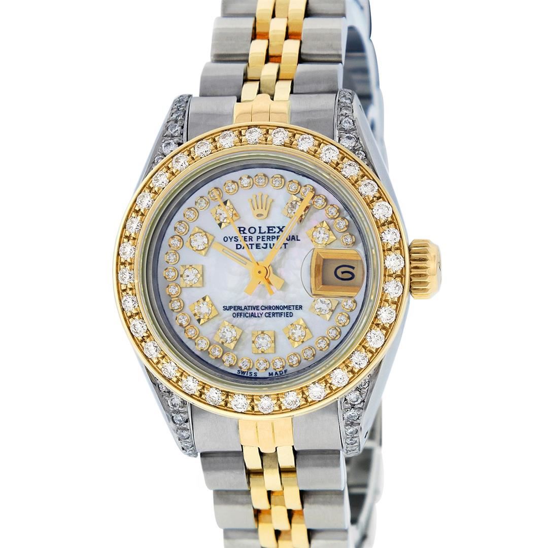 One Ladies 14K Two Tone Rolex Datejust Polished, Serviced & Electronically Tested, 14K Yellow Gold & Stainless Steel Case: 26mm, 14K Yellow Gold Crown, Diamond Lugs: 24 Diamonds On Lugs, Clarity: SI-VS, Color: G to H. Custom Bezel: New 18K Yellow Gold Beadset Diamond Bezel, Diamond Count: 32 Diamonds On Bezel, Total Weight .70 Carat, Clarity: SI-VS, Color: G to H. Custom Crystal: New Synthetic Scratch Resistant Sapphire Cyclops Lens. Custom Hands: New Luminescent Hands. Movement: Automatic Winding Movement Caliber 2030. Custom Dial: Refinished Mother Of Pearl With String Single Cut Diamond Hour Markers, Diamond Count: 43 Diamonds On Dial, Clarity: SI-VS, Color: G to H. Date Window: 3 O'Clock Position Date Display, Model: Datejust. Condition: G-6 Extra Fine. Bracelet: Two Tone 14K Yellow Gold & Stainless Steel Jubilee Band. Bright Polish. 6.0 Inch Length, Adjustable. Standard Clasp, With Rolex Logo. This Watch Has Been Serviced Time Tested And Is In Excellent Condition It Is Free Of All Scratches And Dents.