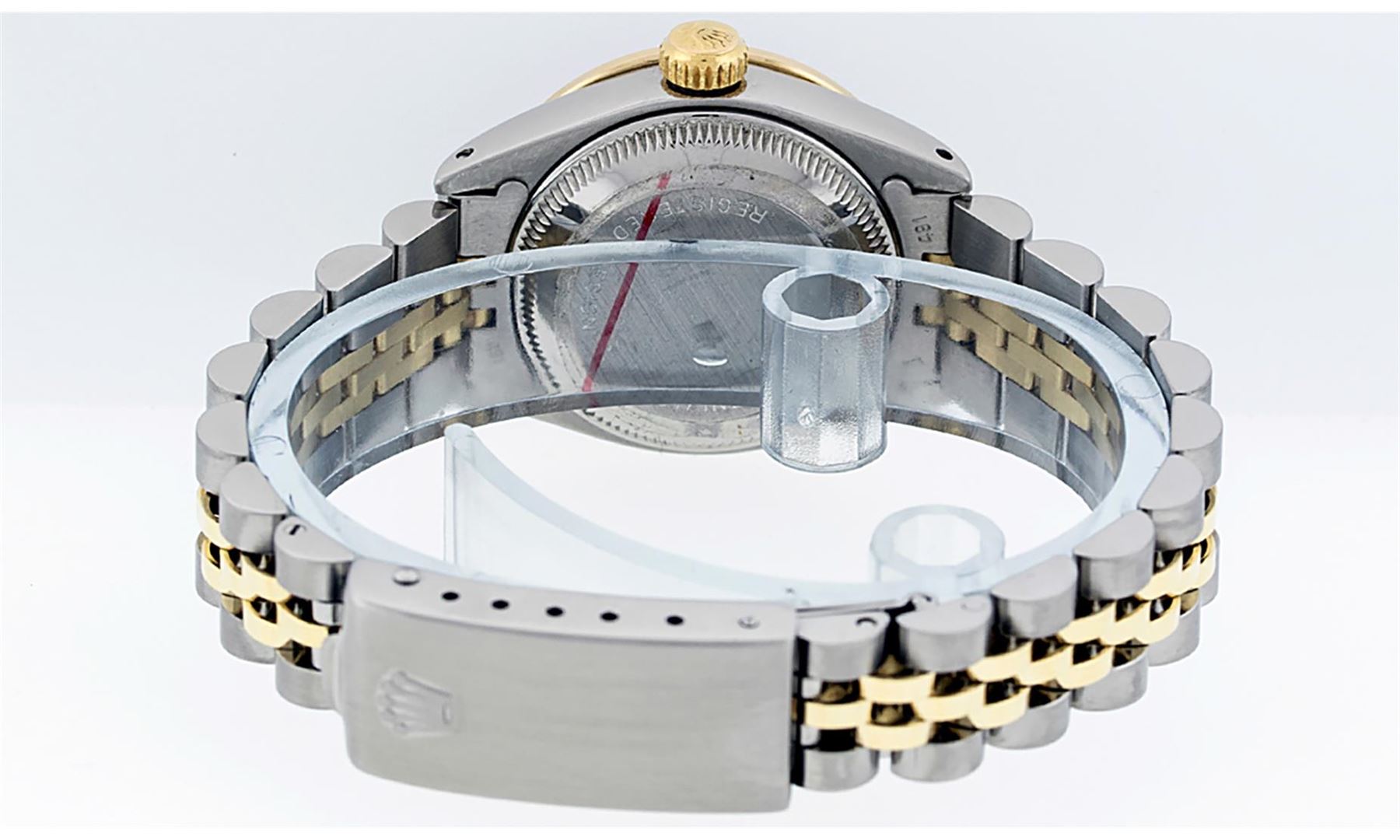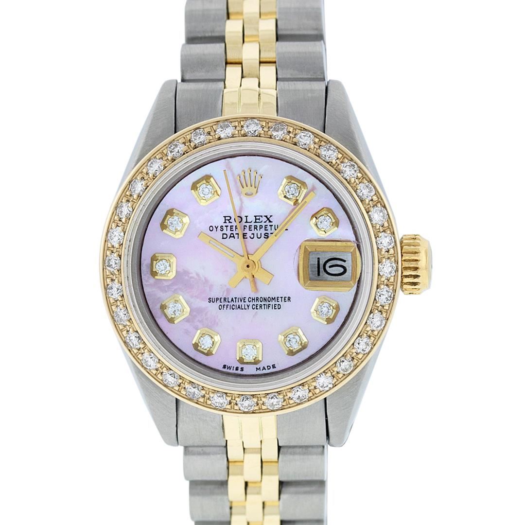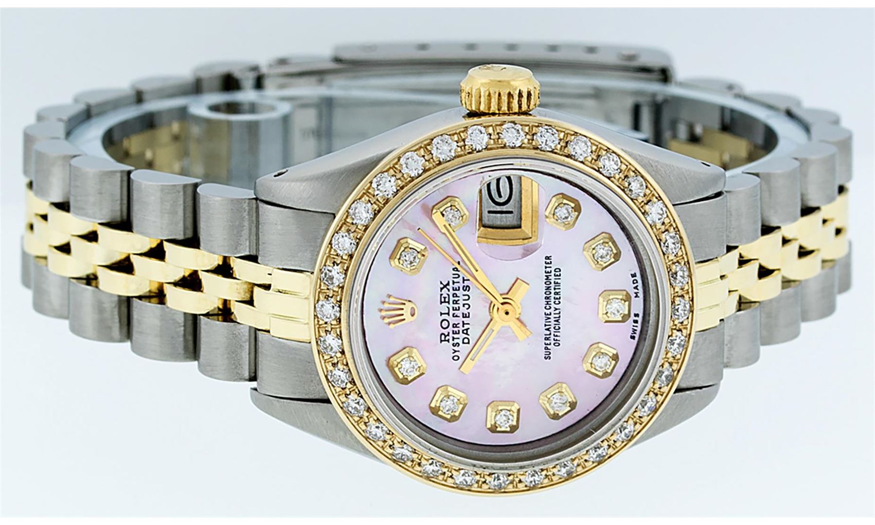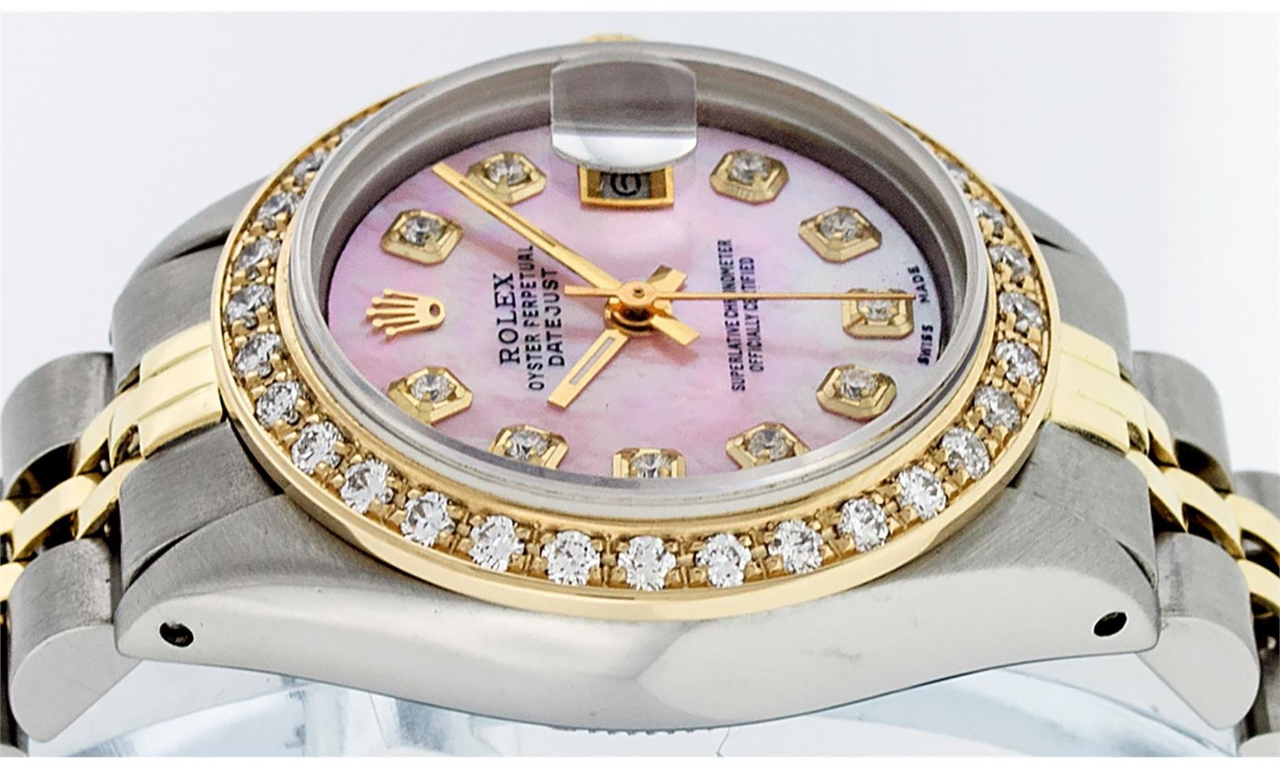 One Ladies 14K Two Tone Rolex Datejust Polished, Serviced & Electronically Tested, 14K Yellow Gold & Stainless Steel Case: 26mm, 14K Yellow Gold Crown, Custom Bezel: New 18K Yellow Gold Beadset Diamond Bezel, Diamond Count: 32 Diamonds, Total Weight .70 Carat, Clarity: SI-VS, Color: G to H. Custom Crystal: New Synthetic Sapphire Cyclops Lens. Custom Hands: New Luminescent Hands. Movement: Automatic Winding Movement Caliber 2030. Custom Dial: Pink Mother Of Pearl Diamond Dial, Diamond Count: 10 Diamonds in Dial, G To H In Color, VS Clarity. Date Window: 3 O'clock Position Date Display, Model: Datejust, Condition: G-6 Extra Fine. Bracelet: Two Tone 14K Yellow Gold & Stainless Steel Jubilee. Bright Polish. 6.0 Inch Length, Adjustable. Standard Clasp, With Rolex Logo. This Watch Has Been Serviced Time Tested And Is In Excellent Condition It Is Free Of All Scratches And Dents.
