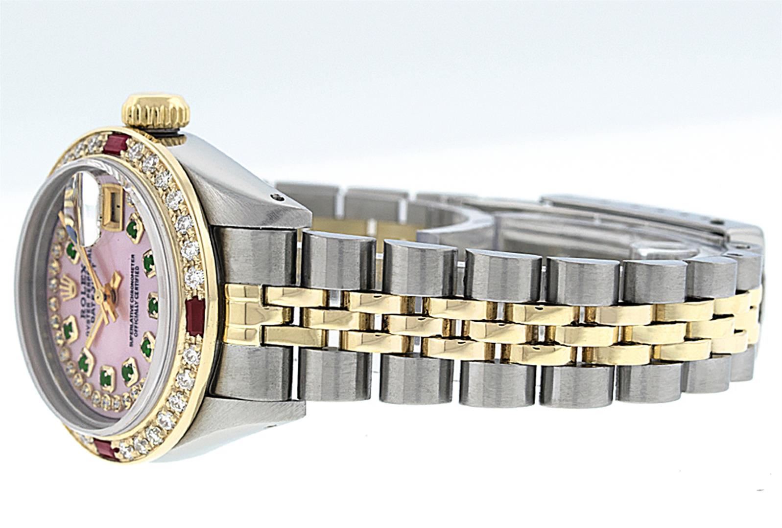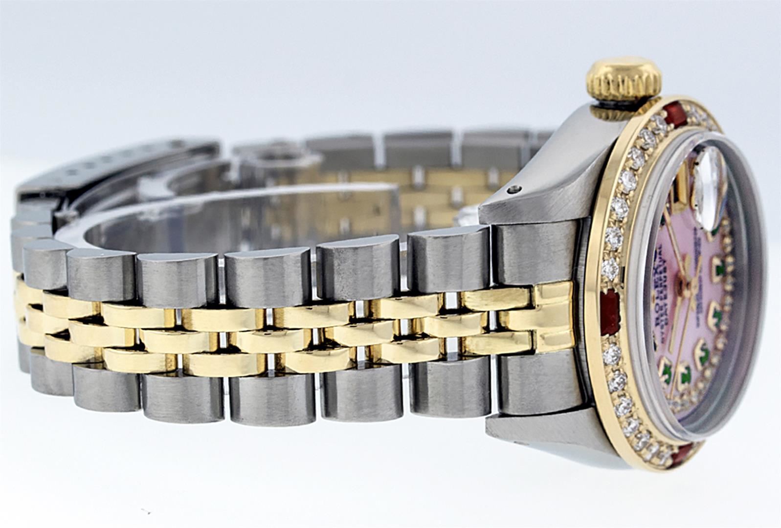 One Ladies 14K Two Tone Rolex Datejust Polished, Serviced & Electronically Tested, 14K Yellow Gold & Stainless Steel Case: 26mm, 14K Yellow Gold Crown, Custom Bezel: New 18K New Yellow Gold Ruby Beadset Diamond Bezel, Stone Count: 28 Diamonds + 4 Rubies In Dial, Total Weight .70 Carat, Clarity: SI-VS, Color: G to H. Custom Crystal: New Scratch Resistant Synthetic Sapphire Cyclops Lens. Custom Hands: New Luminescent Hands. Movement: Automatic Winding Movement Caliber 2030. Custom Dial: Pink Mother Of Pearl Emerald String Diamond Dial, Stone Count: 10 Emeralds + 33 Diamonds In Dial, Clarity: SI-VS, Color: G to H. Date Window: 3 O'Clock Position Date Display, Model: Datejust. Condition: G-6 Extra Fine. Bracelet: Two Tone 14K Yellow Gold & Stainless Steel Jubilee Band. Bright Polish. 6.0 Inch Length, Adjustable. Standard Clasp, With Rolex Logo. This Watch Has Been Serviced Time Tested And Is In Excellent Condition It Is Free Of All Scratches And Dents.