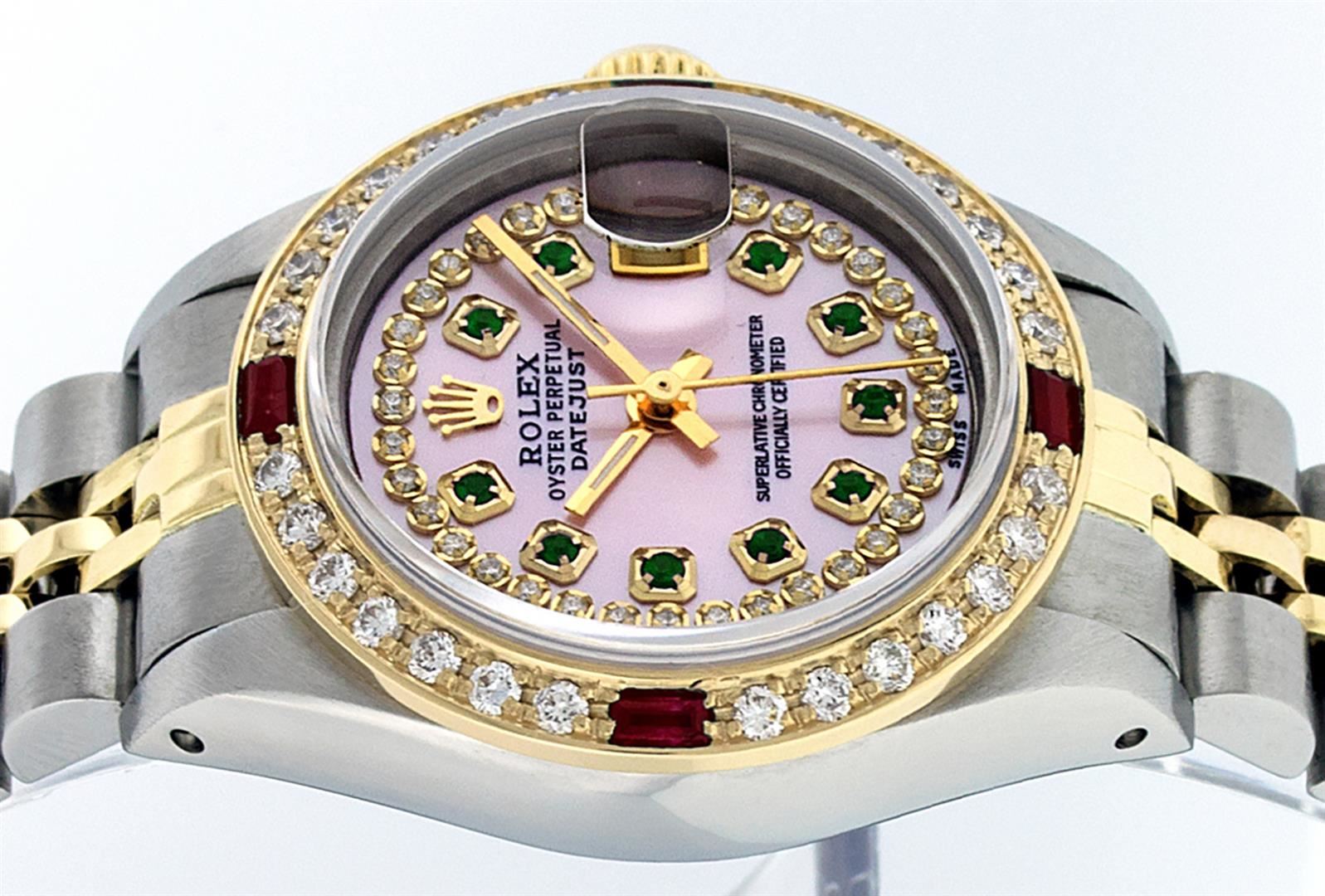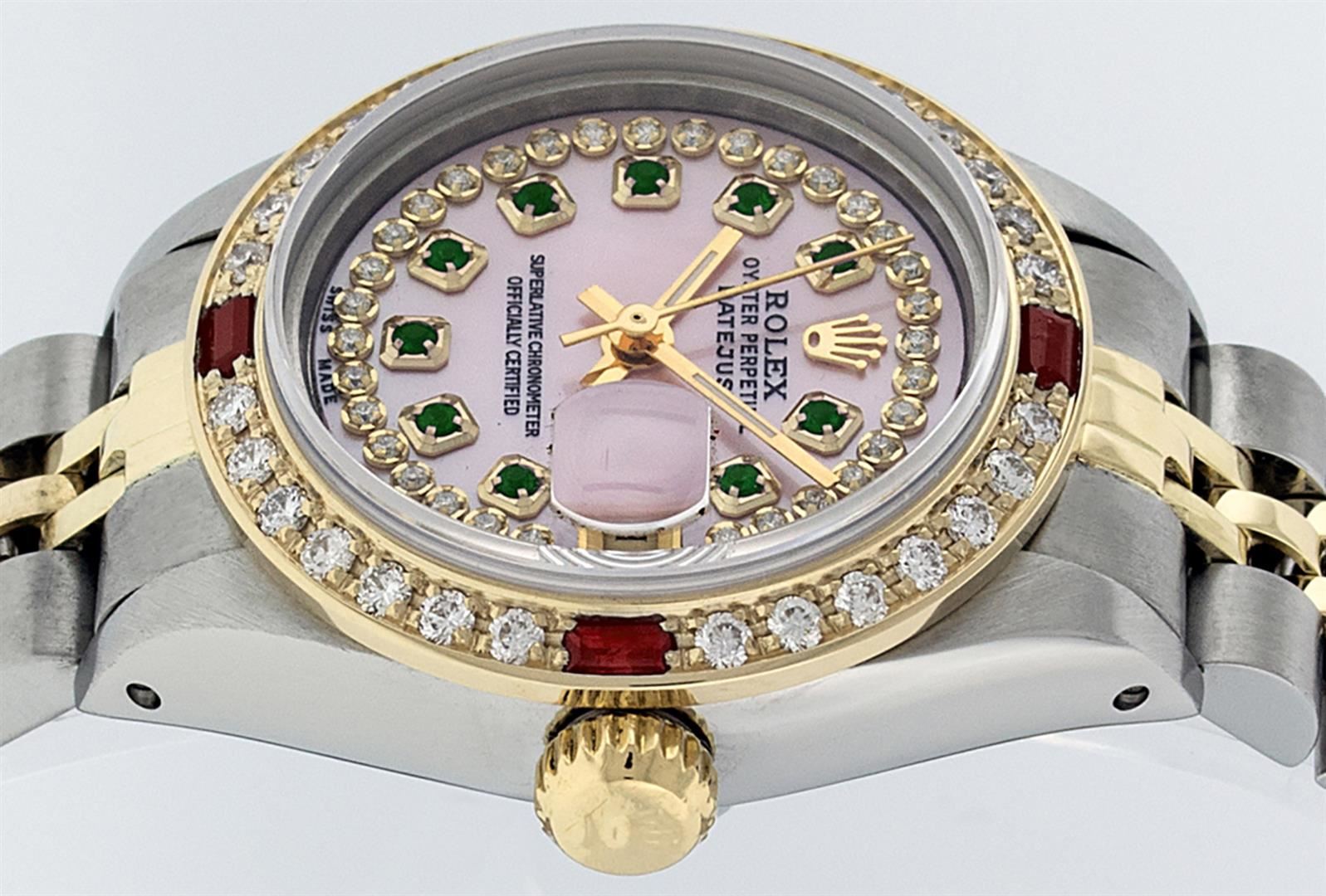 One Ladies 14K Two Tone Rolex Datejust Polished, Serviced & Electronically Tested, 14K Yellow Gold & Stainless Steel Case: 26mm, 14K Yellow Gold Crown, Custom Bezel: New 18K New Yellow Gold Ruby Beadset Diamond Bezel, Stone Count: 28 Diamonds + 4 Rubies In Dial, Total Weight .70 Carat, Clarity: SI-VS, Color: G to H. Custom Crystal: New Scratch Resistant Synthetic Sapphire Cyclops Lens. Custom Hands: New Luminescent Hands. Movement: Automatic Winding Movement Caliber 2030. Custom Dial: Pink Mother Of Pearl Emerald String Diamond Dial, Stone Count: 10 Emeralds + 33 Diamonds In Dial, Clarity: SI-VS, Color: G to H. Date Window: 3 O'Clock Position Date Display, Model: Datejust. Condition: G-6 Extra Fine. Bracelet: Two Tone 14K Yellow Gold & Stainless Steel Jubilee Band. Bright Polish. 6.0 Inch Length, Adjustable. Standard Clasp, With Rolex Logo. This Watch Has Been Serviced Time Tested And Is In Excellent Condition It Is Free Of All Scratches And Dents.